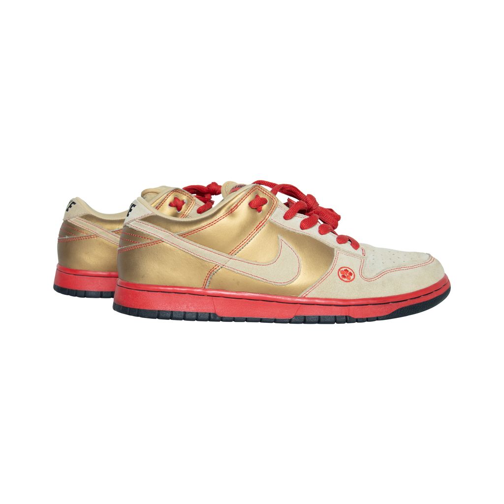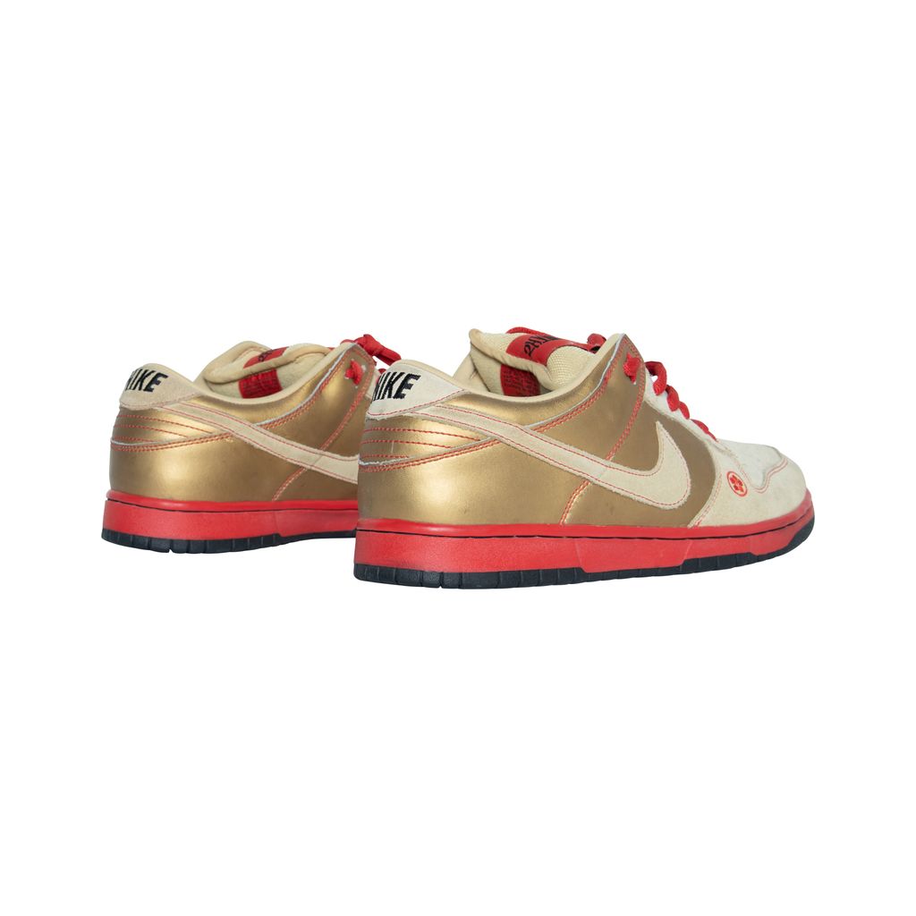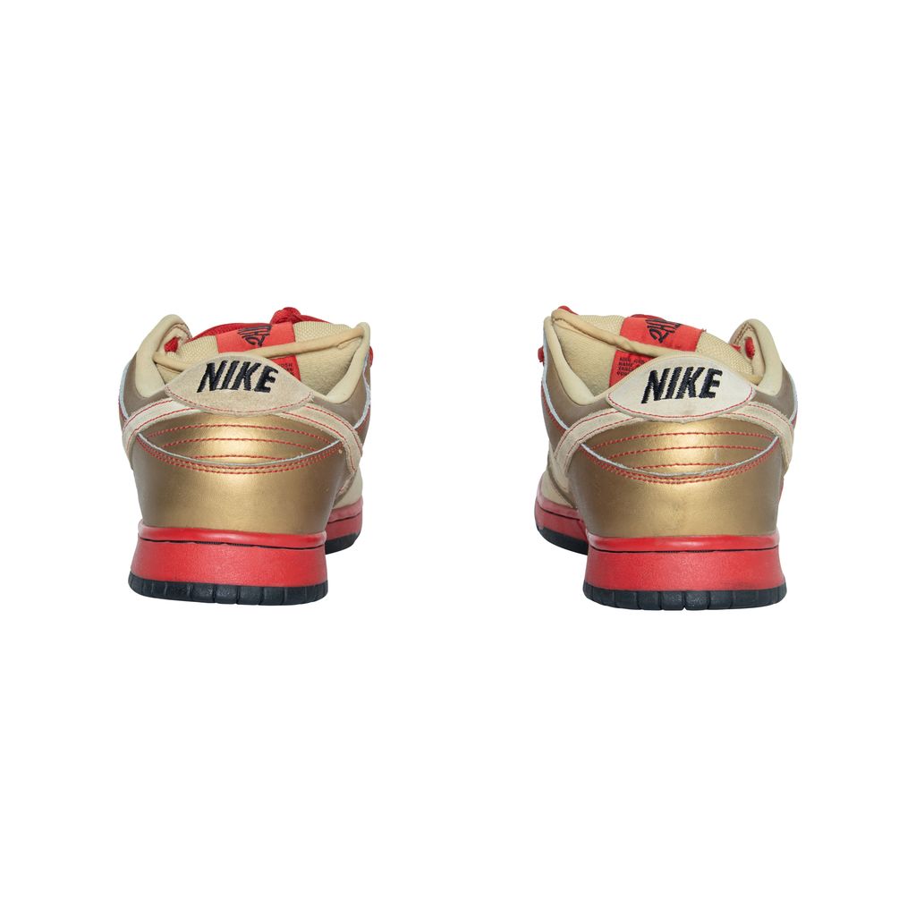 Nike SB Dunk Low Money Cat features metallic gold synthetic leather upper, Gold Dust suede overlays, red contrast stitching, and picture of the Money Cat on the insole.