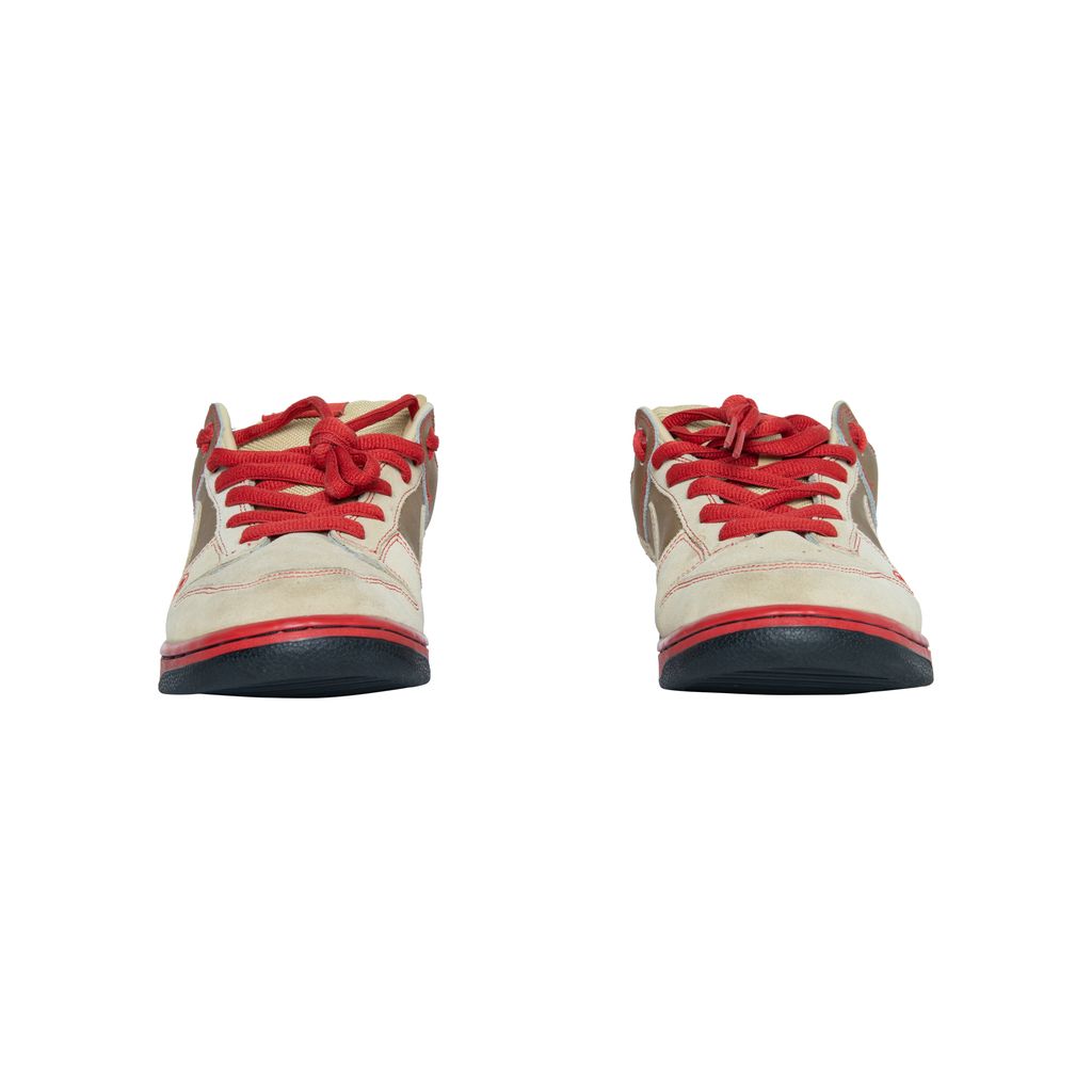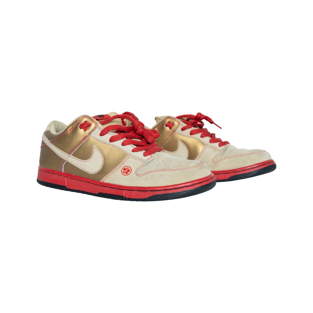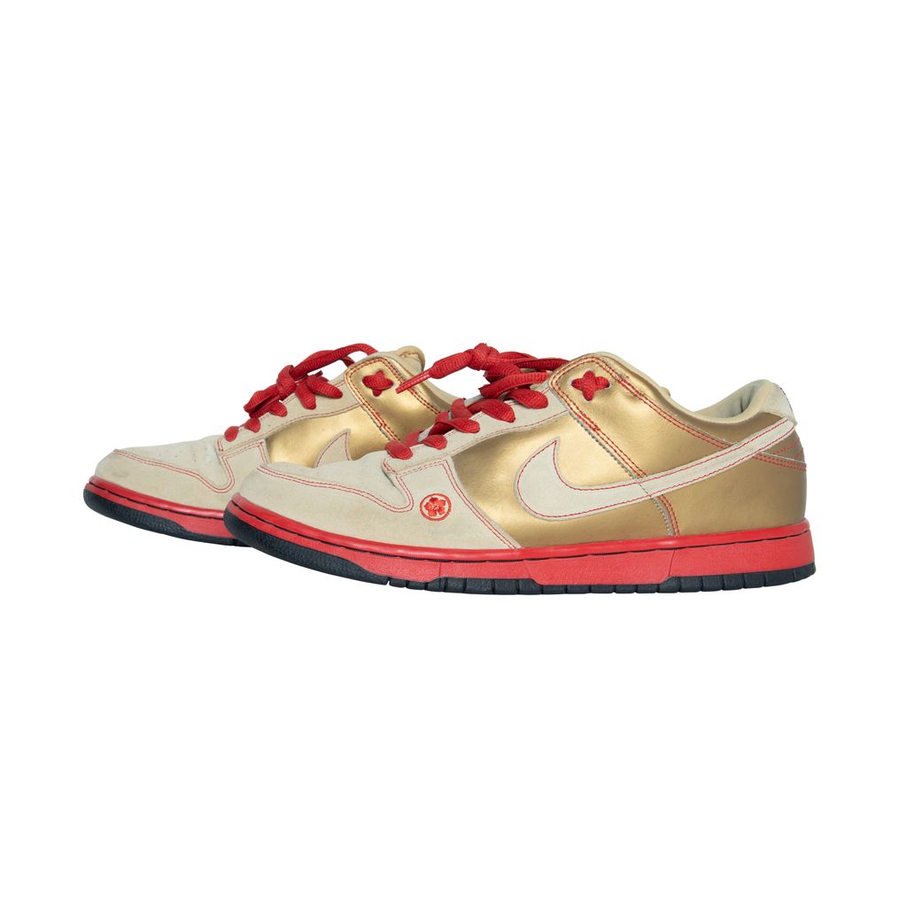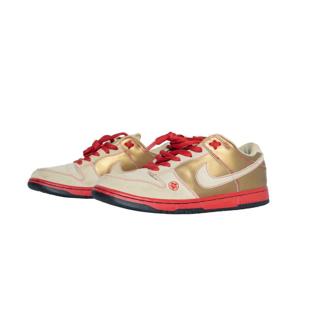 Nike SB Dunk Low Money Cat features metallic gold synthetic leather upper, Gold Dust suede overlays, red contrast stitching, and picture of the Money Cat on the insole.