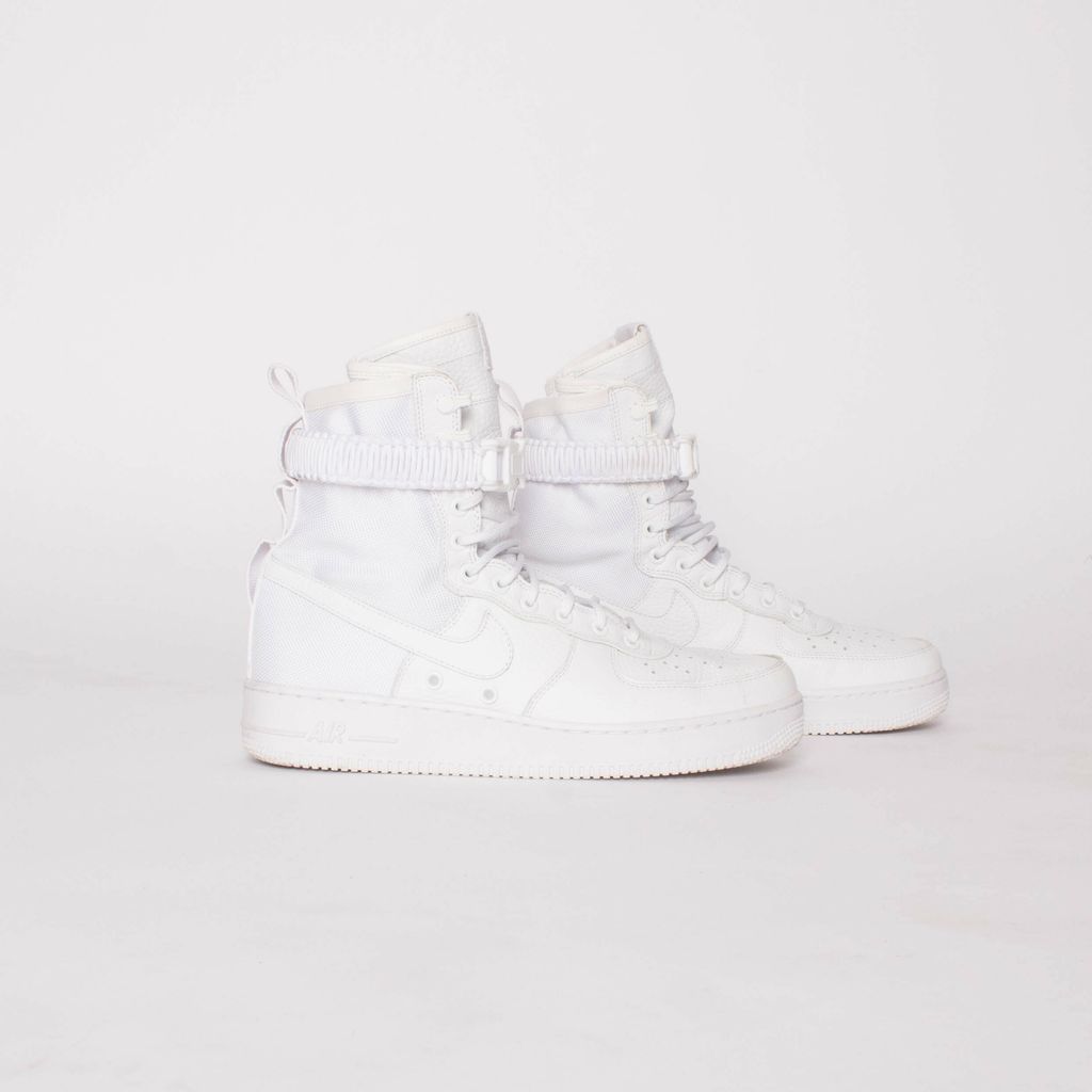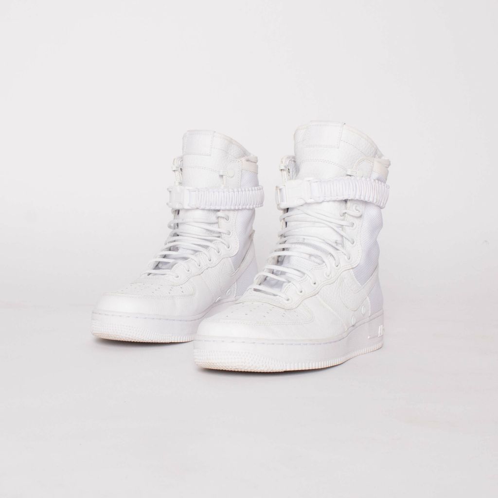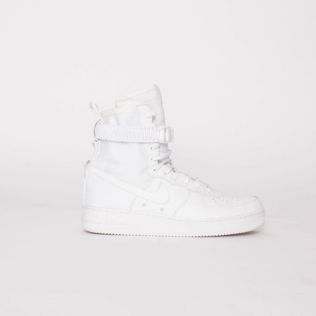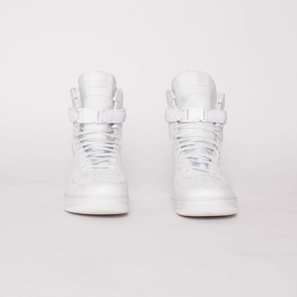 These ComplexCon exclusives are ultra clean in the triple white color way (body, leather, and rubber). Features 11 eye lace up pattern, removable buckle closure strap, leather Nike swoosh, and classic Air logo on soles.