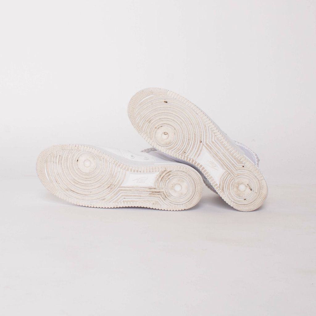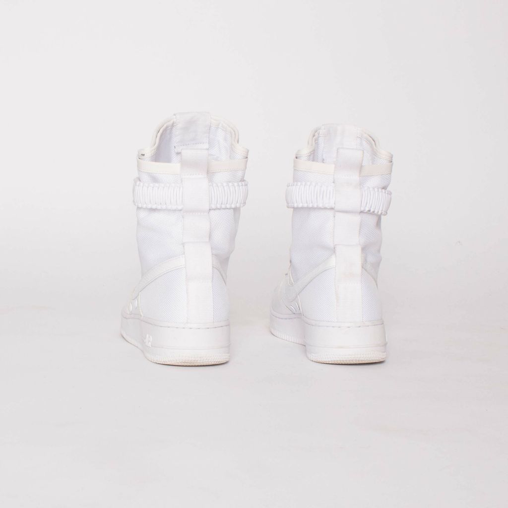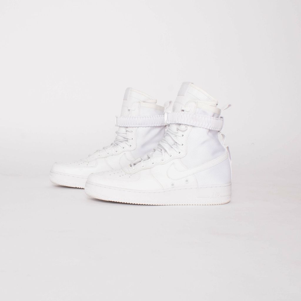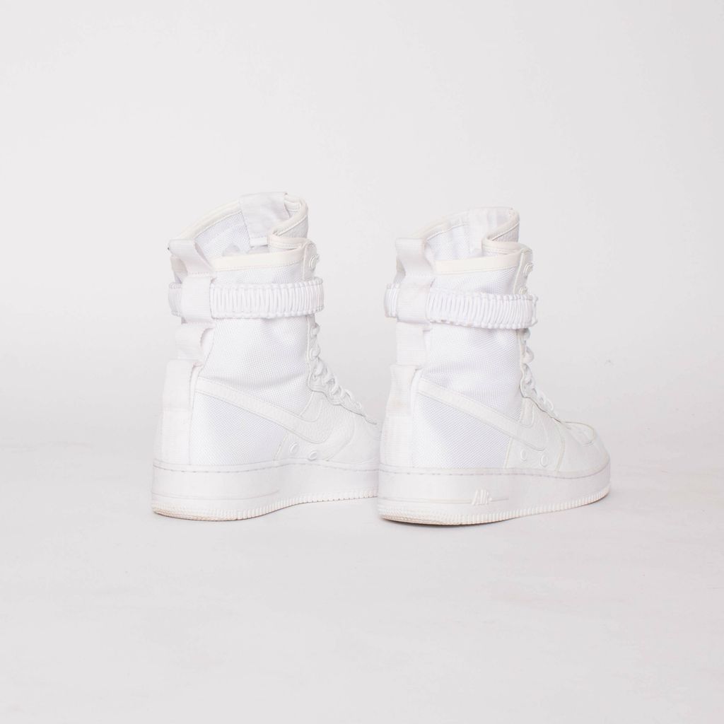 These ComplexCon exclusives are ultra clean in the triple white color way (body, leather, and rubber). Features 11 eye lace up pattern, removable buckle closure strap, leather Nike swoosh, and classic Air logo on soles.