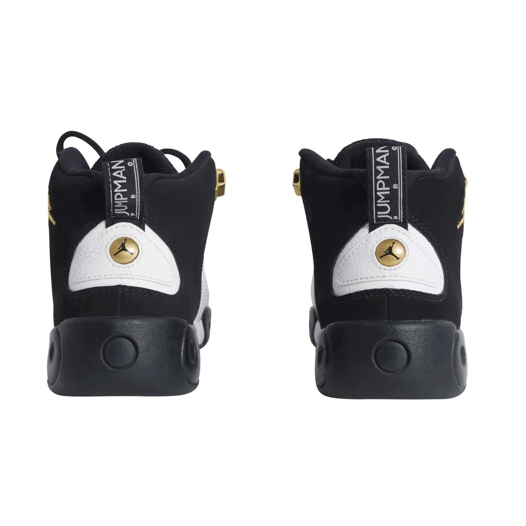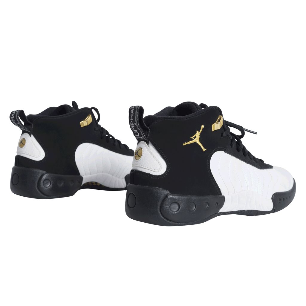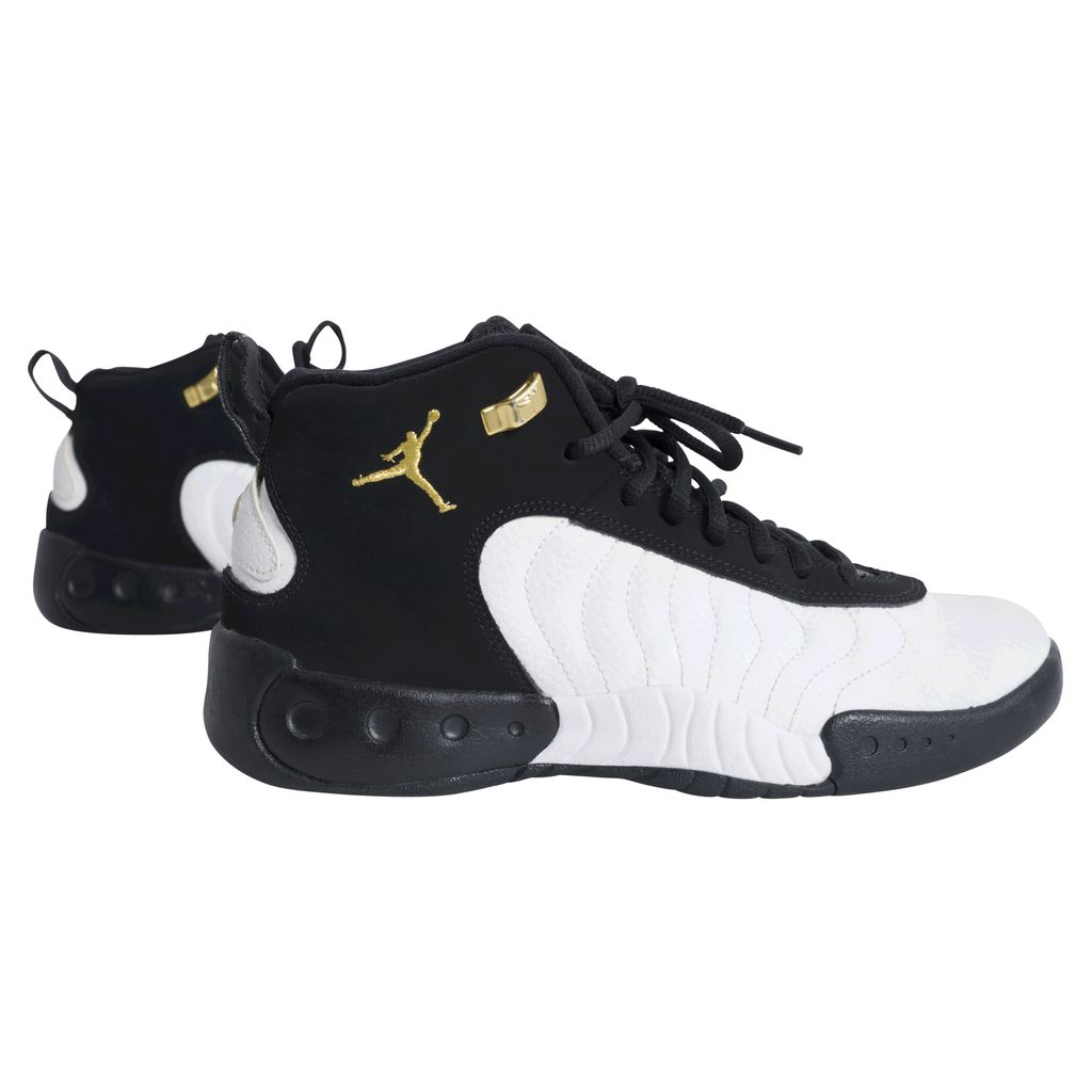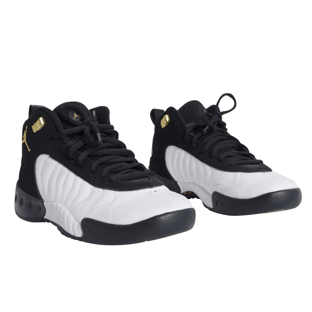 Another iconic release from Air Jordan, the Jumpman Pro was launched in 2017 inspired by the original Air Jordan 12 high-top. Black and white wave texture sneaker, featuring black laces over a mesh tongue, and gold basketball players are embroidered onto the outer ankle. Soles of the shoe are black, white, and featured gold and black checkered circles.