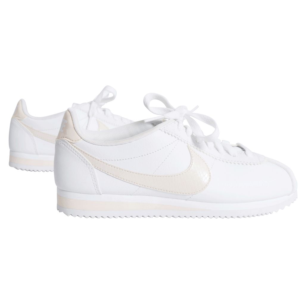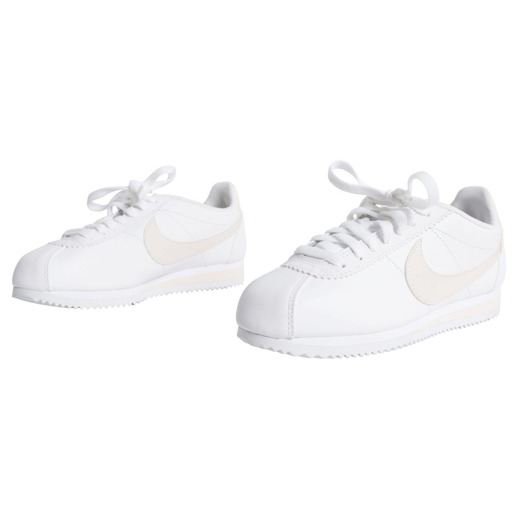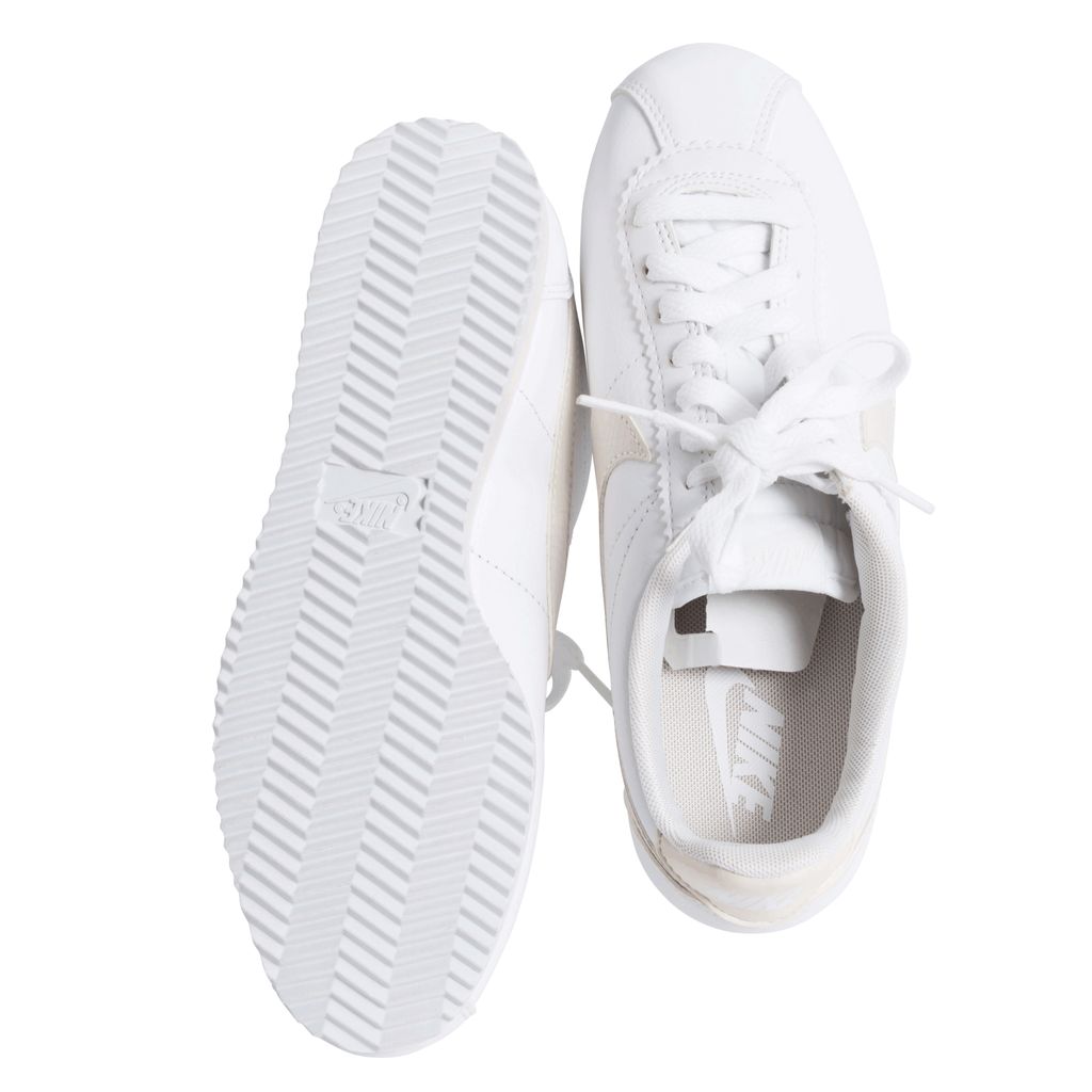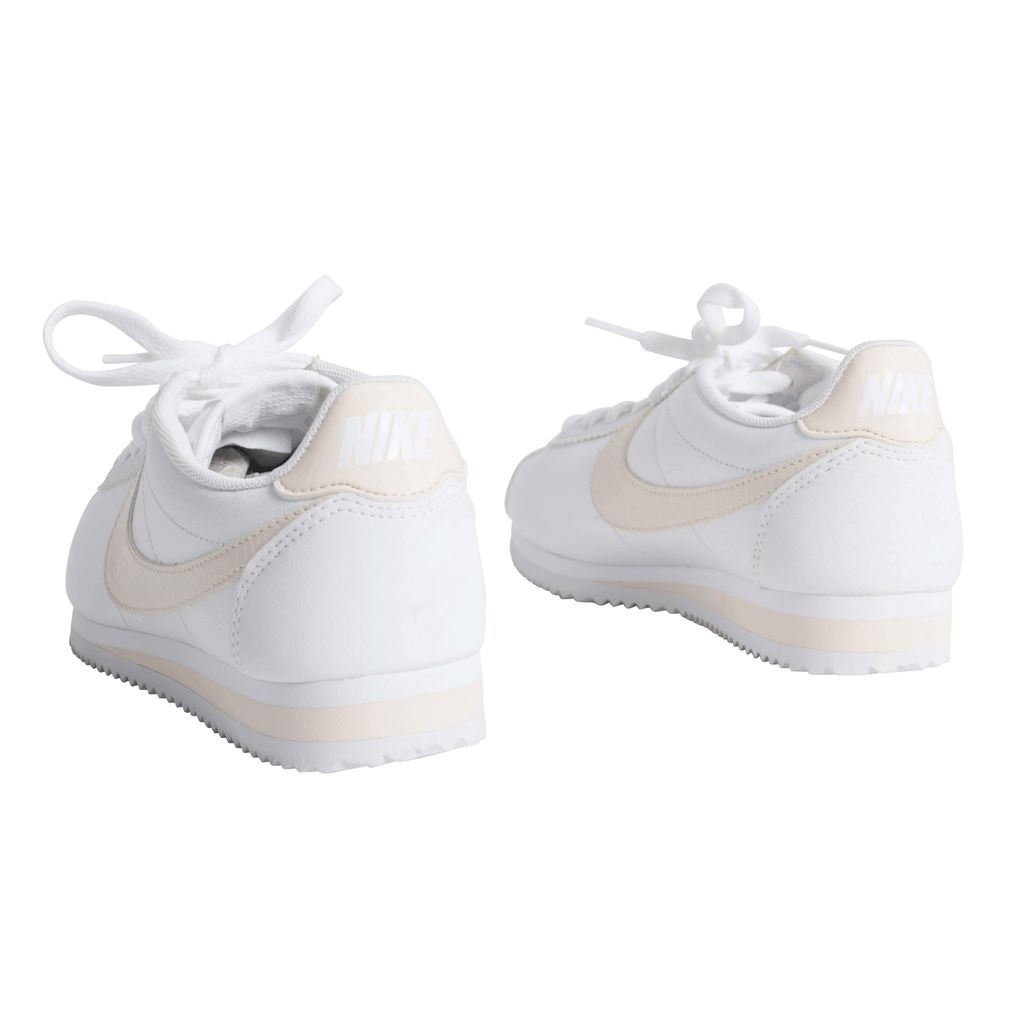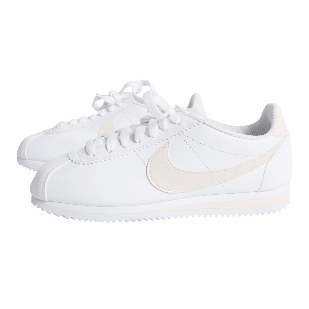 Leather Nike sneakers with light pink accents, including the classic Nike logo, heel band, and parts of the ankle. The rubber sole has cleat-like underside, that makes a white zig-zag pattern.