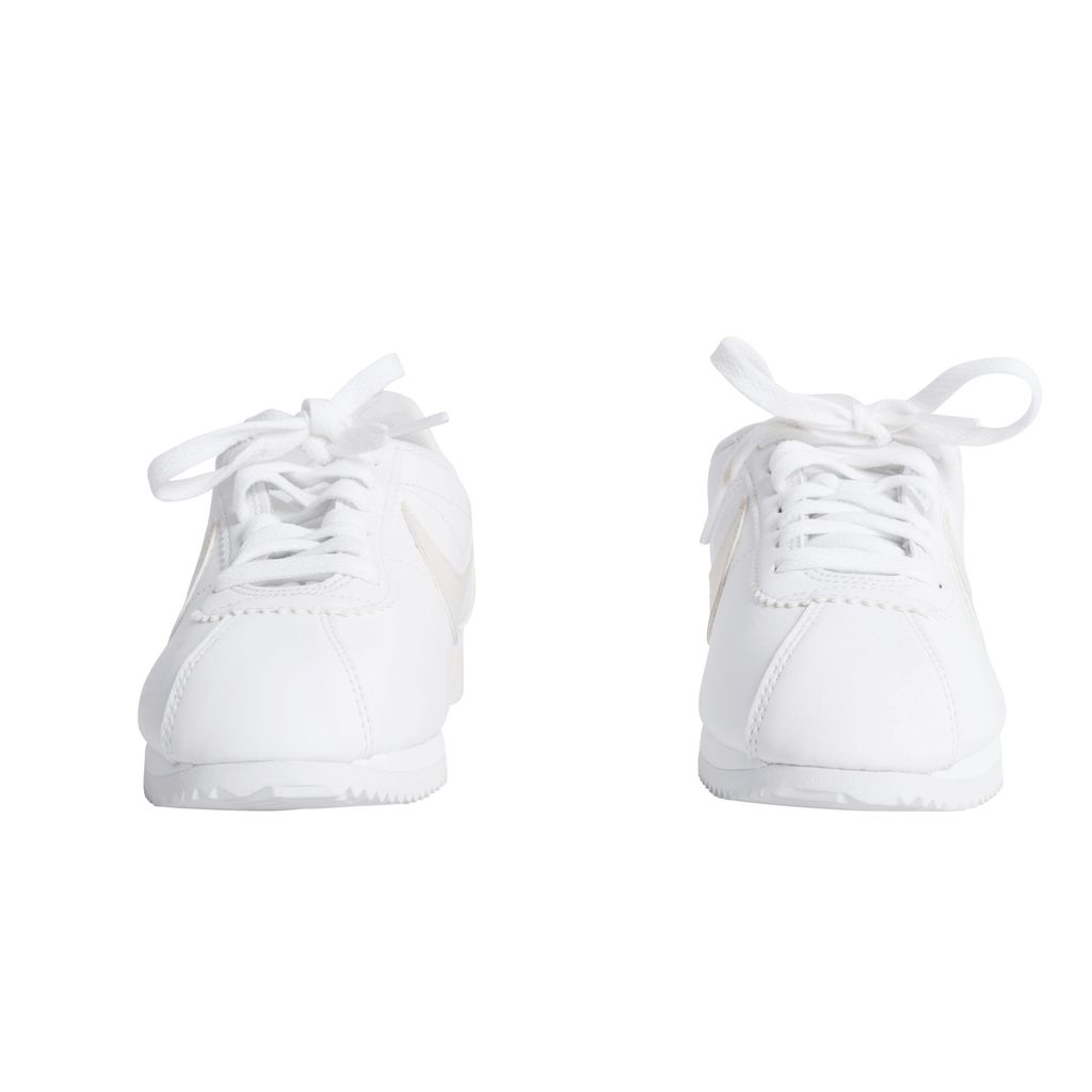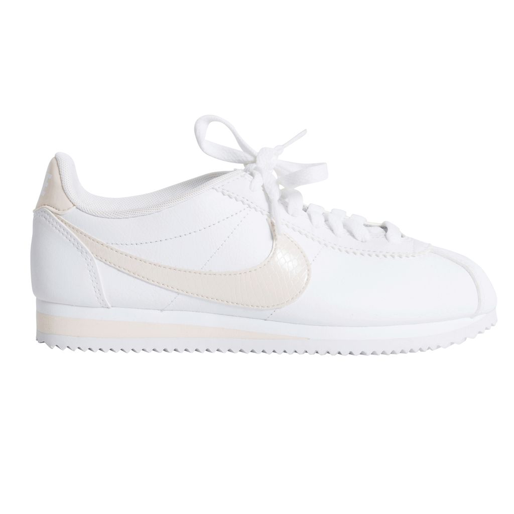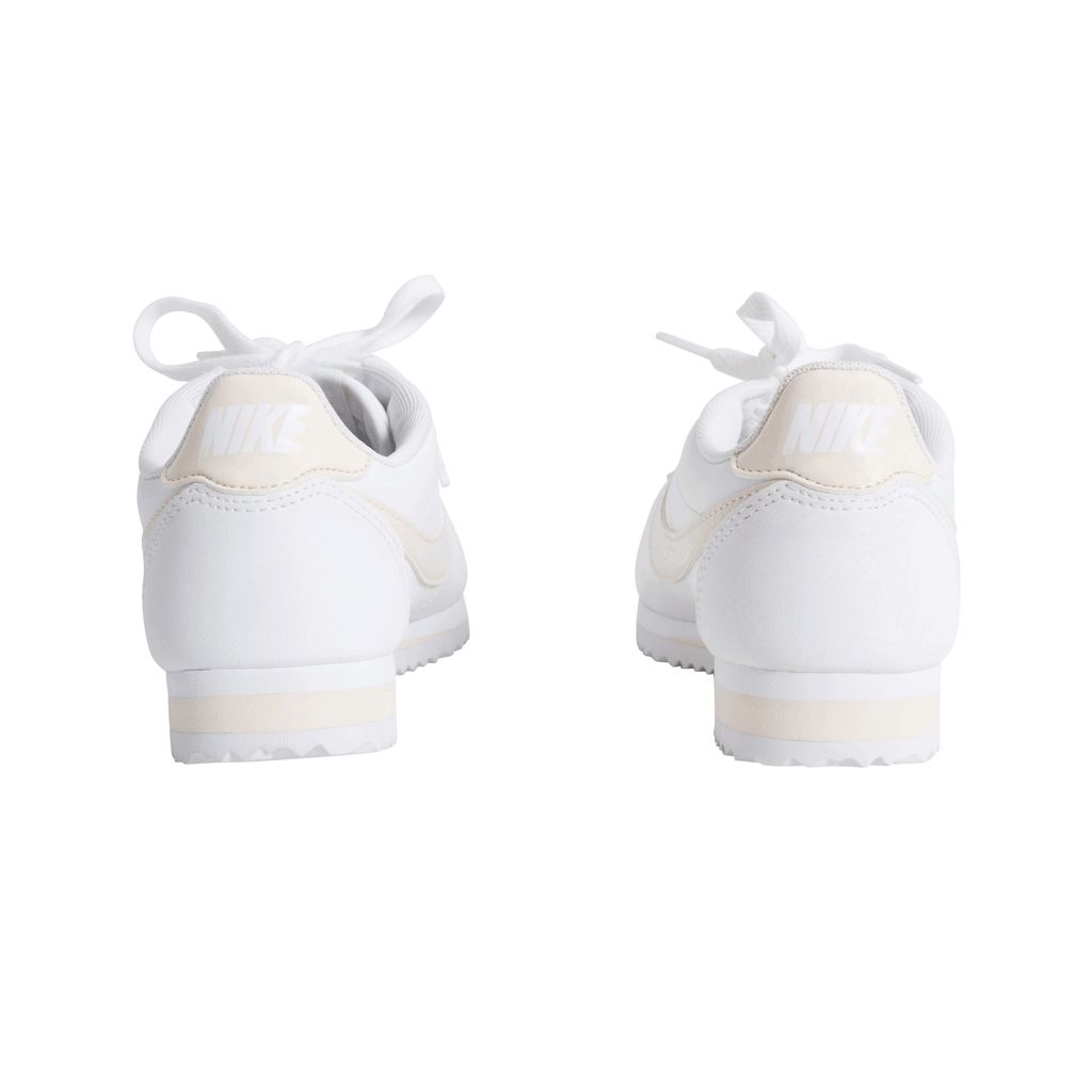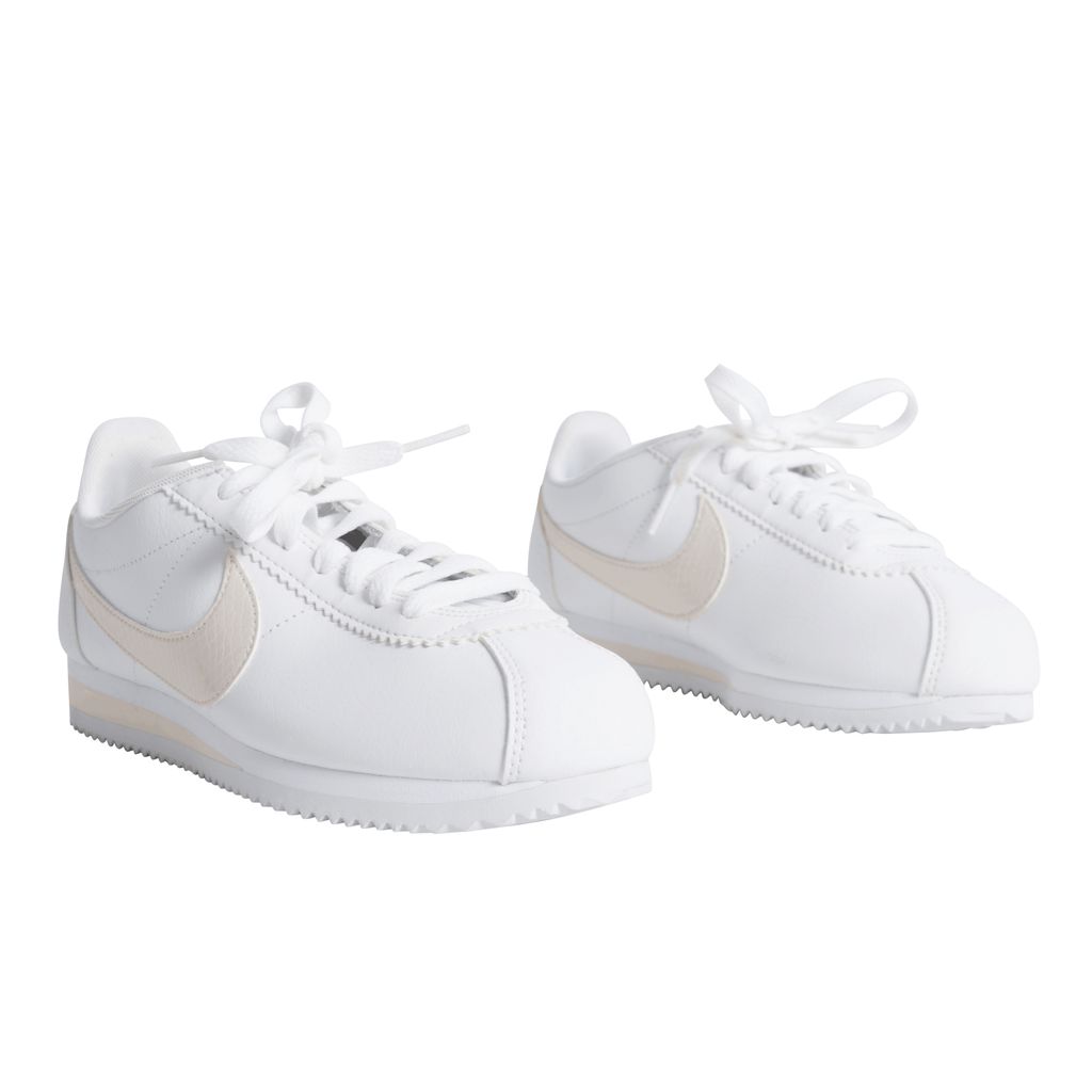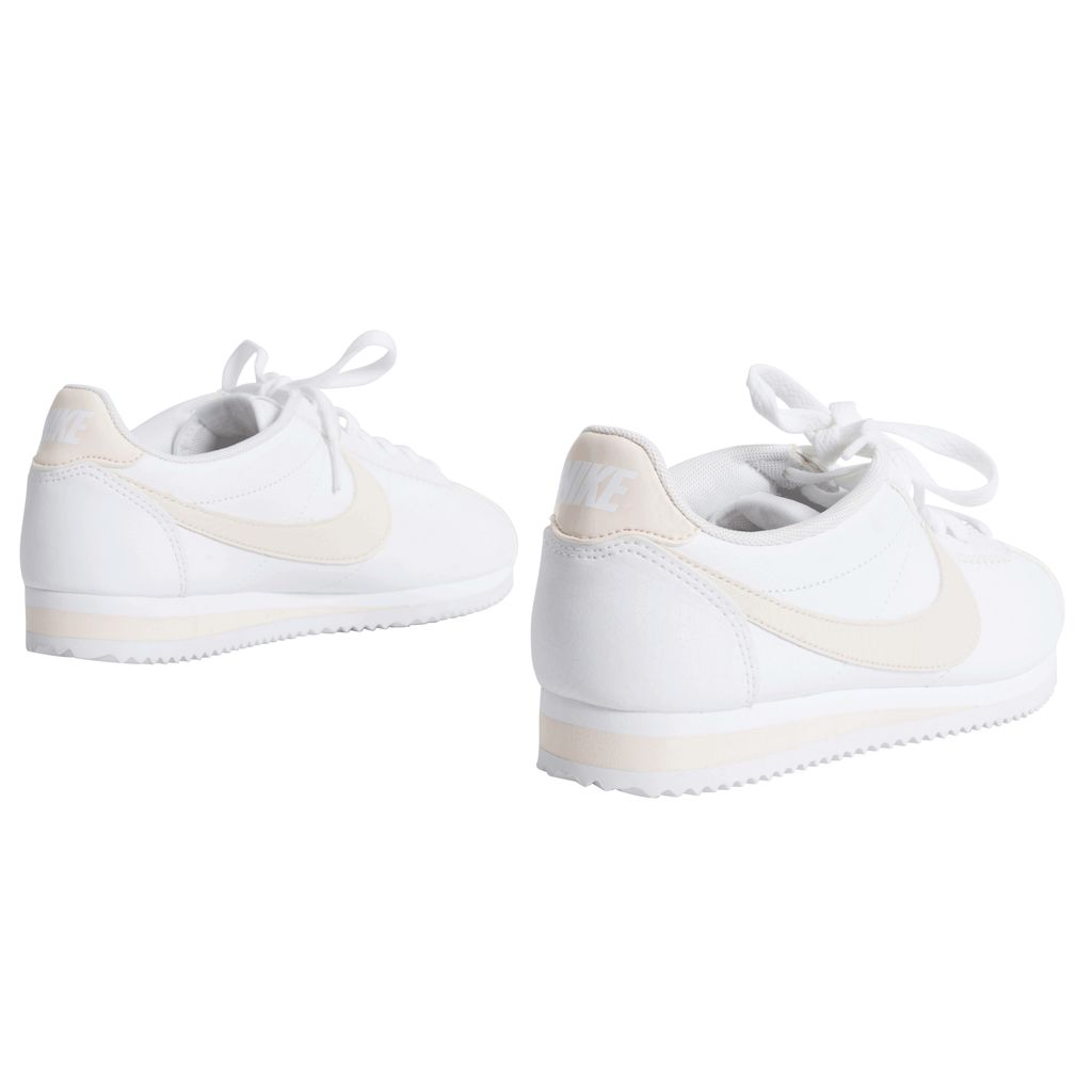Leather Nike sneakers with light pink accents, including the classic Nike logo, heel band, and parts of the ankle. The rubber sole has cleat-like underside, that makes a white zig-zag pattern.