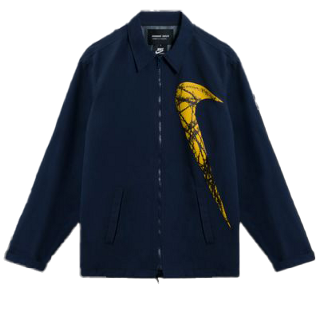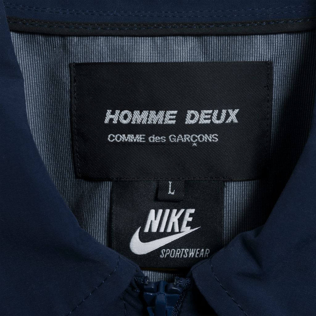 <>Created from a rare collaborative line between Rei Kawakubo’s label CDG Homme Deux and Nike, this lightweight coach jacket features a giant marigold Nike swoosh graphic, pointed collar, and front zipper with drawstring cord ties at hem for a customized fit. In excellent condition.