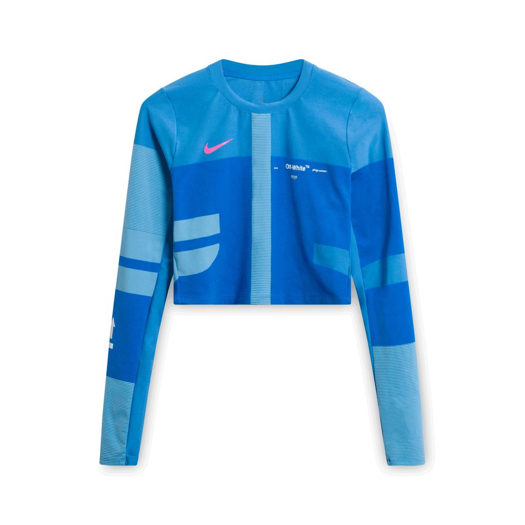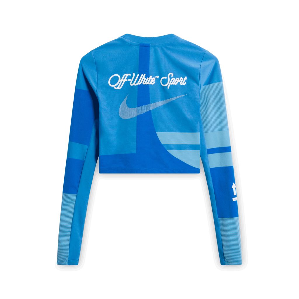 Blue workout set from Nike x Off-White Sport capsule. Featuring a geometric graphic long-sleeve crop top and matching leggings. Rubberized logo and detailing.