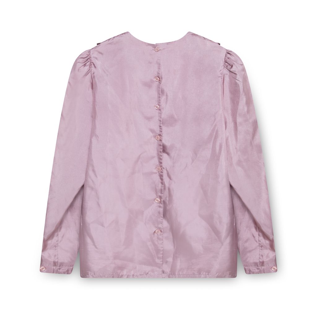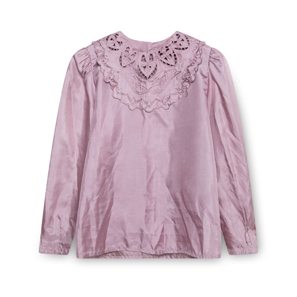 Nilani Mauve Blouse features back button closure, embroidered lace collar, and slightly puffed sleeves.