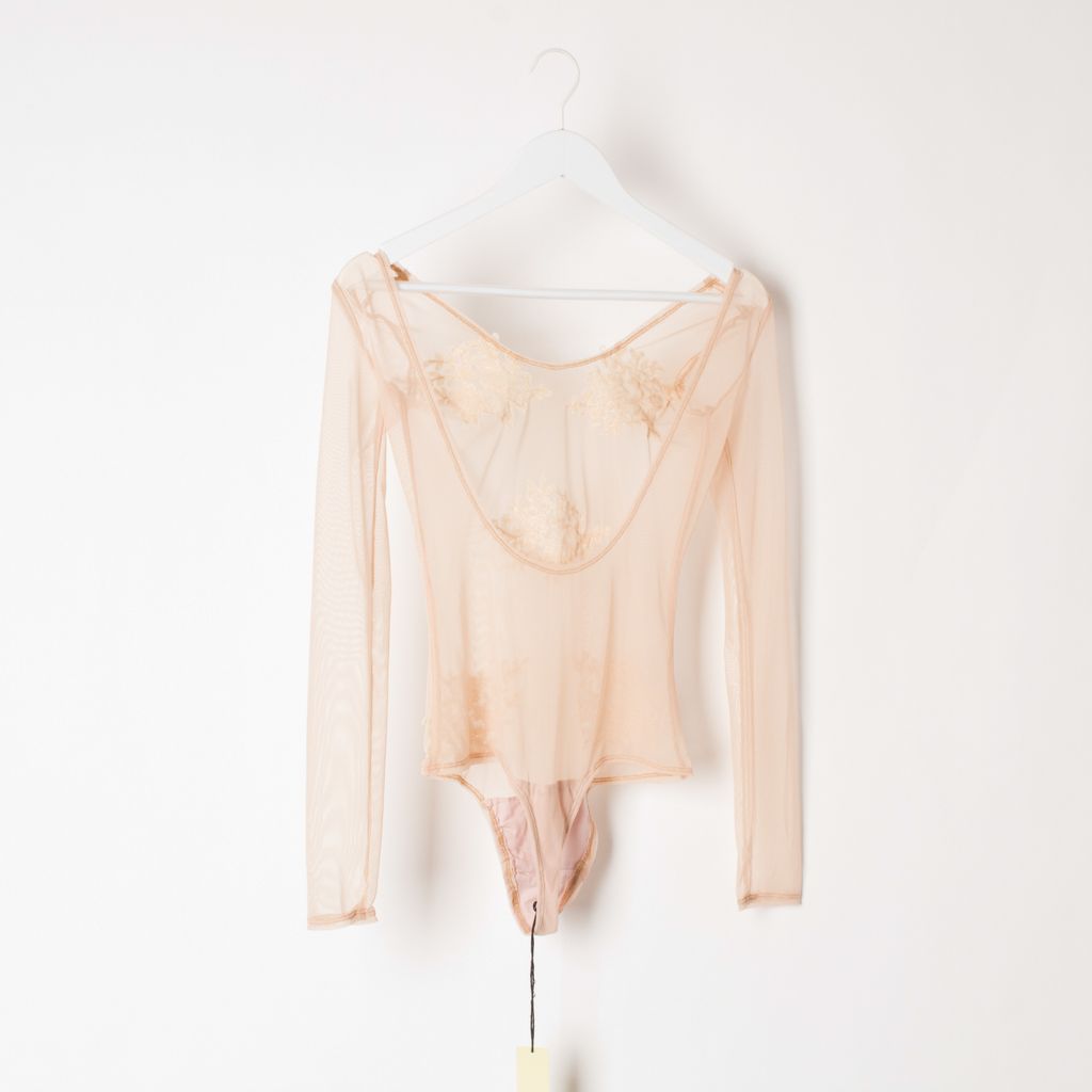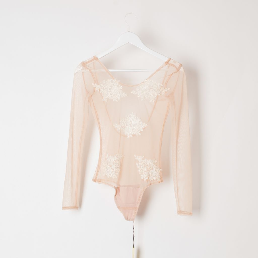 Nude bodysuit with cream applique detailing, sexy and chic!