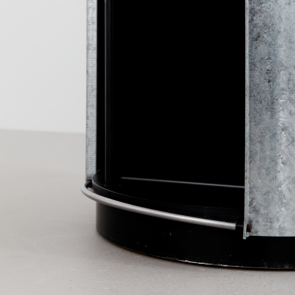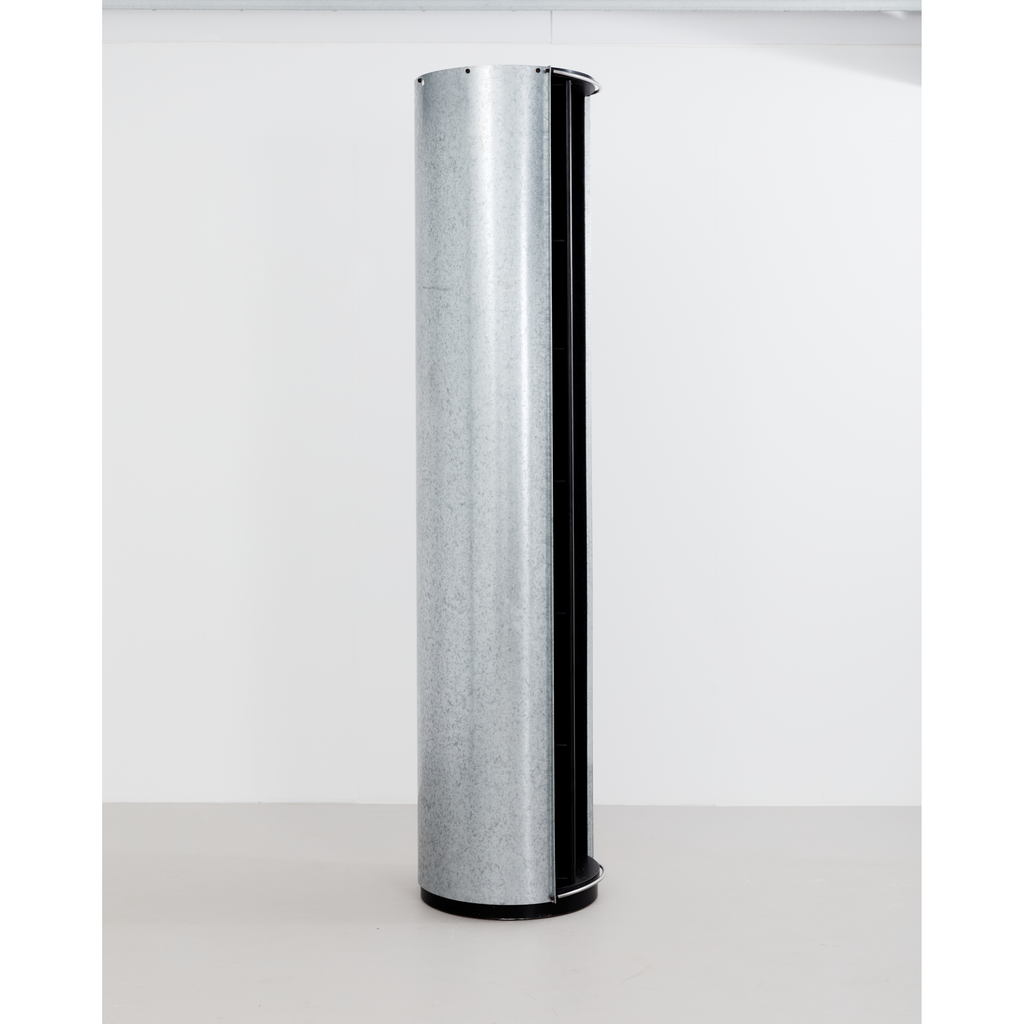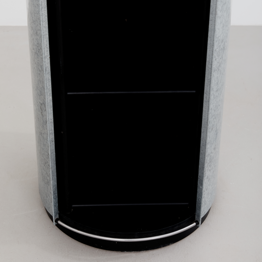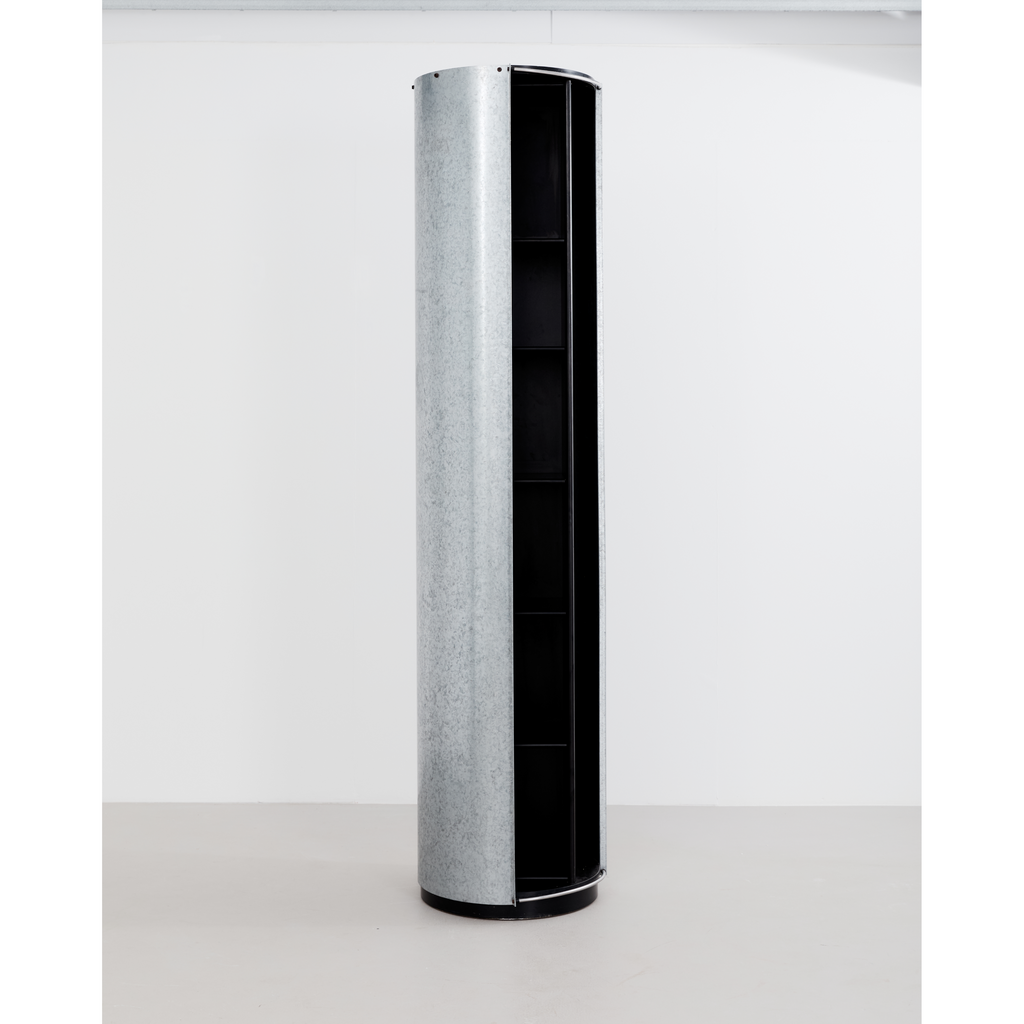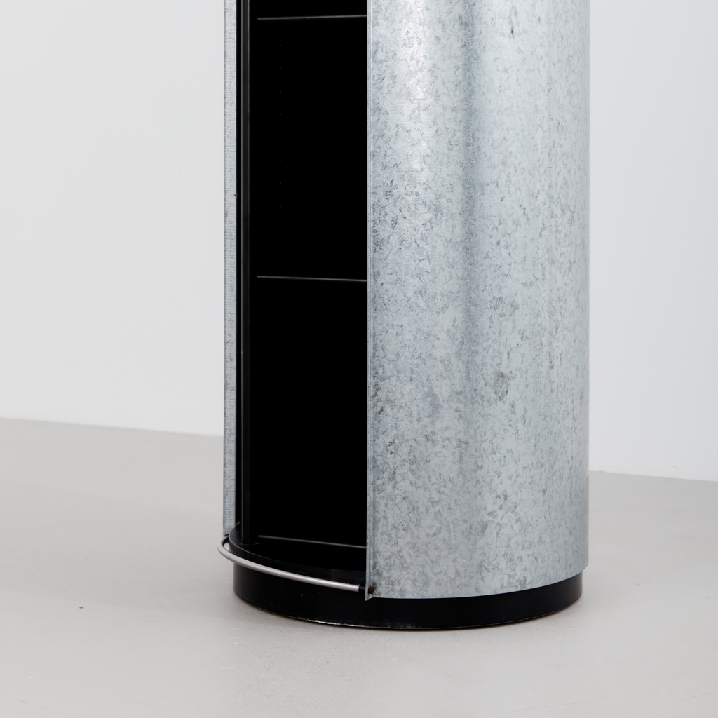 No. 13 pillar cabinet in galvanised steel by Hans Eichenberger for Swiss manufacturer, Wogg. Designed in 1994, this design classic cylinder shelving unit features adjustable shelves and distinctive rotating magnetic outer shell that slides around the fixed interior, giving you the option of discreet display.