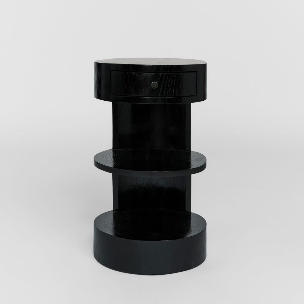 Rounded oak nightstand with single drawer and shelf. Shown in Ebony Lacquer with Blackened Steel pull.