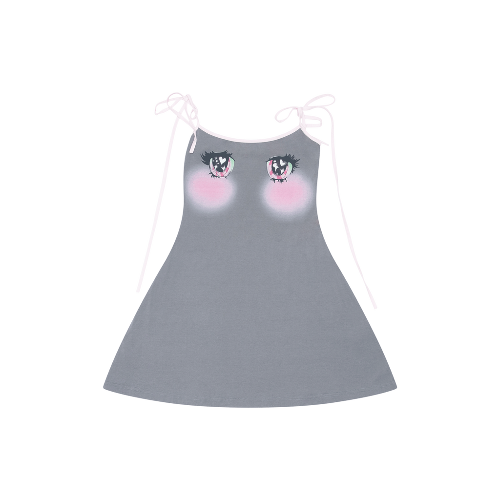 No Dress Anime Eyes Mini Dress features anime eyes graphic on chest, pink adjustable tie straps, and mini length.