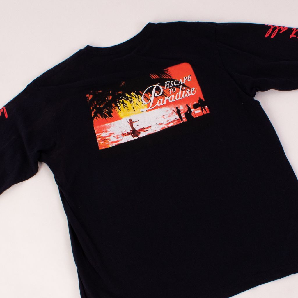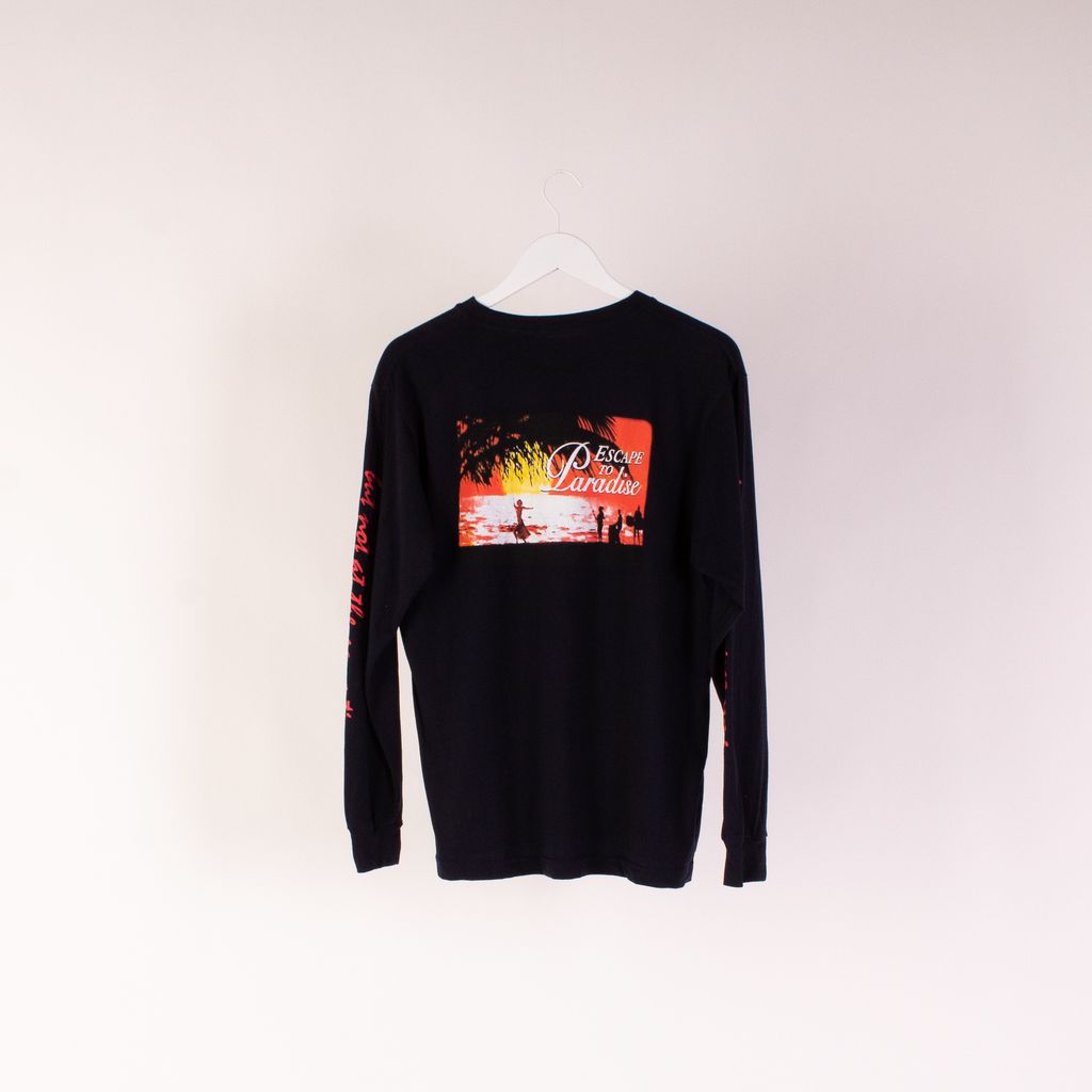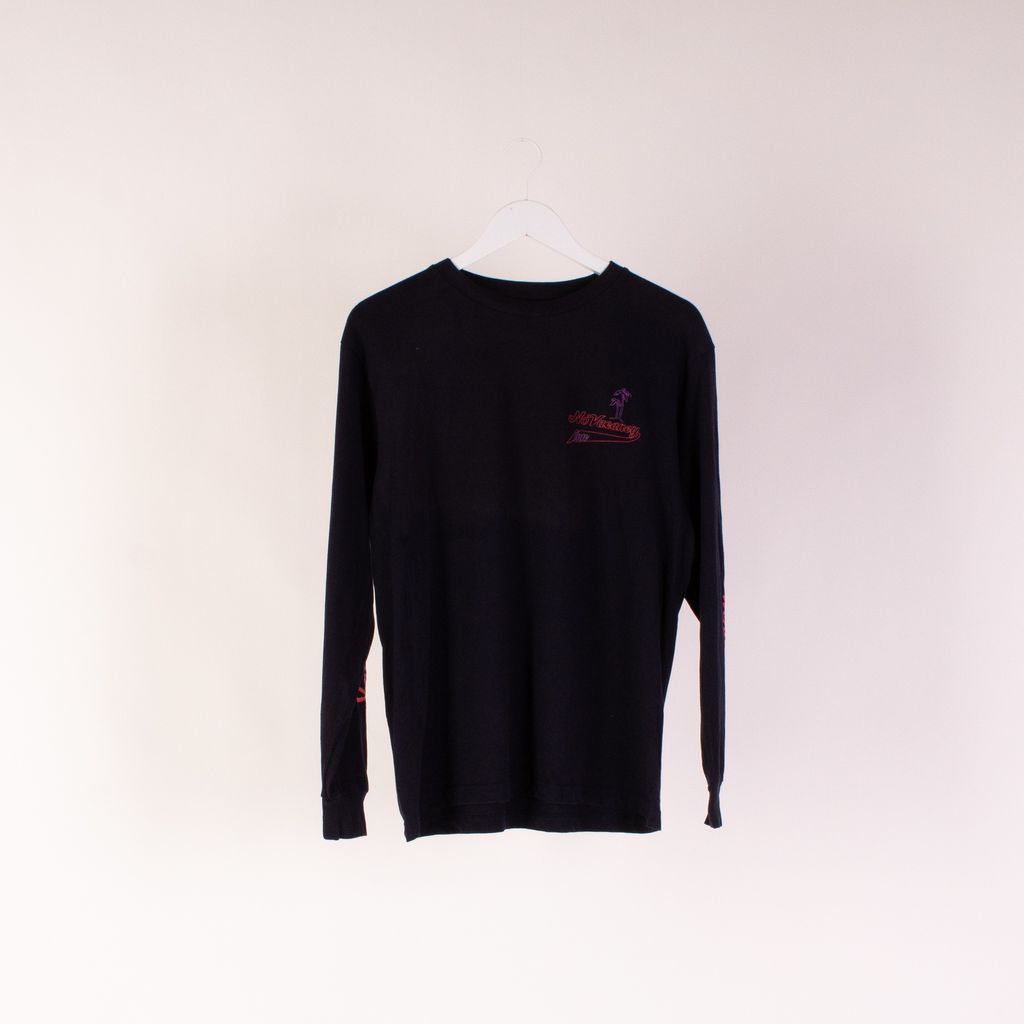 This long from London based design duo No Vacancy Inn, is a feast for the eyes with its tropical motif and all over text detailing. Features front and back unique screened graphics, rib knit neck and cuffs, and text down sleeves.