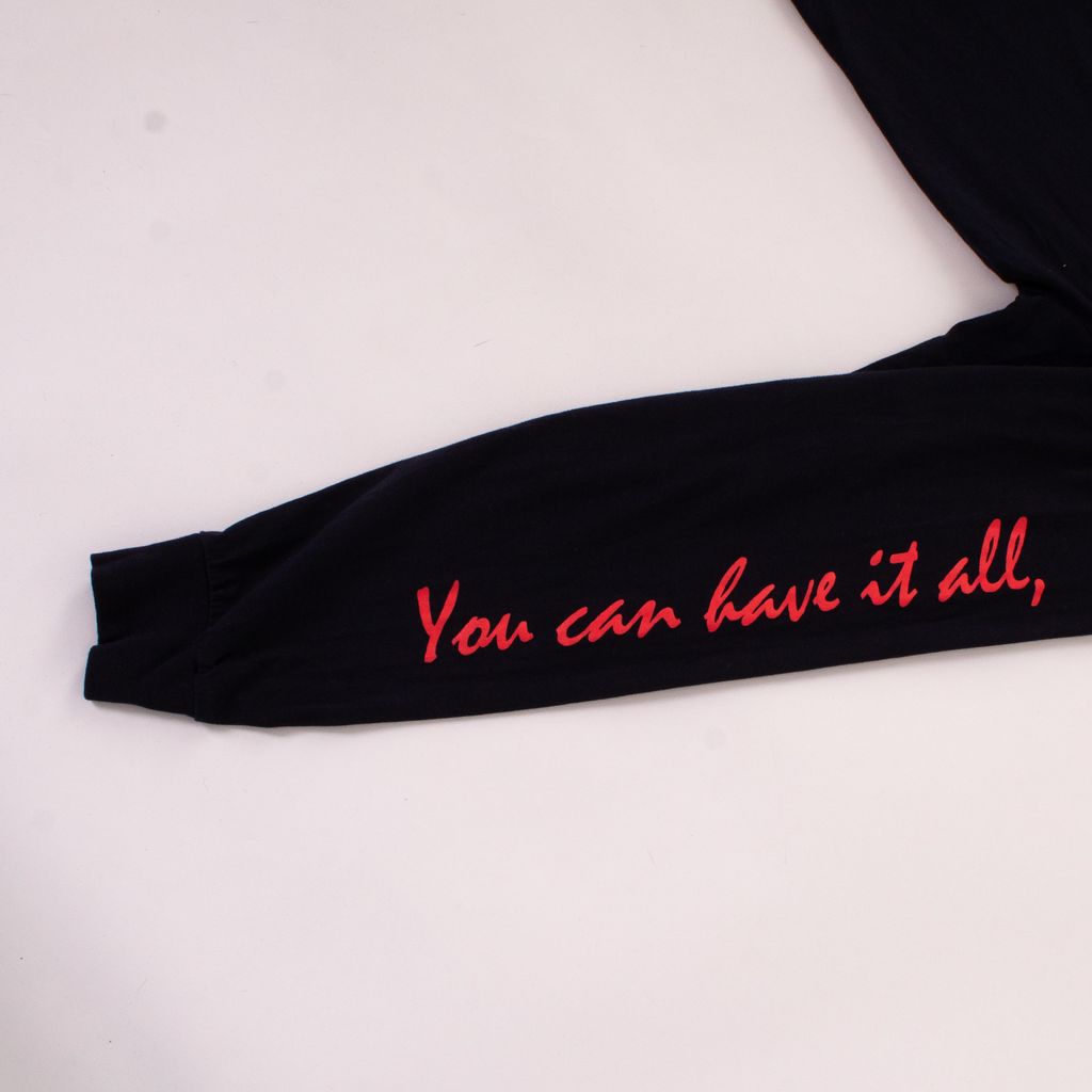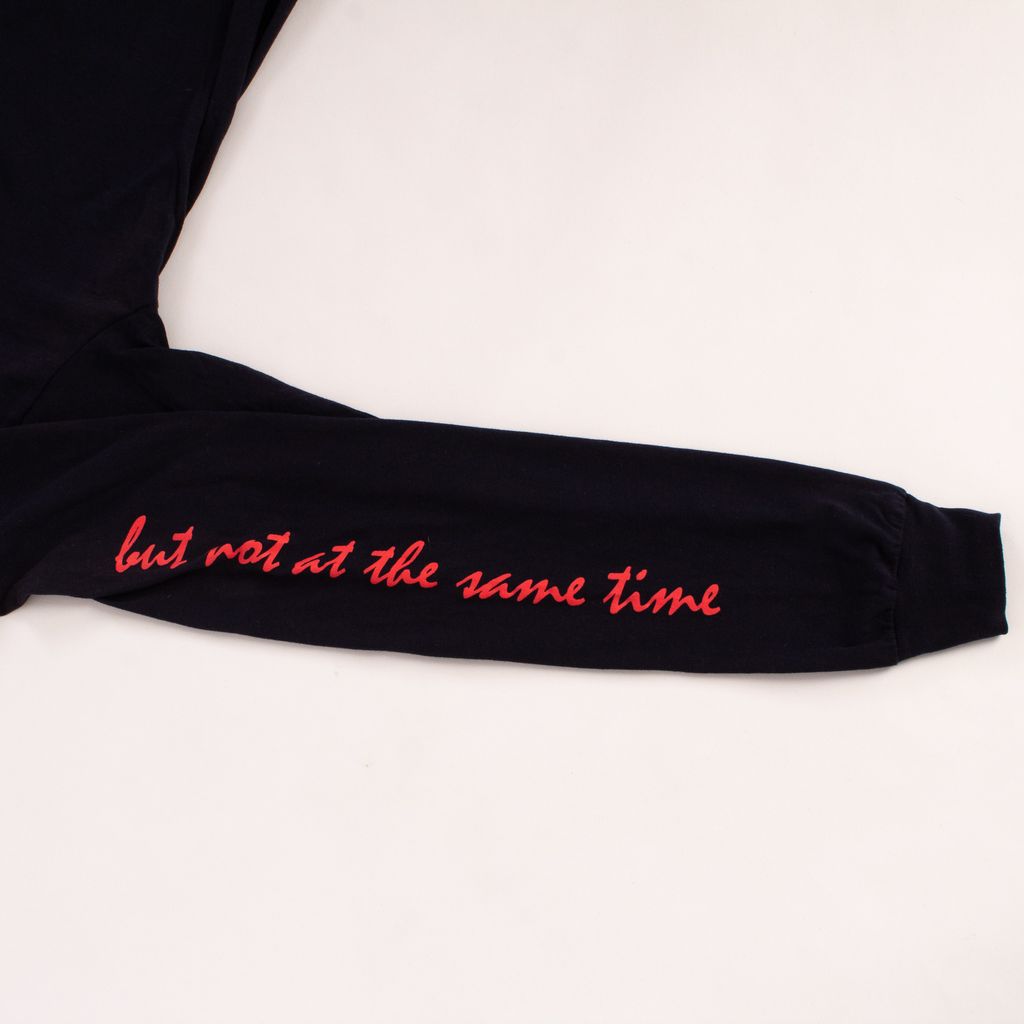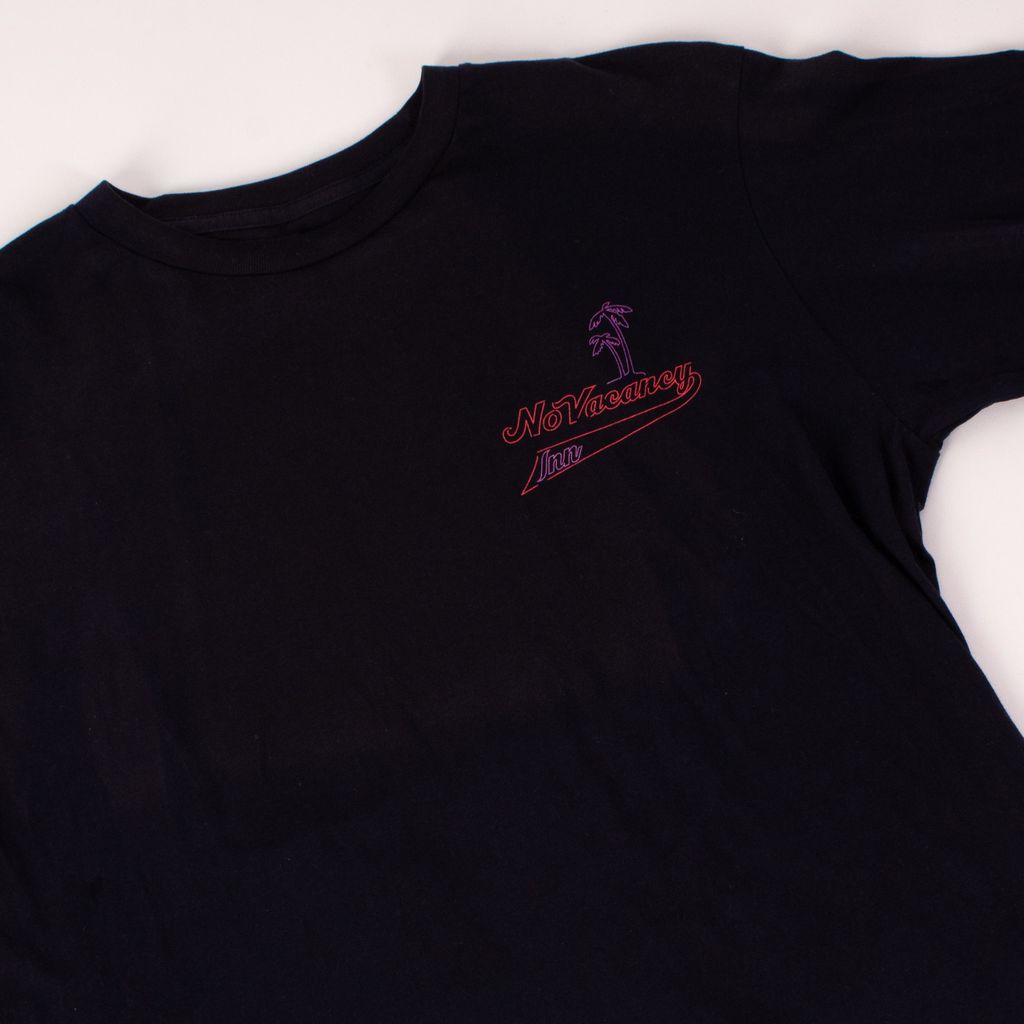 This long from London based design duo No Vacancy Inn, is a feast for the eyes with its tropical motif and all over text detailing. Features front and back unique screened graphics, rib knit neck and cuffs, and text down sleeves.