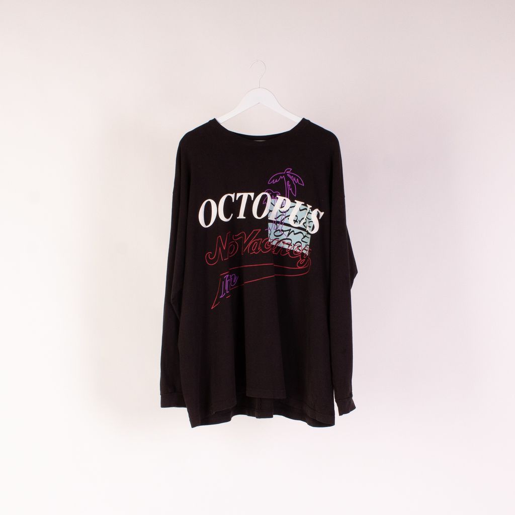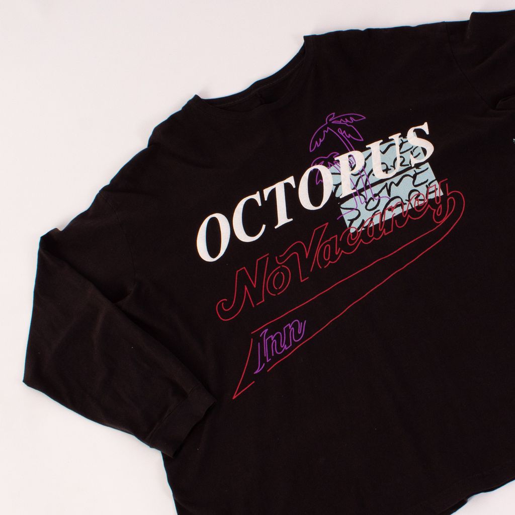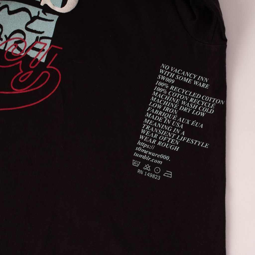 This long sleeve tee from streetwear brands No Vacancy Inn and Some Ware, was made as part of a collaboration capsule to be sold exclusively through men's retailer Mr Porter. Features front and back unique screened graphics, small wrist cuffs, and side screening on sleeves.