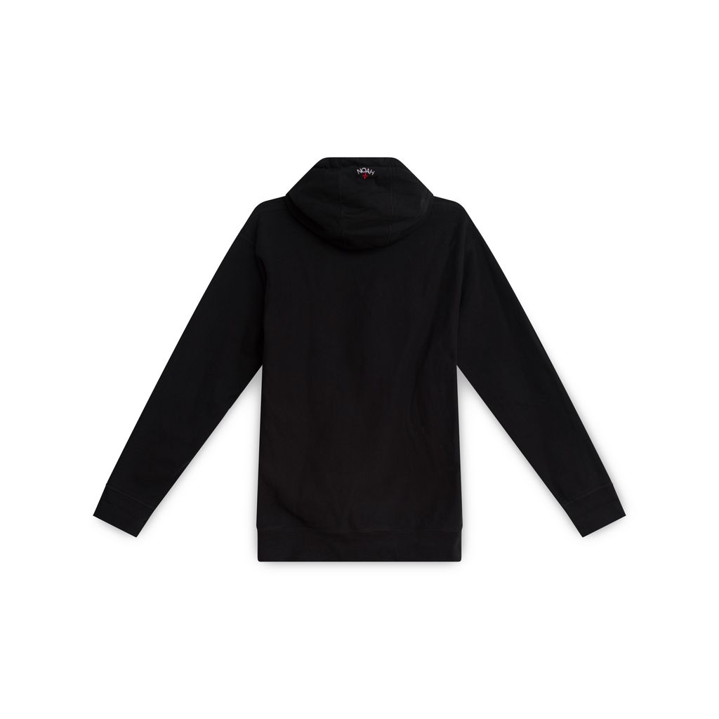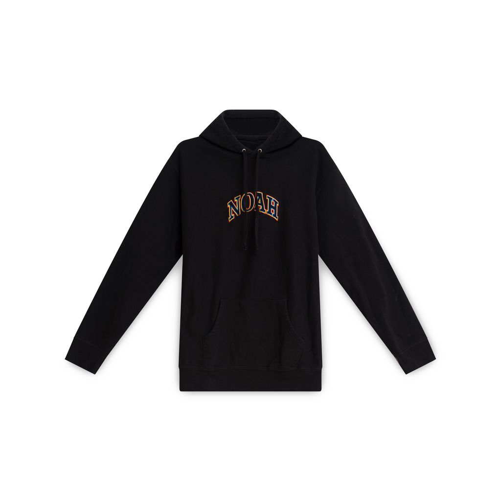 Noah Rainbow Logo Hoodie features embroidered logo on chest and hood, pocket on front, and drawstring hood.