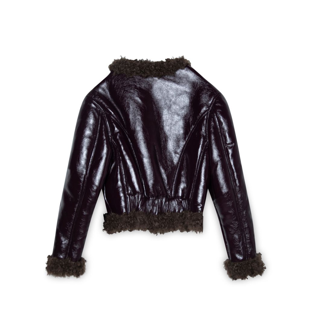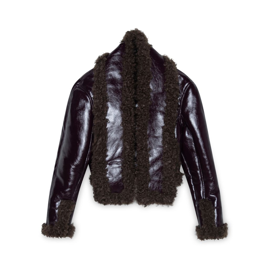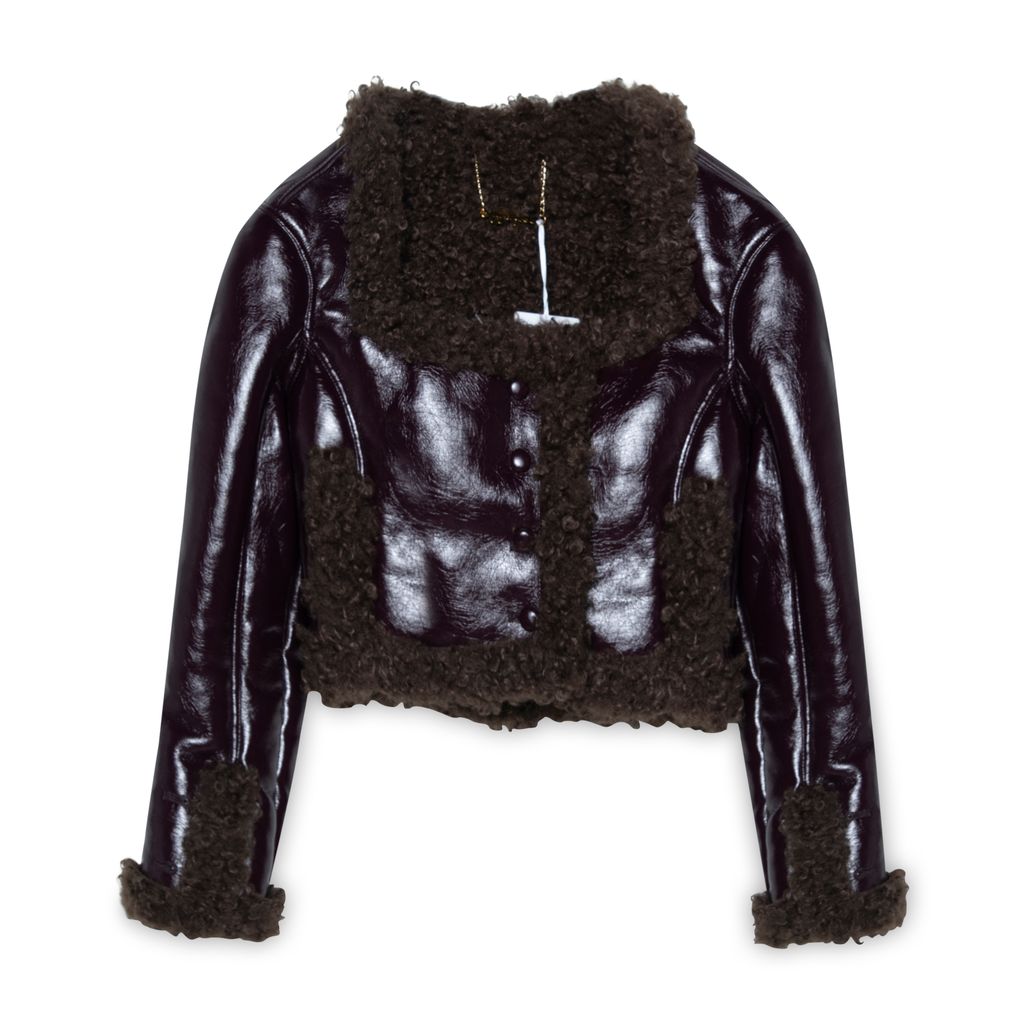 Nodress Burgundy Shearling Leather Jacket features brown shearling lining and trim, front button closure, matching belt, and square neckline.