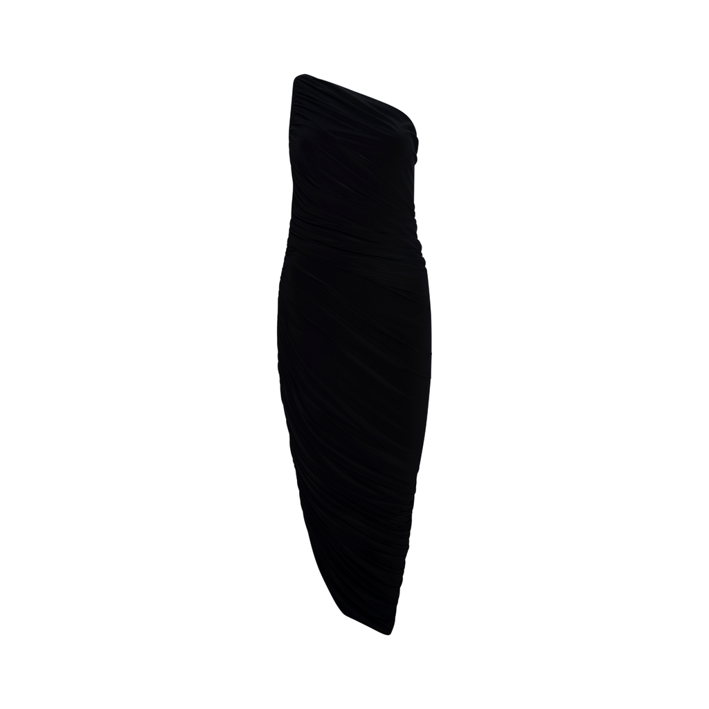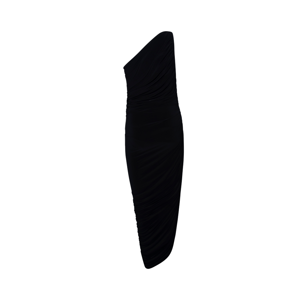 Norma Kamali Black Diana Gown features pull on styling, attached bodysuit lining, one shoulder design, and side ruching.