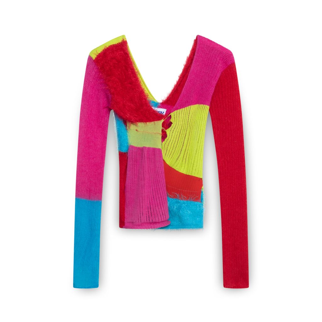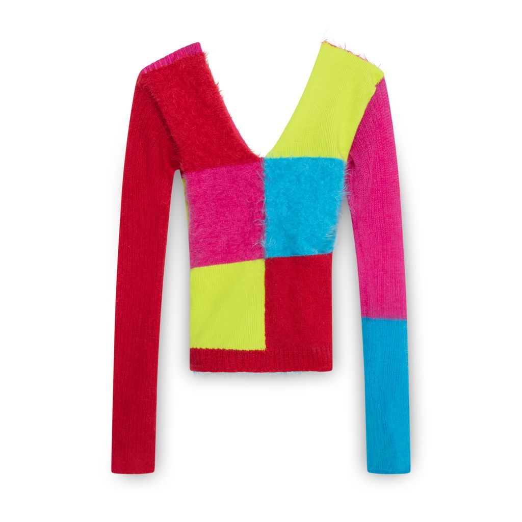 Noush Color Block Knit Cut Out Sweater features V-neck, varying yarn textures and knits, unfinished edges, and cutouts along front and sides.