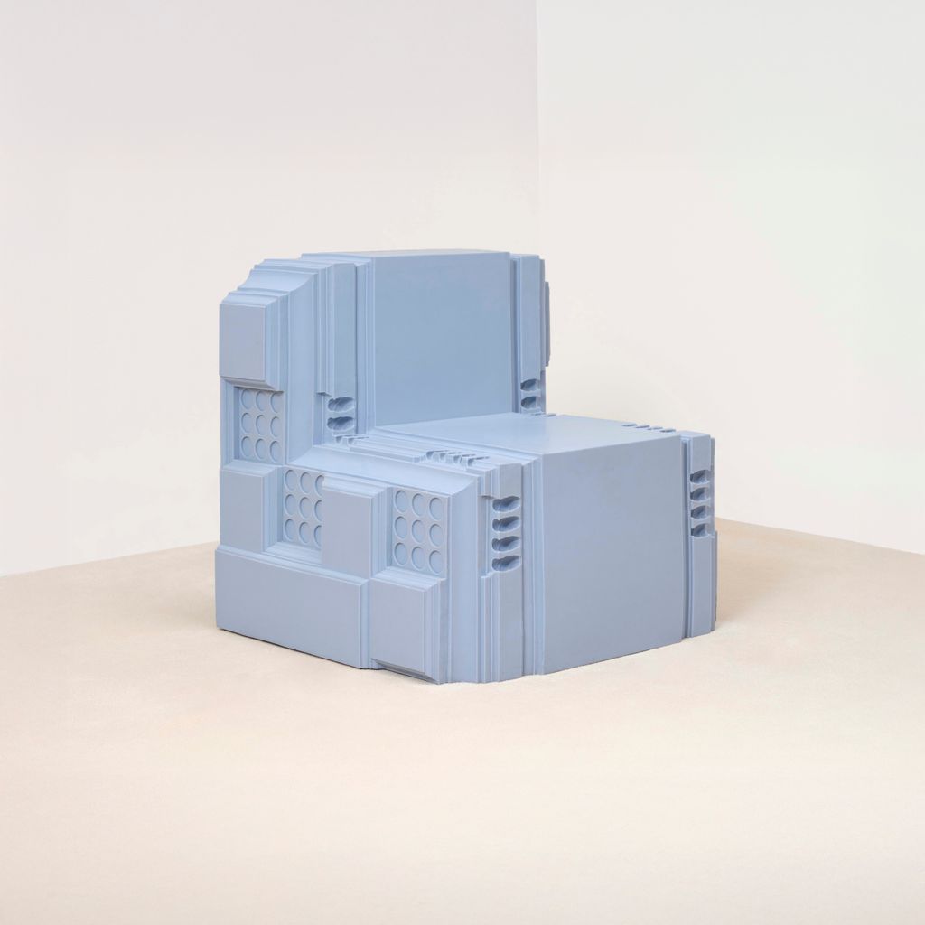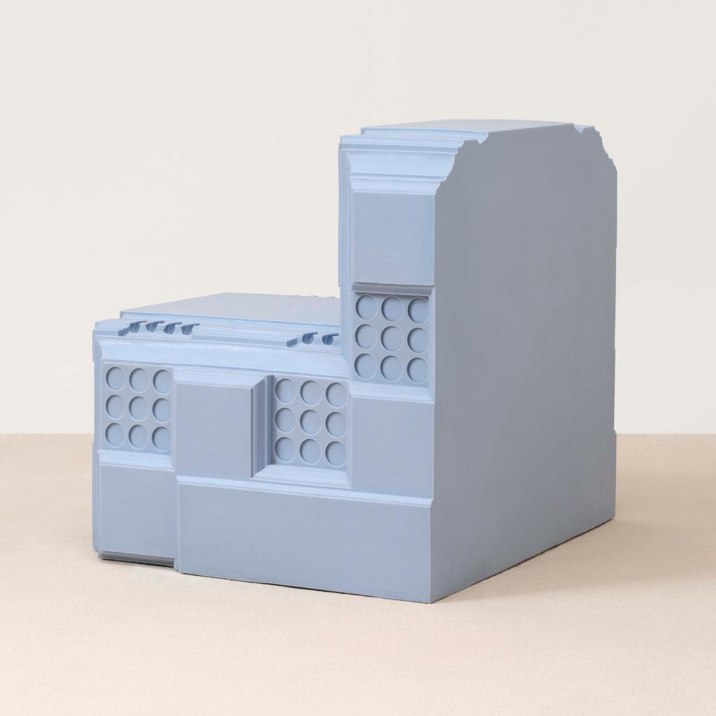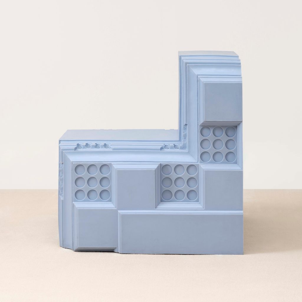 90210 Chair employs the same cast moldings as Nynke Koster’s 90210 bench and stool, reconfiguring architectural fragments into a more compact, vertical composition. Stacked layers of pigmented rubber create an angular seat that rises from modular blocks of dentil moldings and coffered rosettes. The work's L-shaped configuration emphasizes the tension between decorative ornament's original flatness—designed to adhere to walls and ceilings—and its new three-dimensional, load-bearing function. Through repetition and stacking, classical decoration becomes structural.