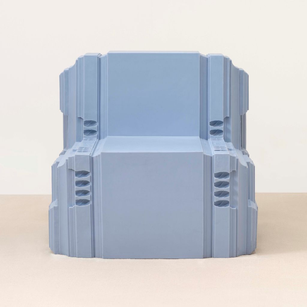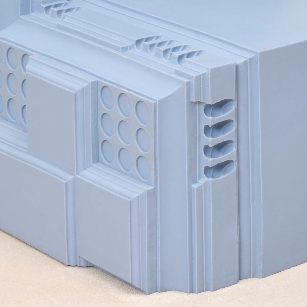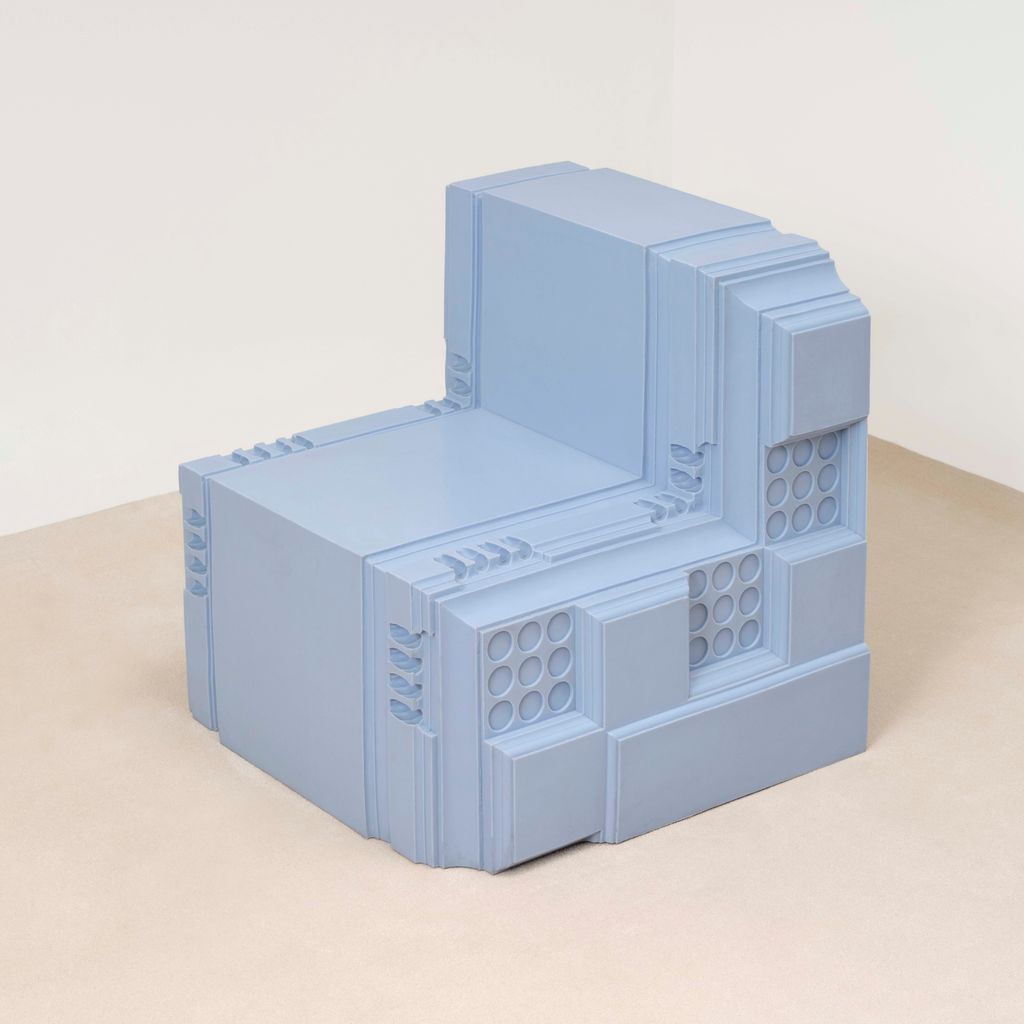 90210 Chair employs the same cast moldings as Nynke Koster’s 90210 bench and stool, reconfiguring architectural fragments into a more compact, vertical composition. Stacked layers of pigmented rubber create an angular seat that rises from modular blocks of dentil moldings and coffered rosettes. The work's L-shaped configuration emphasizes the tension between decorative ornament's original flatness—designed to adhere to walls and ceilings—and its new three-dimensional, load-bearing function. Through repetition and stacking, classical decoration becomes structural.
