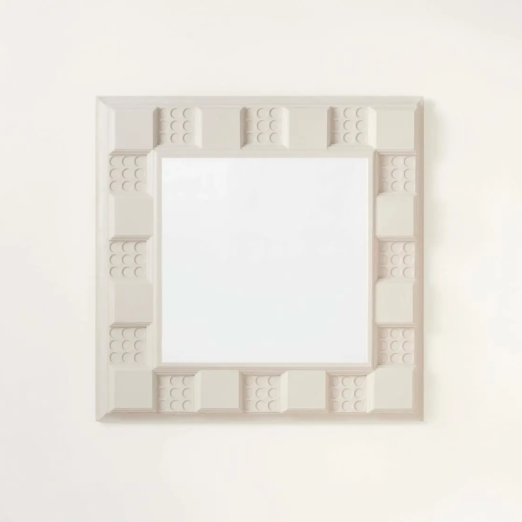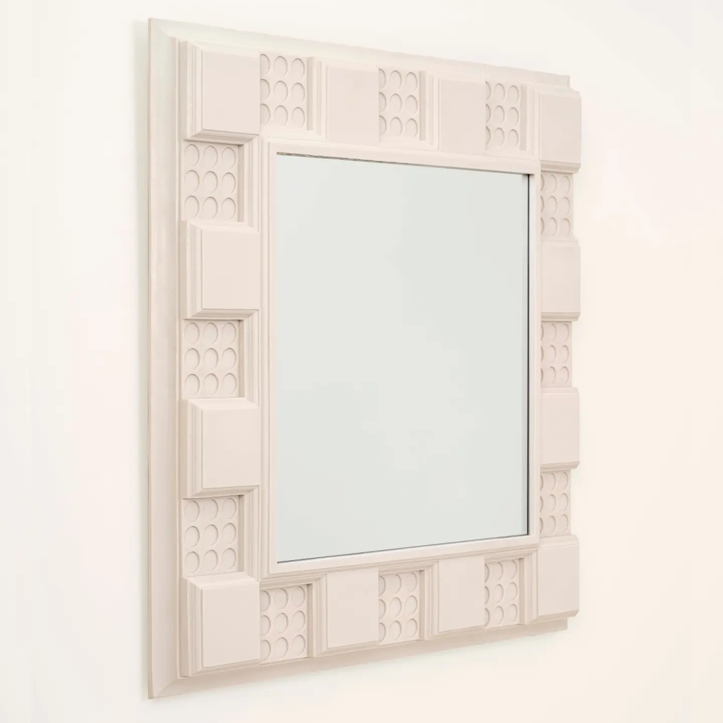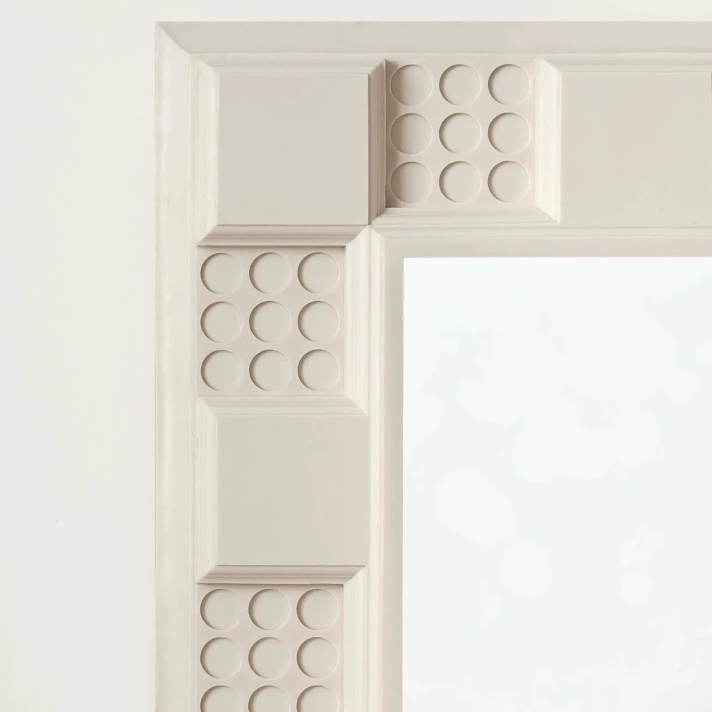 Dutch sculptor Nynke Koster’s 90210 Mirror employs cast Georgian moldings from Kelly Wearstler's Beverly Hills home as its frame. Modular blocks, alternating rosettes and plain panels in pigmented rubber, border the reflective surface in sequence. In Georgian and Neoclassical interiors, mirrors were traditionally positioned within elaborate wall paneling systems, surrounded by the same decorative moldings used throughout the room. Koster extracts these architectural elements from their original context and reconfigures them as the mirror's frame itself.