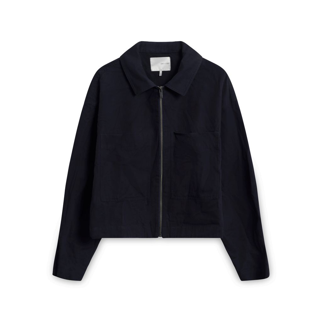 Oak + Fort Cotton Jacket in Black features dual chest pockets and zipper enclosure.