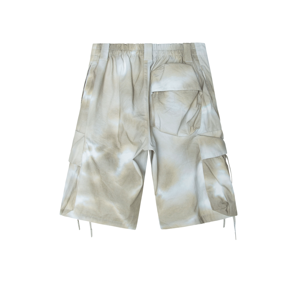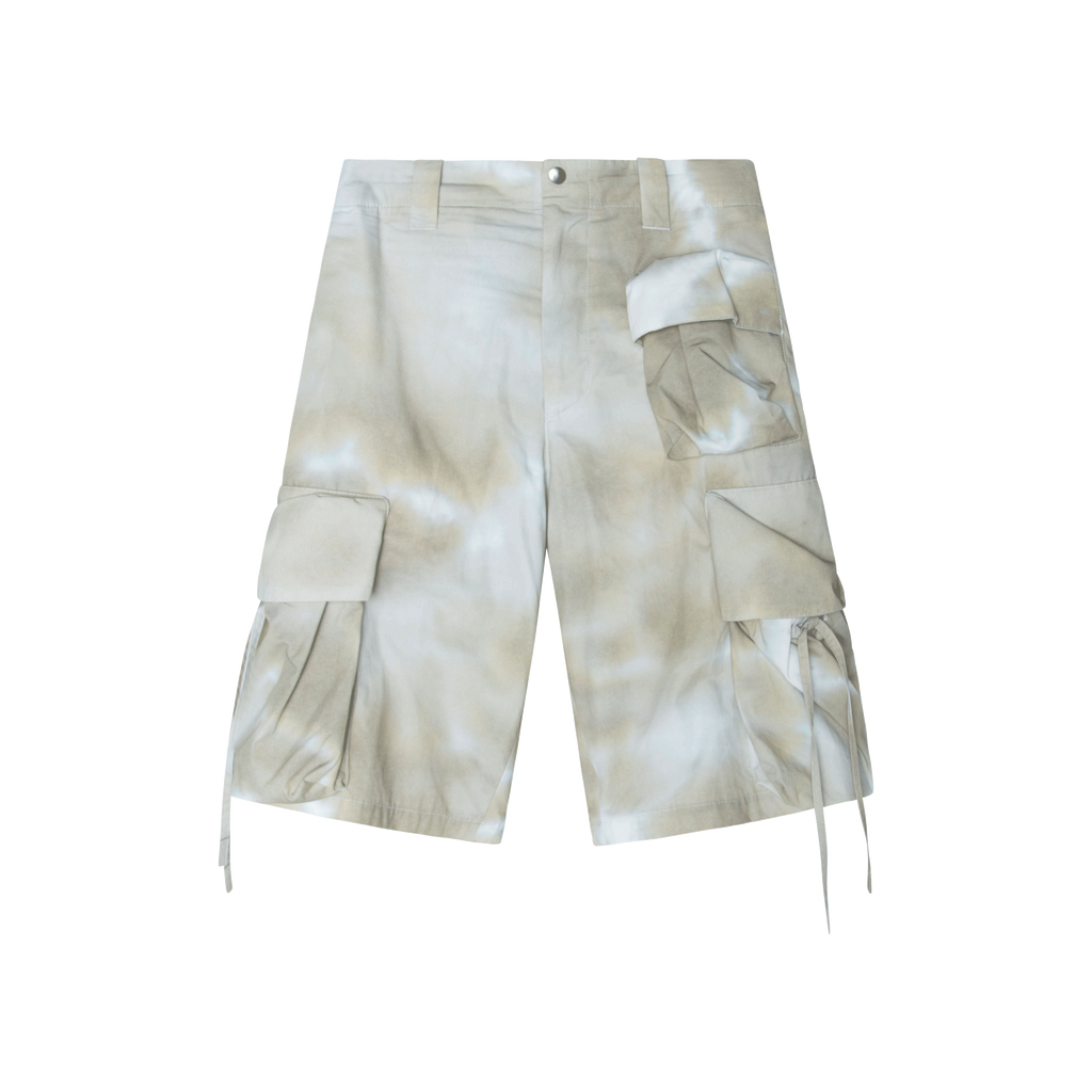 OAMC Puff Wide Leg Cargo Shorts features elasticated waistband, belt loops, 2 side flap pockets, rear patch pocket, wide leg, and knee length.