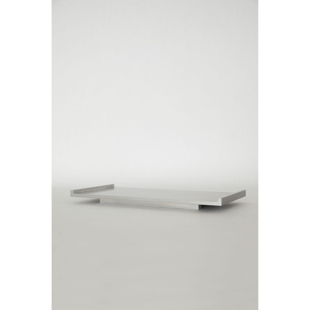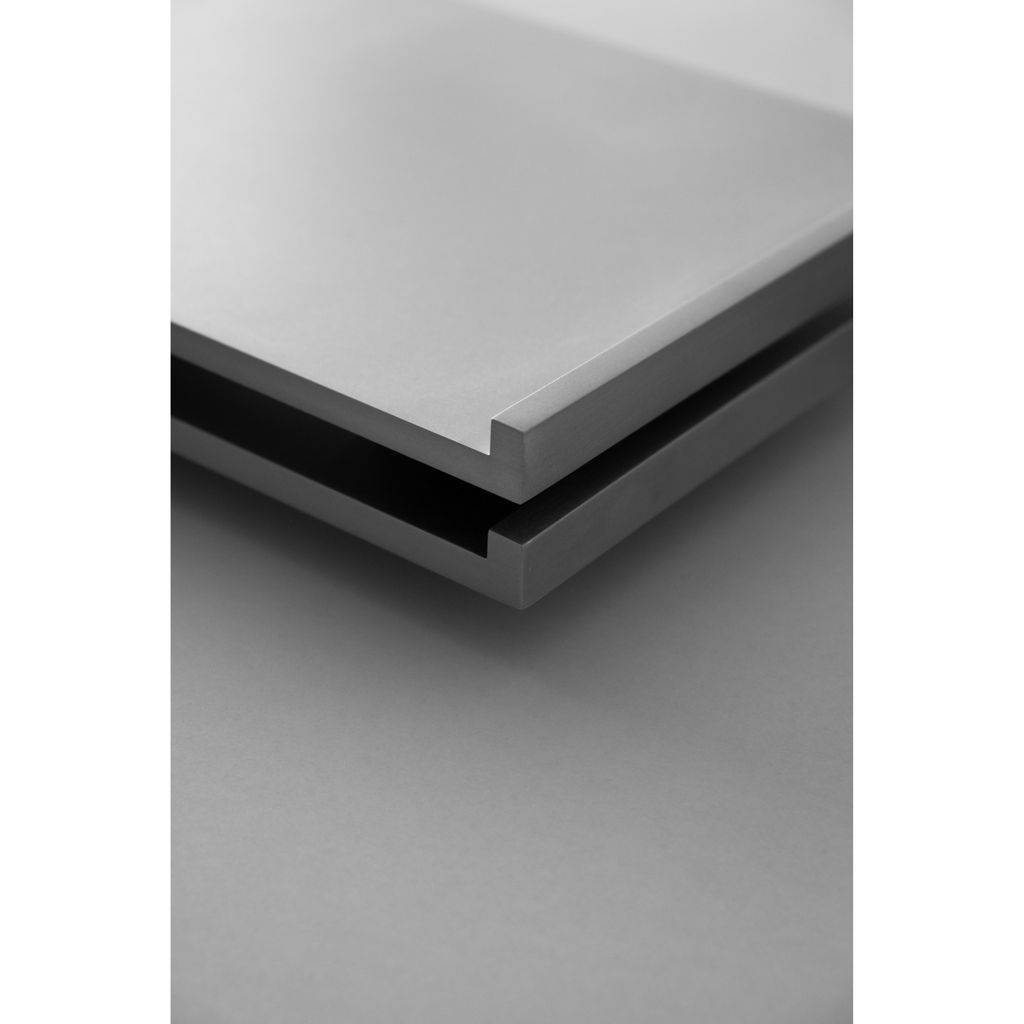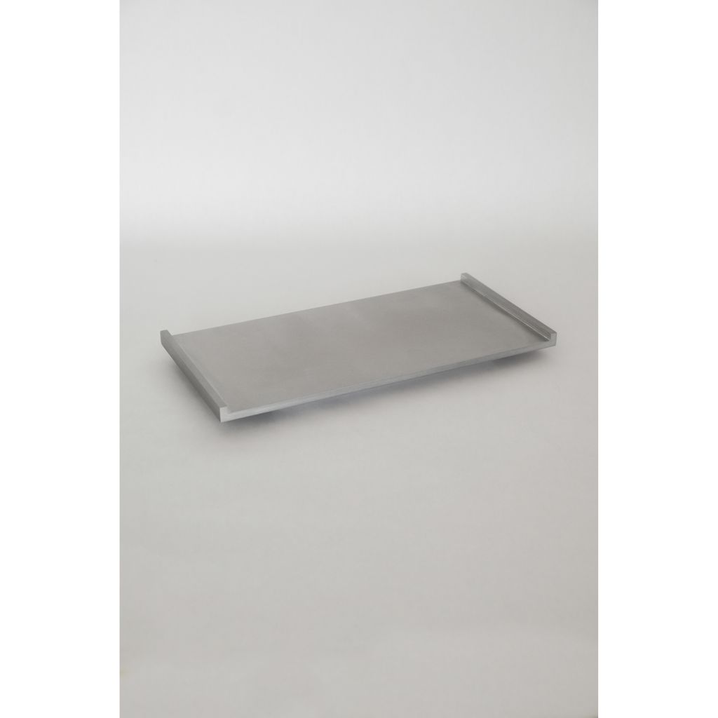 Milled from a single piece of aluminum, the tray’s inner and outer edges remain visually sharp. The tray sits on two feet, raising it just enough to allow ones fingers to comfortably slide underneath the tray and lift from the bottom. Additionally, the raised edges offer an ergonomic hold for fingers while moving the tray from surface to surface.
