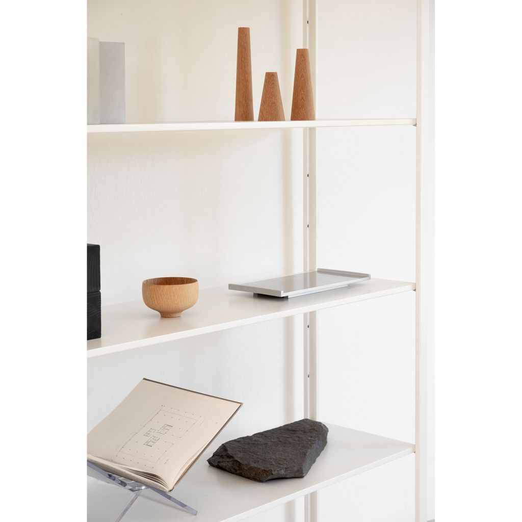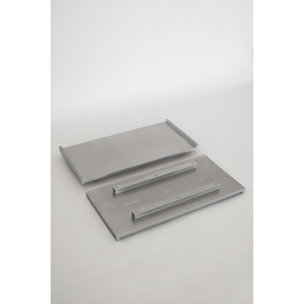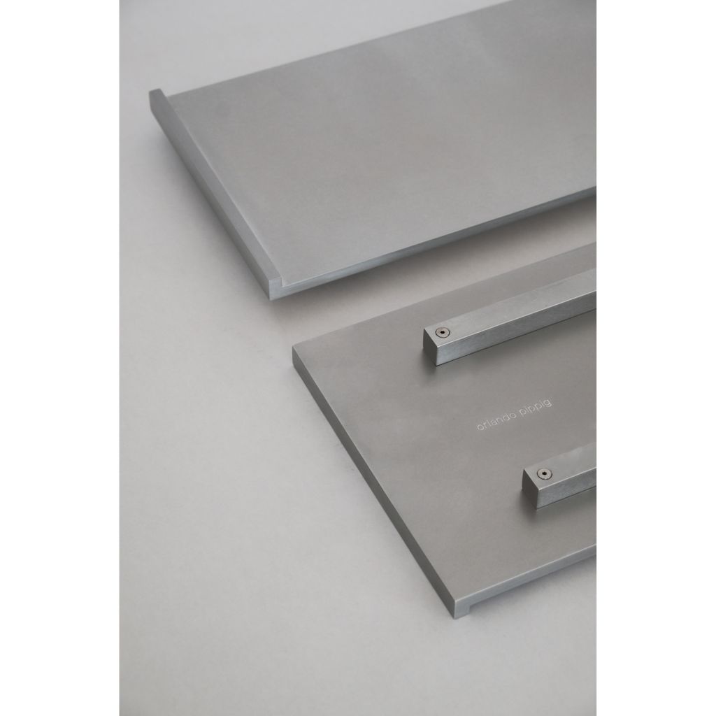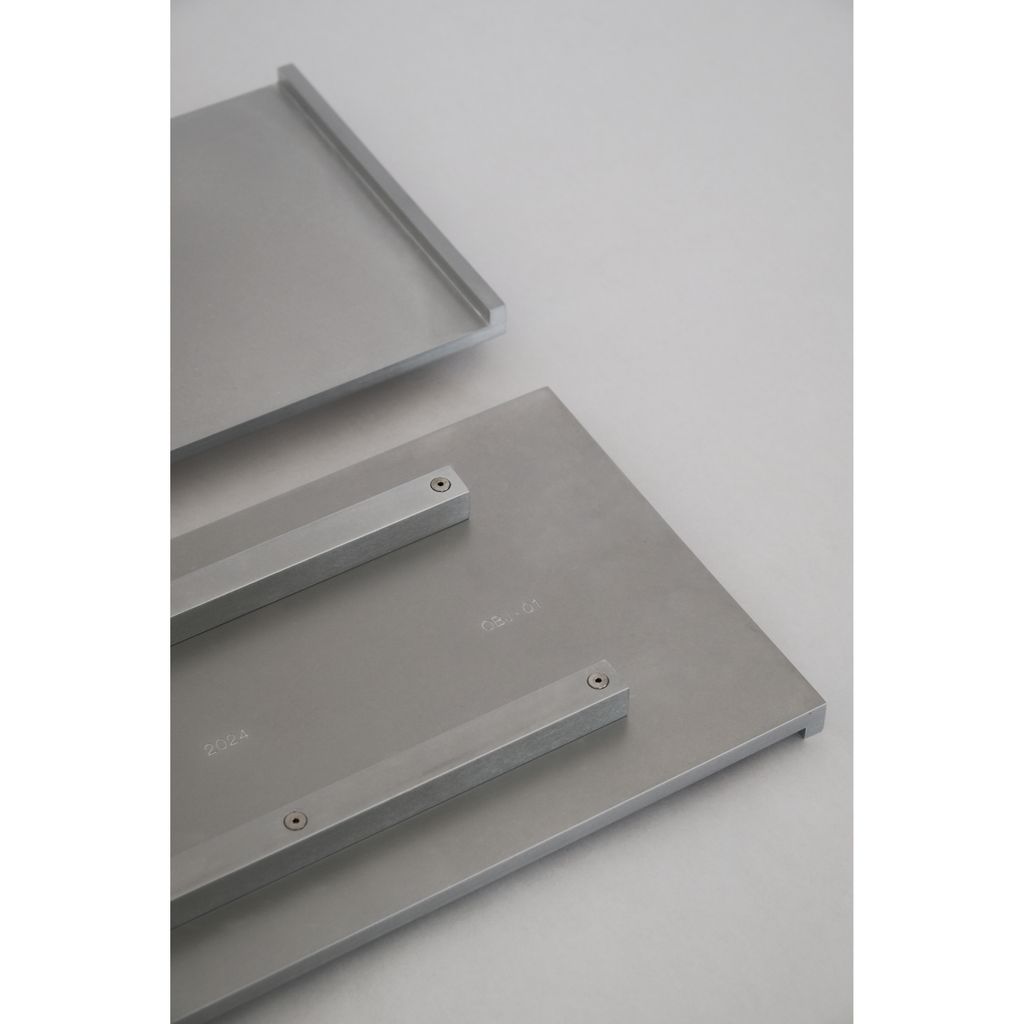 Milled from a single piece of aluminum, the tray’s inner and outer edges remain visually sharp. The tray sits on two feet, raising it just enough to allow ones fingers to comfortably slide underneath the tray and lift from the bottom. Additionally, the raised edges offer an ergonomic hold for fingers while moving the tray from surface to surface.