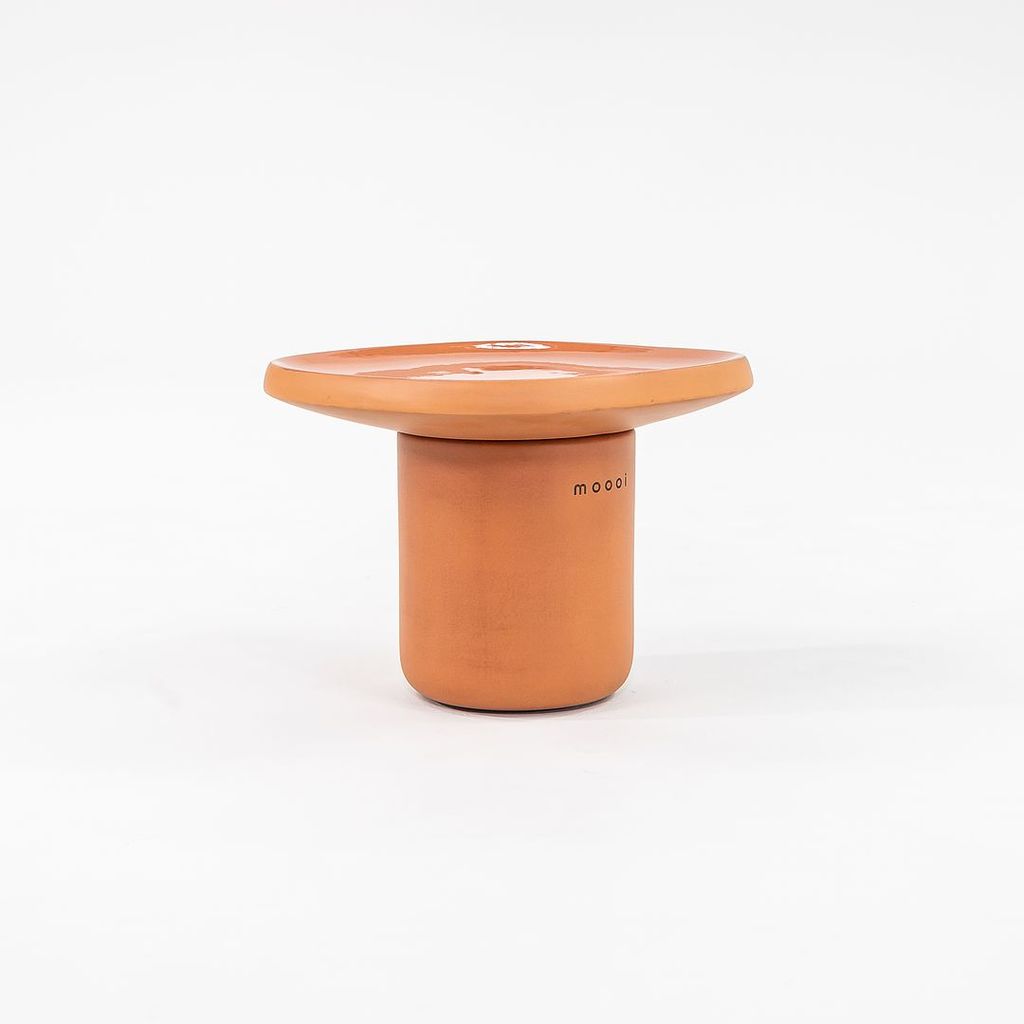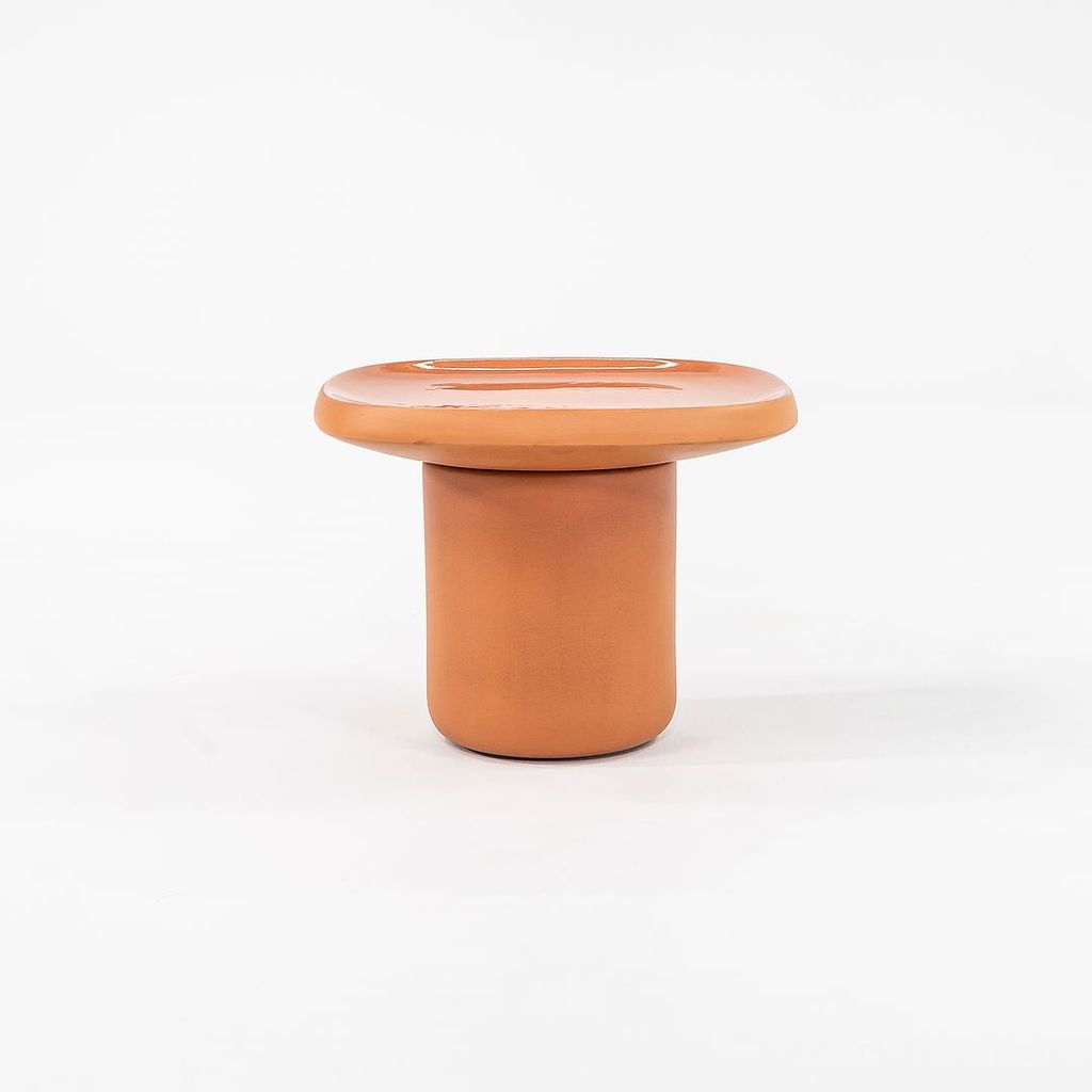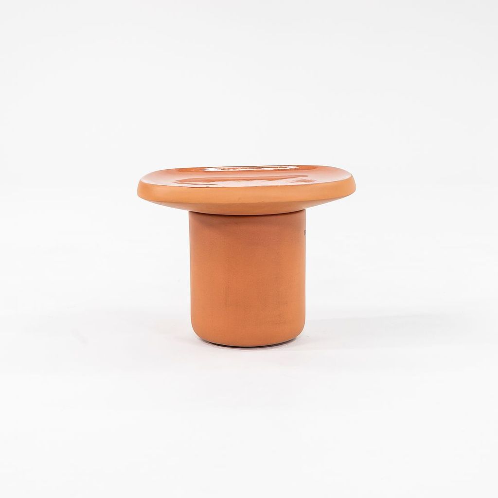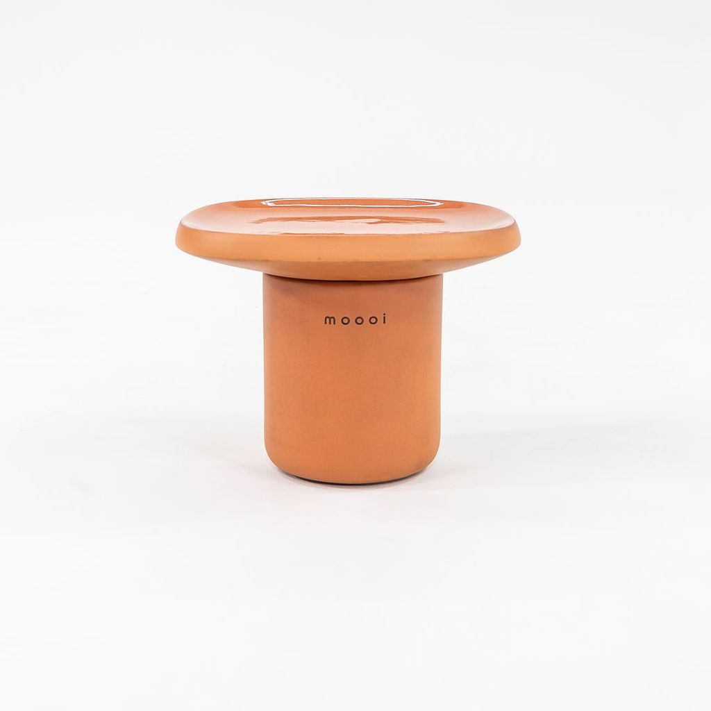 Listed for sale is a single Obon side table (two are available, but they are priced individually) made of terracotta colored ceramic with a glazed top. The table was designed by Simone Bonanni and produced by Moooi in the Netherlands. It dates to circa 2022 and is guaranteed as authentic. Condition is very good to excellent. One table has a small hole on the underside of the table top. See photos.