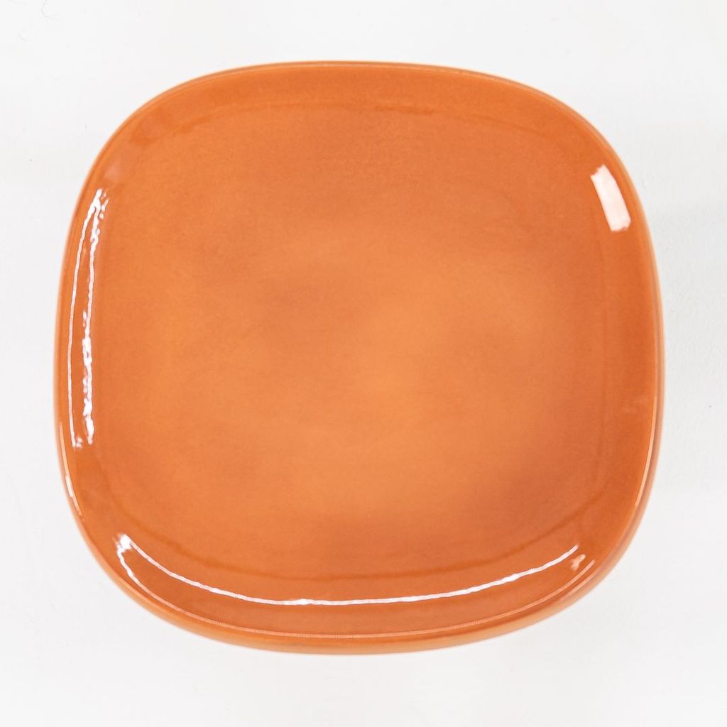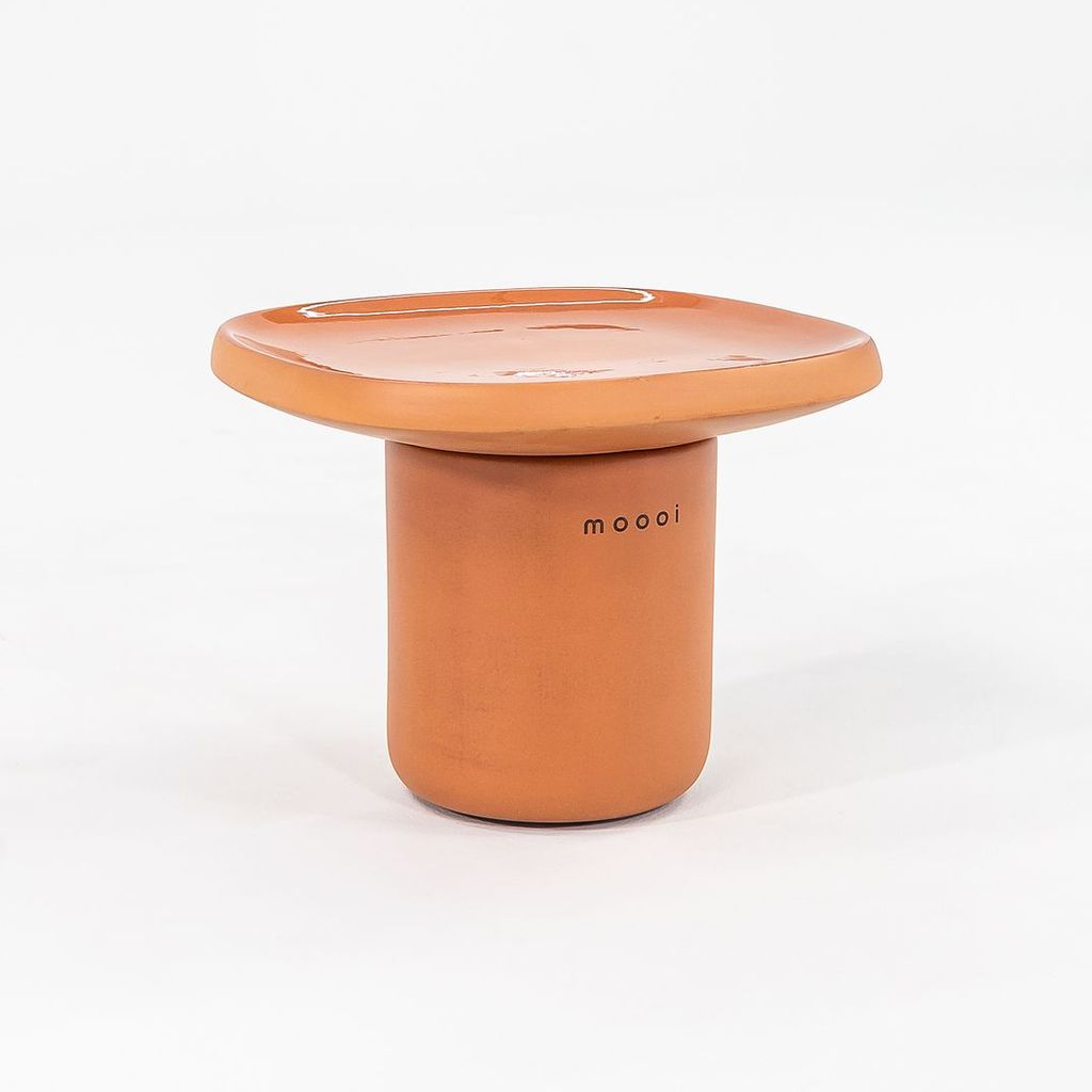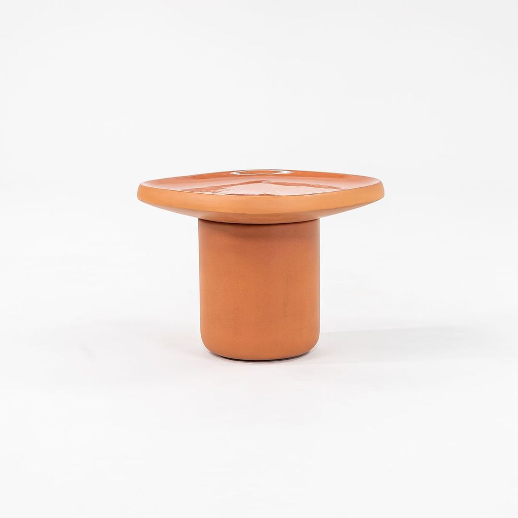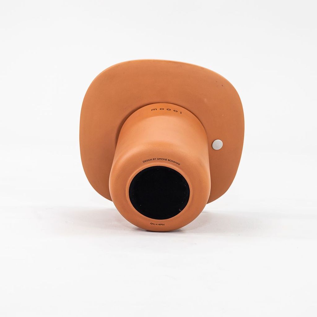 Listed for sale is a single Obon side table (two are available, but they are priced individually) made of terracotta colored ceramic with a glazed top. The table was designed by Simone Bonanni and produced by Moooi in the Netherlands. It dates to circa 2022 and is guaranteed as authentic. Condition is very good to excellent. One table has a small hole on the underside of the table top. See photos.