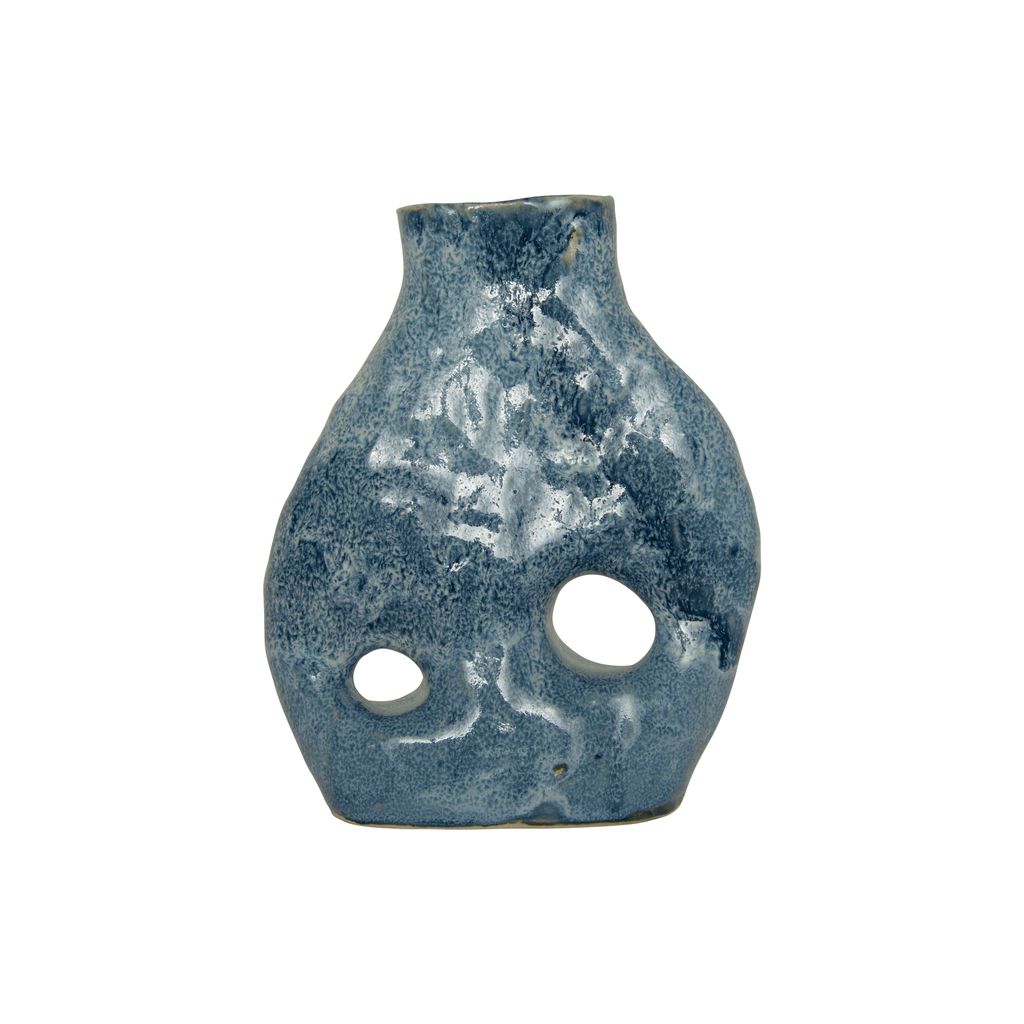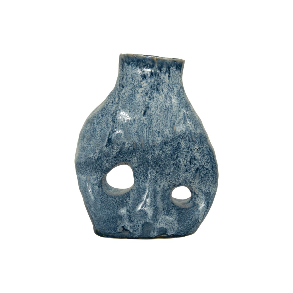 Ocean Vase features 2 circle cut out designs and blue glaze.