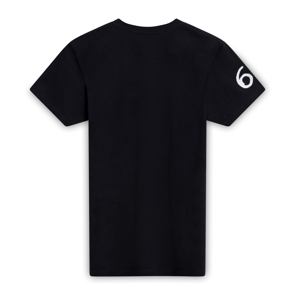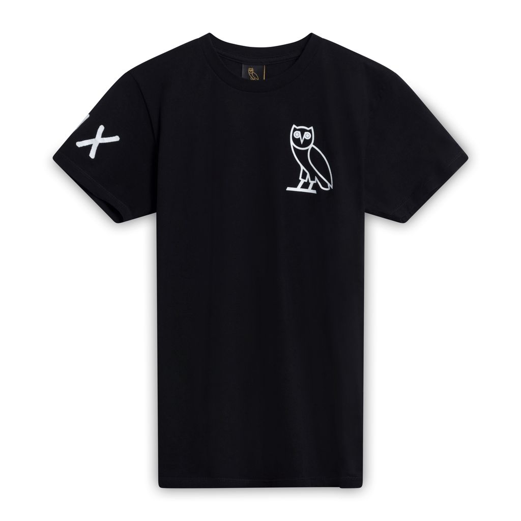 Black t-shirt with the white OVO owl logo on the left chest and the numbers 6IX on the right sleeve.