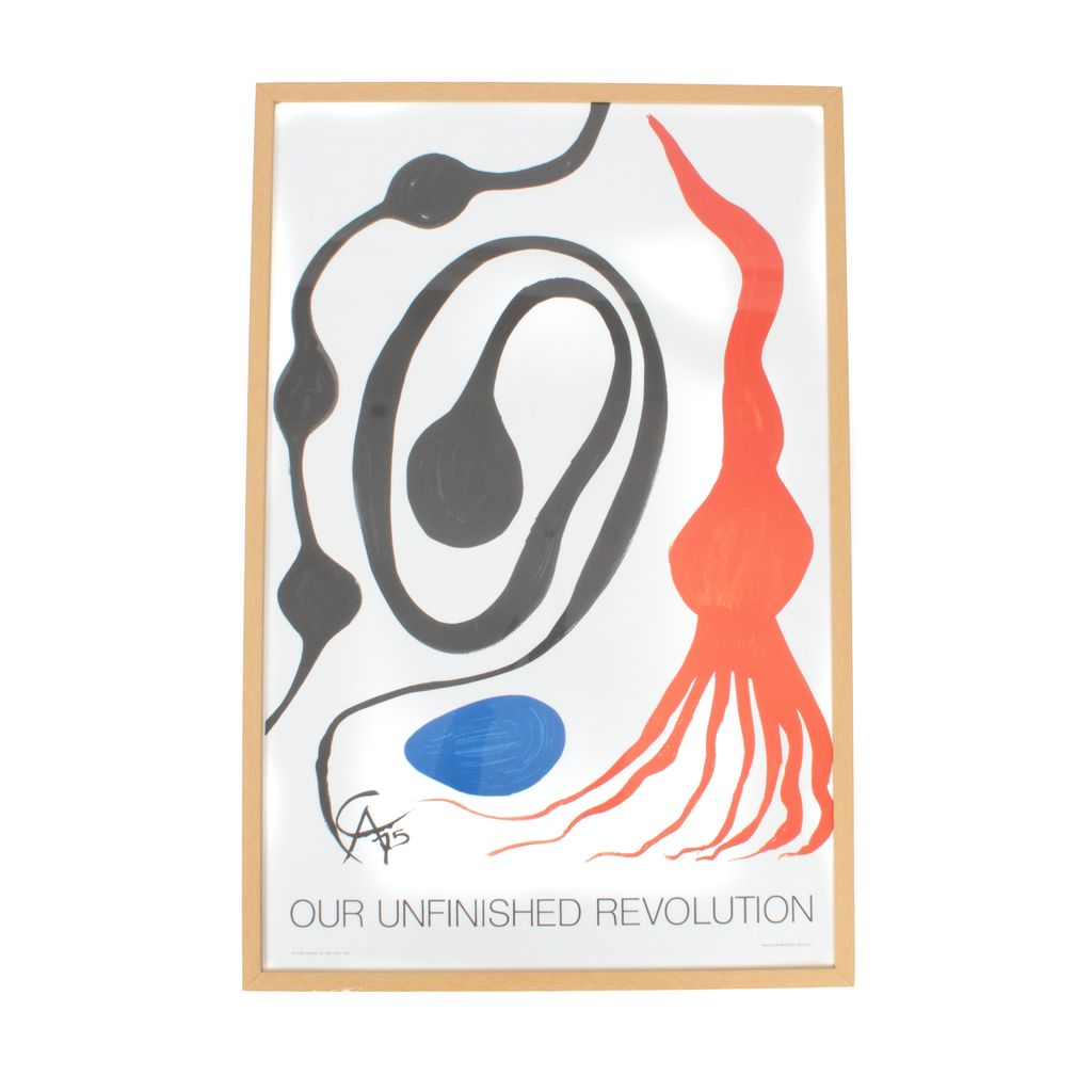 One of ten lithographs included in Alexander Calder’s Our Unfinished Revolution portfolio of 1975 – 1976, “Octopus” tackles a subject familiar to the artist in his characteristically simplified, brightly-colored style. The portfolio, which contained several abstract geometric works in a similar style as well as other more detailed depictions of animals (and one work depicting the sun), was produced in a limited edition of 175 printed by famed Parisian house Mourlot and published by Alba Editions, Inc.