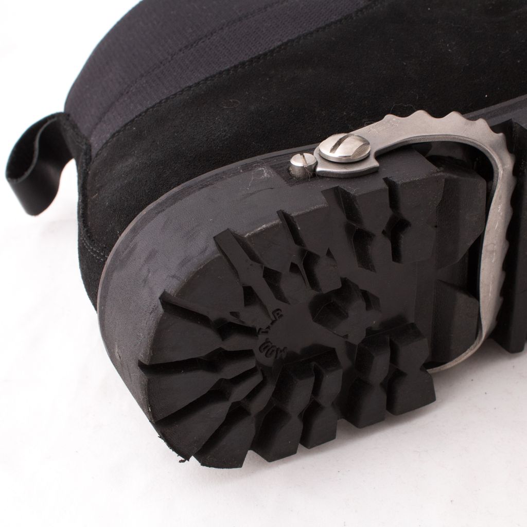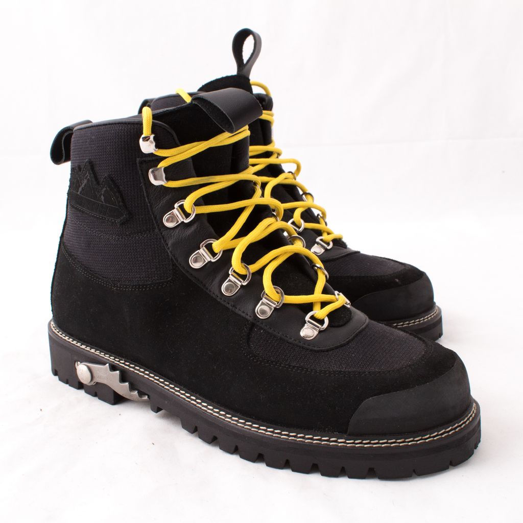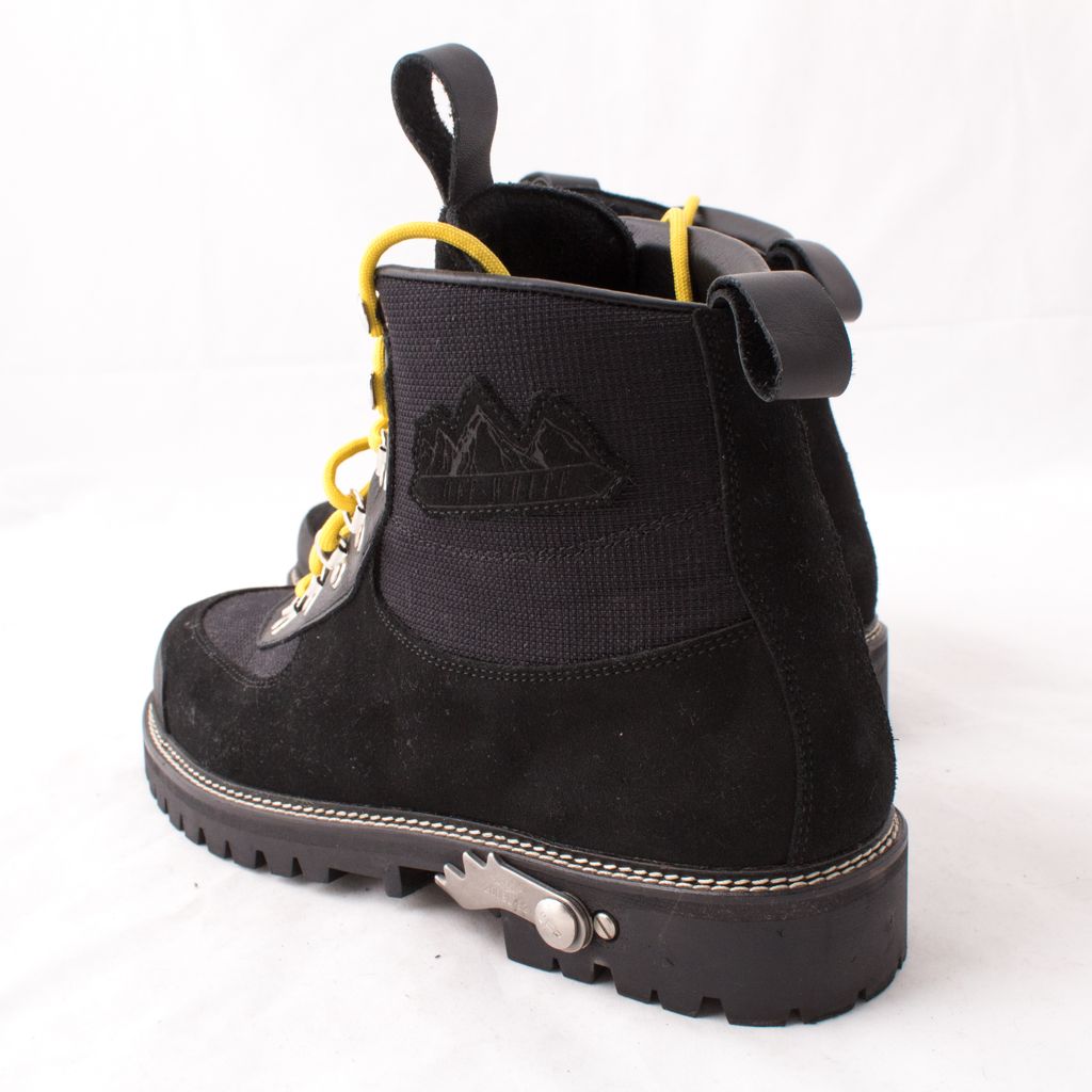 Practically brand new men's hiking boot from OFF-WHITE C/O VIRGIL ABLOH. Boots are constructed of black suede and canvas. Fashioned with bright yellow laces that wrap around the ankle, the boots feature a rugged lug sole accented with a silvertone spur. Lined with leather. Removable leather insole.