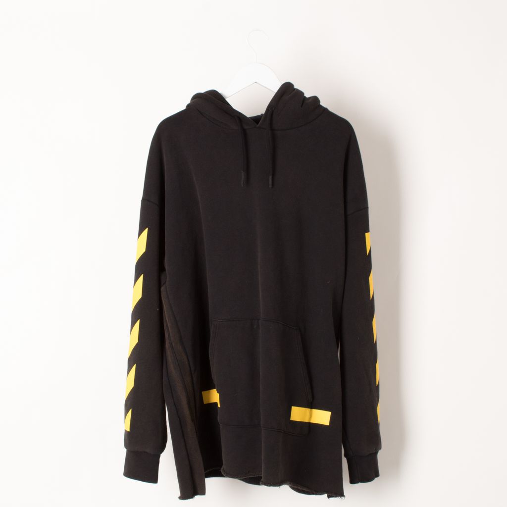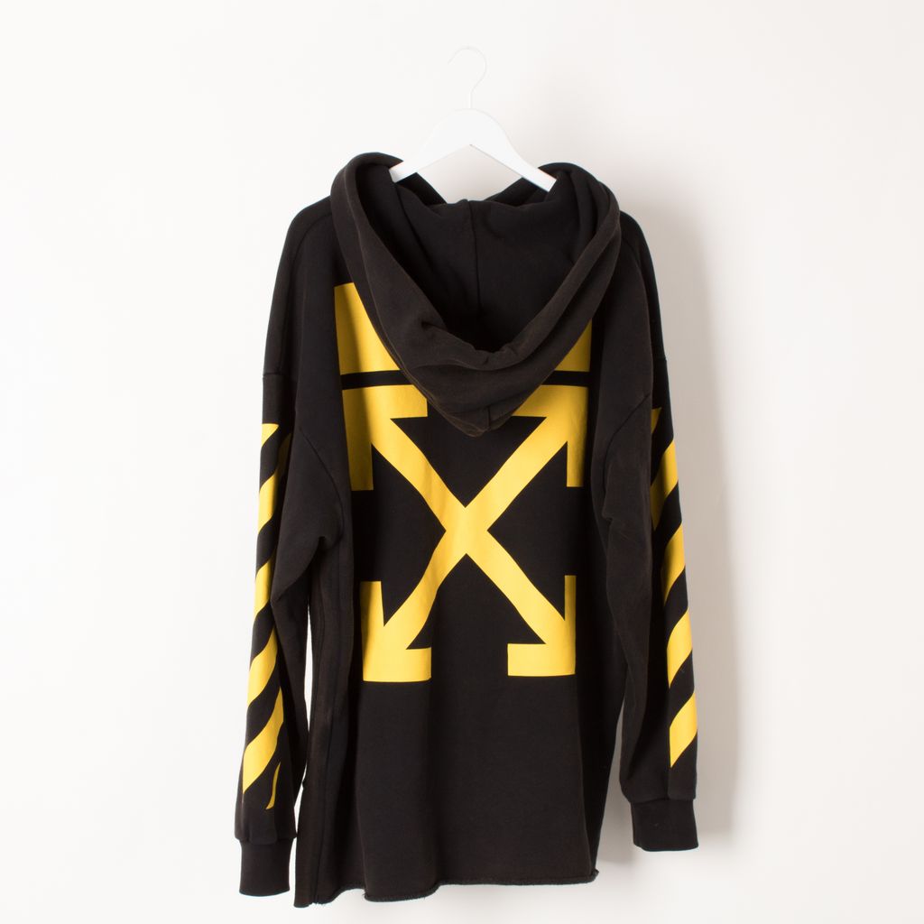In fair condition, black diagonal arrow hoodie from Off White. Long sleeve French terry hoodie in black. Fading throughout. Tonal drawstring at hood. Kangaroo pocket at waist. Graphics printed in yellow at front hem, sleeves, and back. Logo patch at cuff. Before purchasing review photos, some discoloration present throughout hoodie.