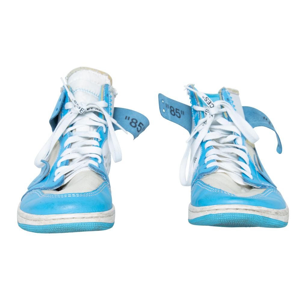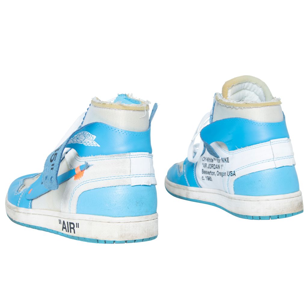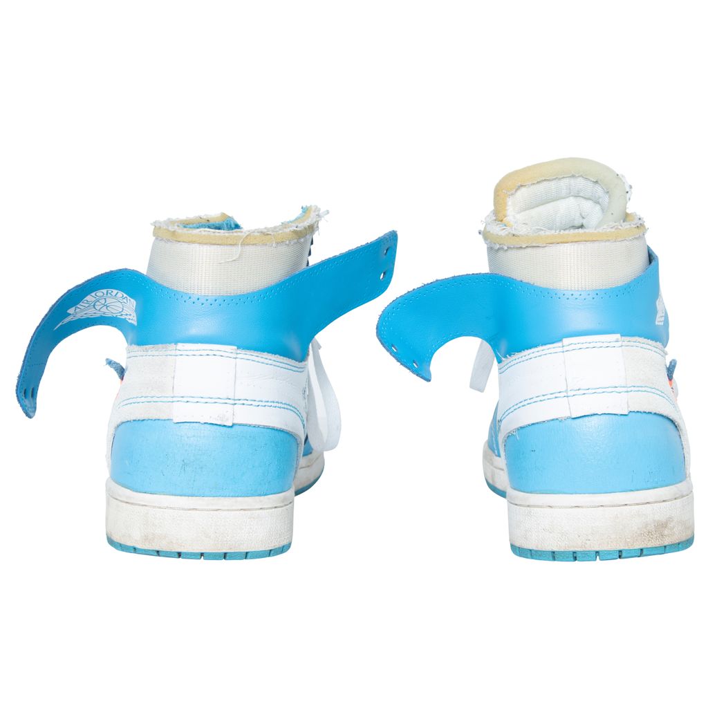 Off-White x Air Jordan 1 Retro High OG "UNC" feature rubber sole, round toe, color block pattern, and blue leather