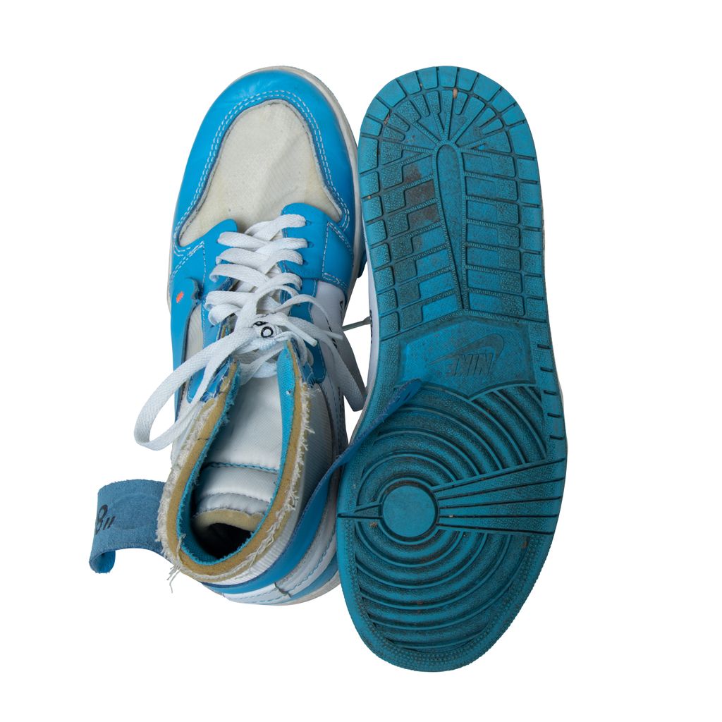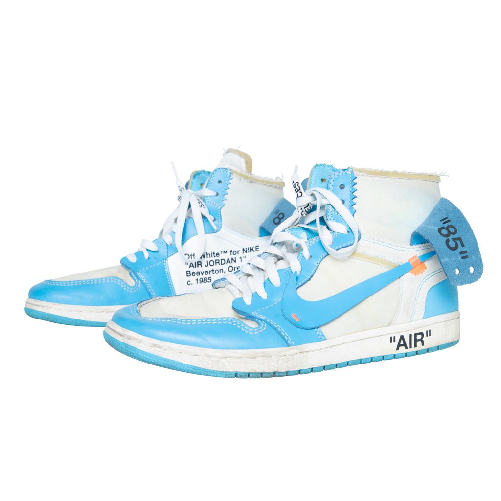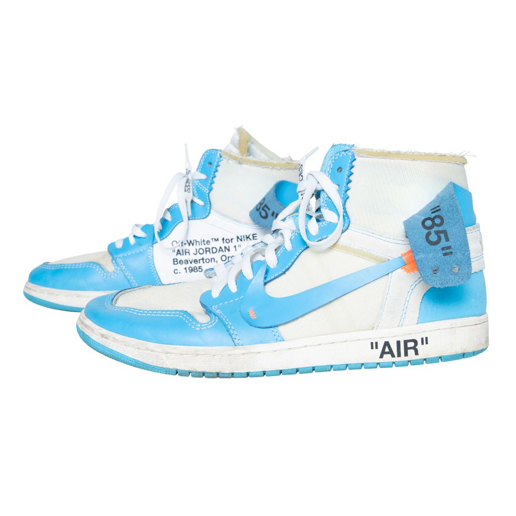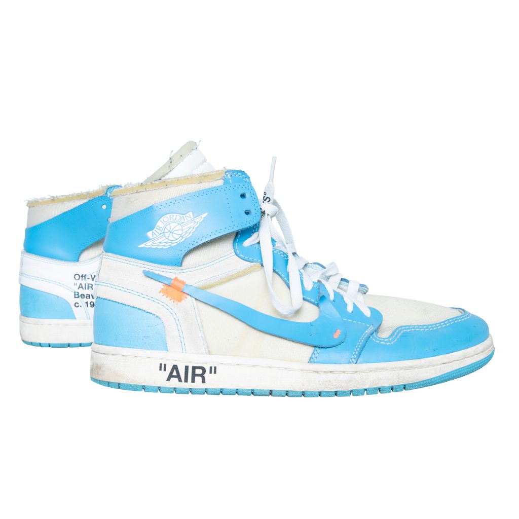 Off-White x Air Jordan 1 Retro High OG "UNC" feature rubber sole, round toe, color block pattern, and blue leather