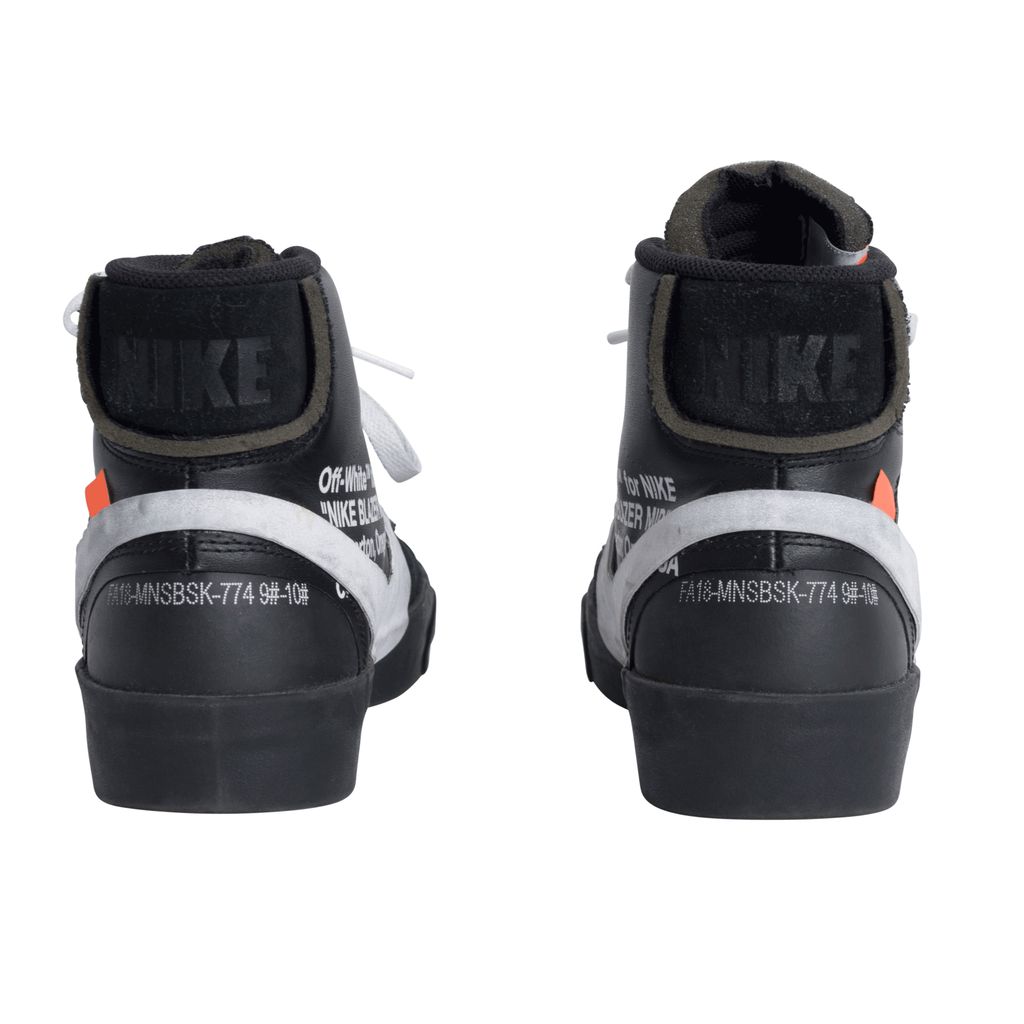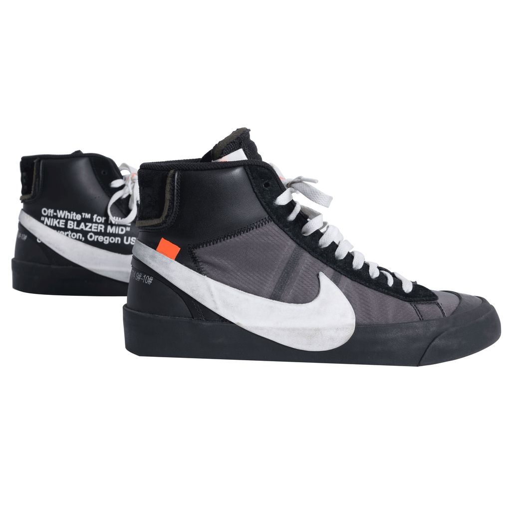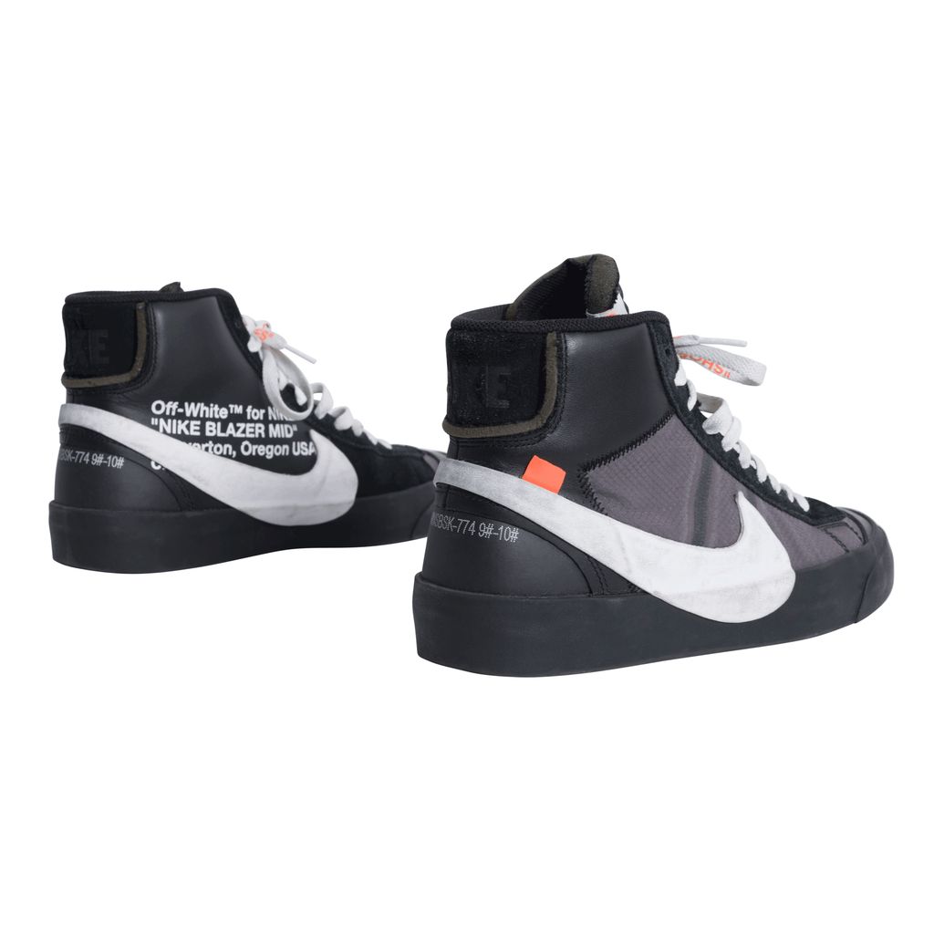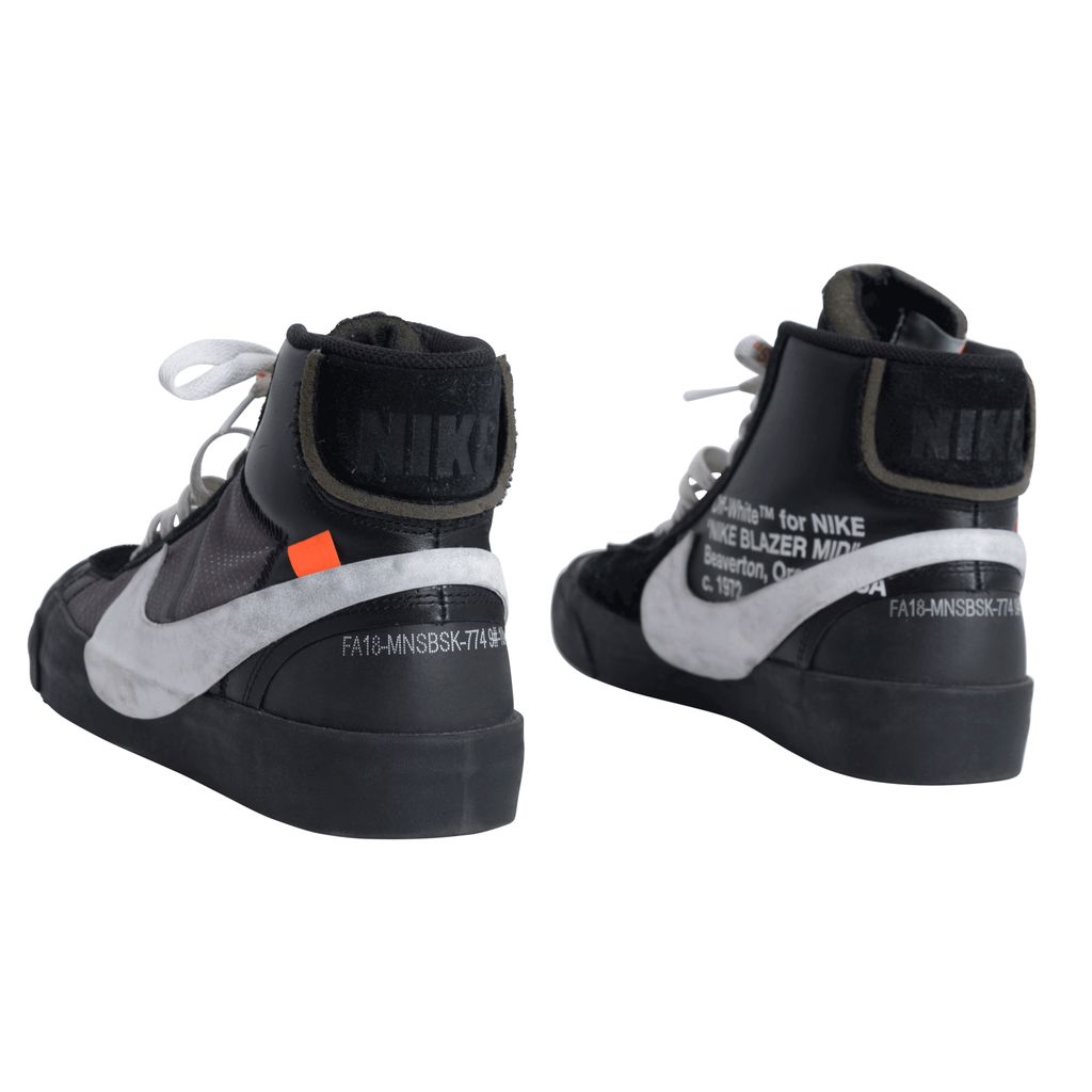 Remodeled for Halloween 2018, the The Off-White x Nike Blazer Mid “Grim Reaper” high-top is an eerie take on an old classic. Black sneakers with a rubber sole, a fabric tongue, and a suede-like material along the eyelets. The classic white Nike check is prominently featured either side of the shoe, with OFF-WHITE's branding printed in white on the inner exterior. Authenticated by the serial number printed on the back of the heel. White shoelaces detailed with neon orange text.