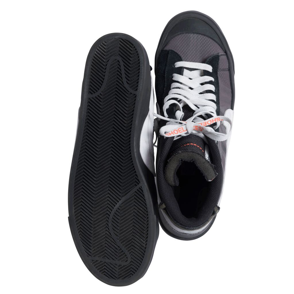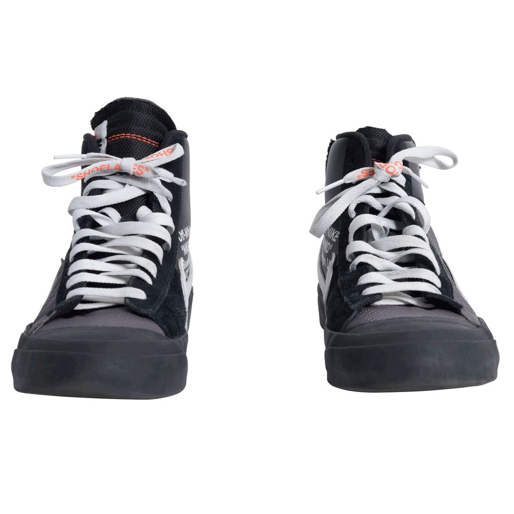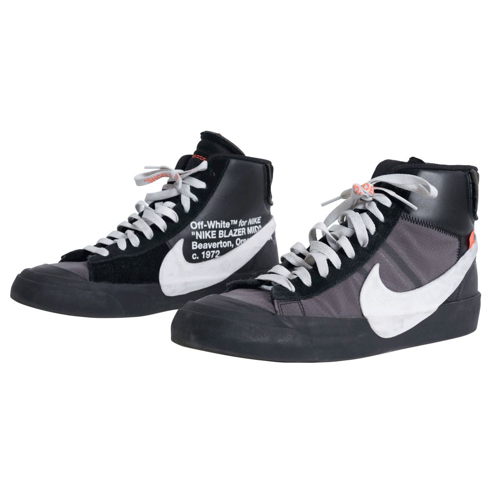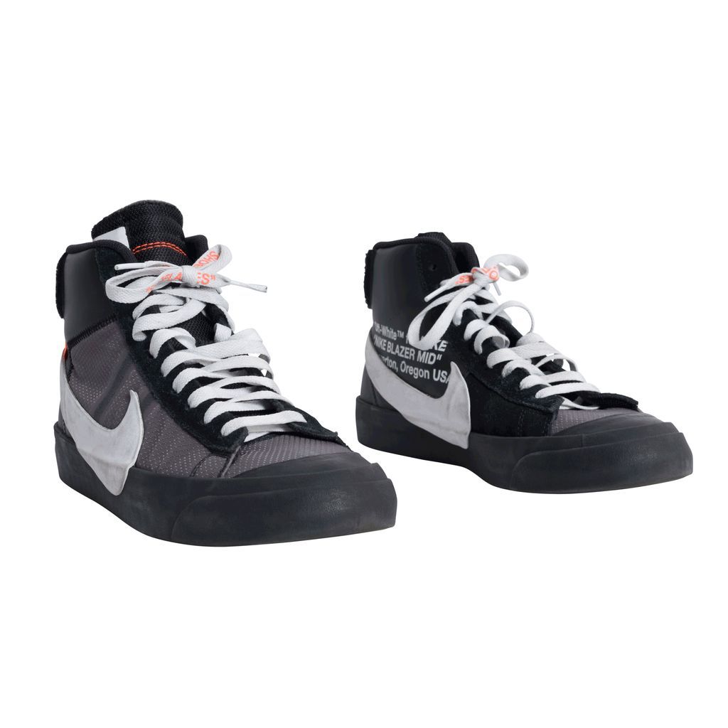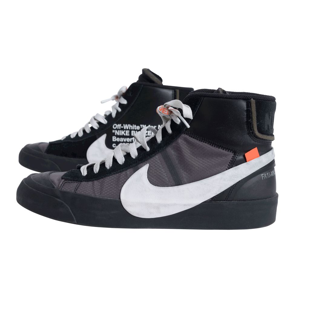 Remodeled for Halloween 2018, the The Off-White x Nike Blazer Mid “Grim Reaper” high-top is an eerie take on an old classic. Black sneakers with a rubber sole, a fabric tongue, and a suede-like material along the eyelets. The classic white Nike check is prominently featured either side of the shoe, with OFF-WHITE's branding printed in white on the inner exterior. Authenticated by the serial number printed on the back of the heel. White shoelaces detailed with neon orange text.