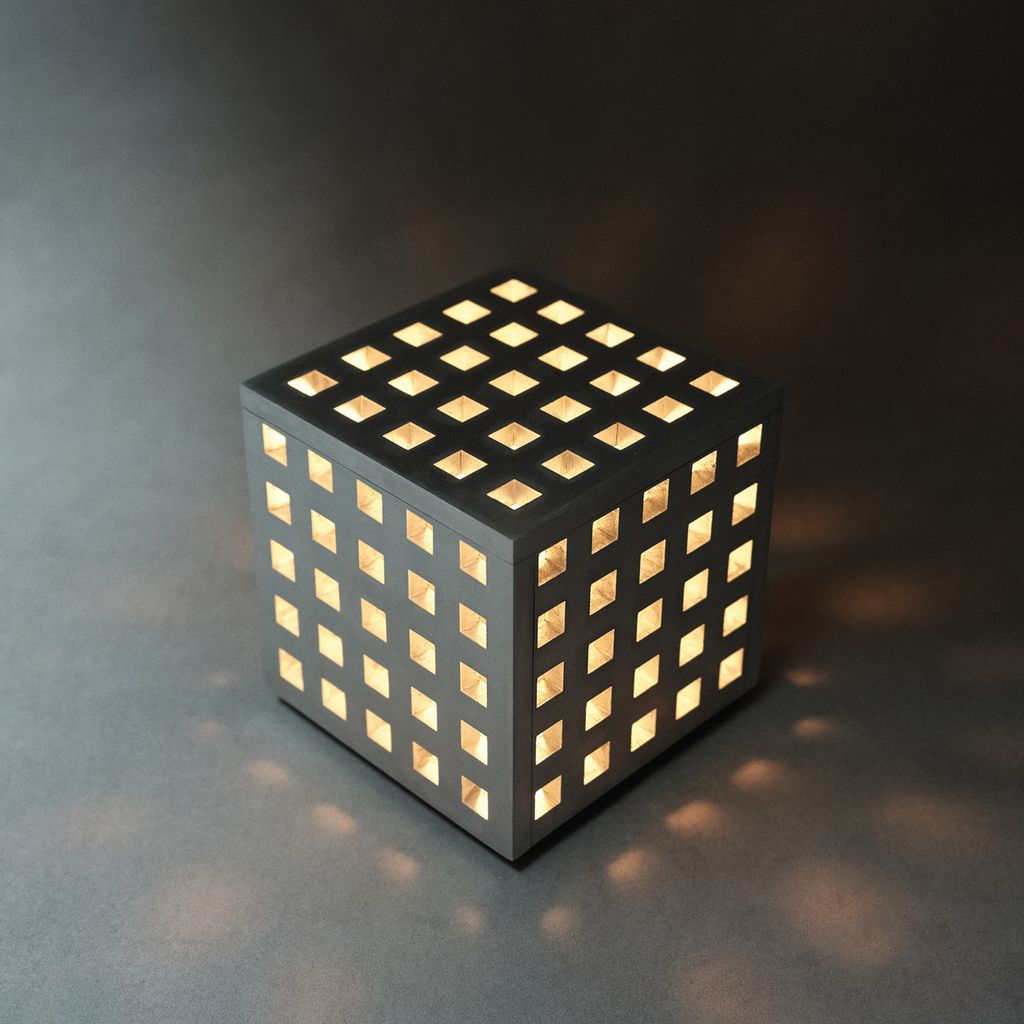 Handmade in Los Angeles from solid 1⁄2-inch-thick honed aluminum, the Office Light is perforated on each face by a field of 1⁄2-inch openings that cast a soft, warm light into a geometric pattern.