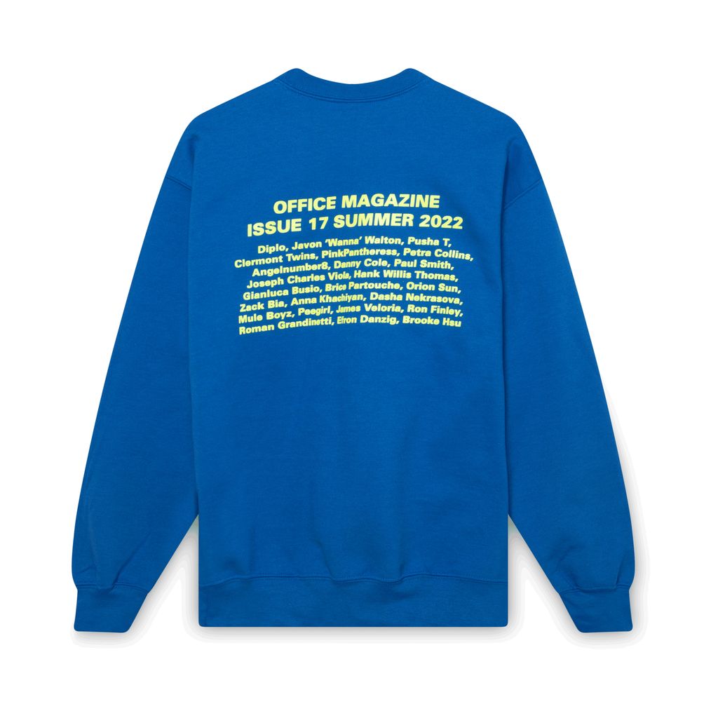 Office Magazine Issue 17 Crewneck in blue features lime green text on the chest and backside.