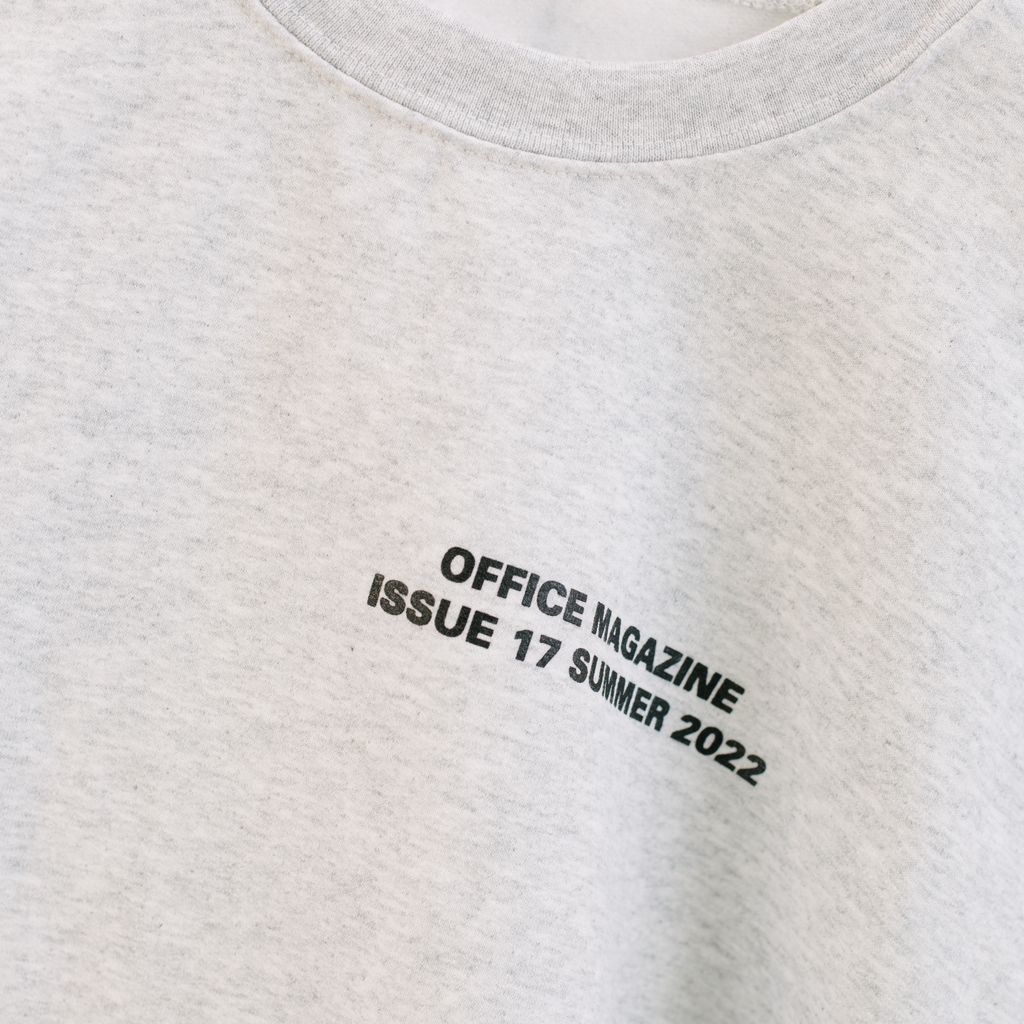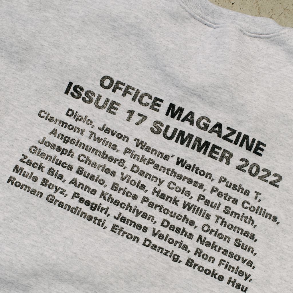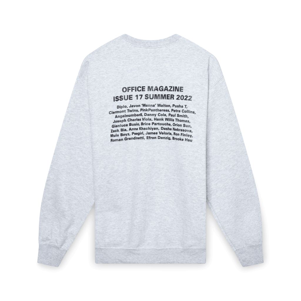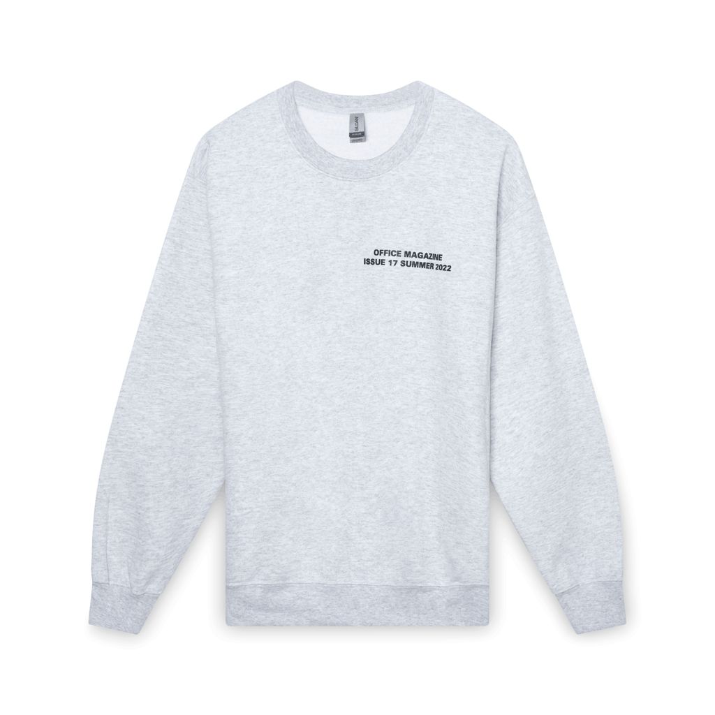 Office Magazine Issue 17 Crewneck in white features black text on the chest and backside.