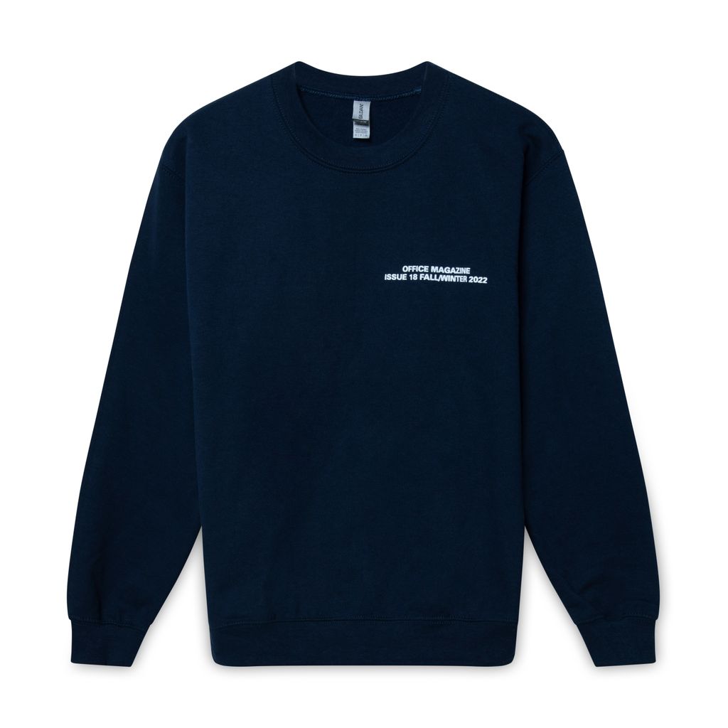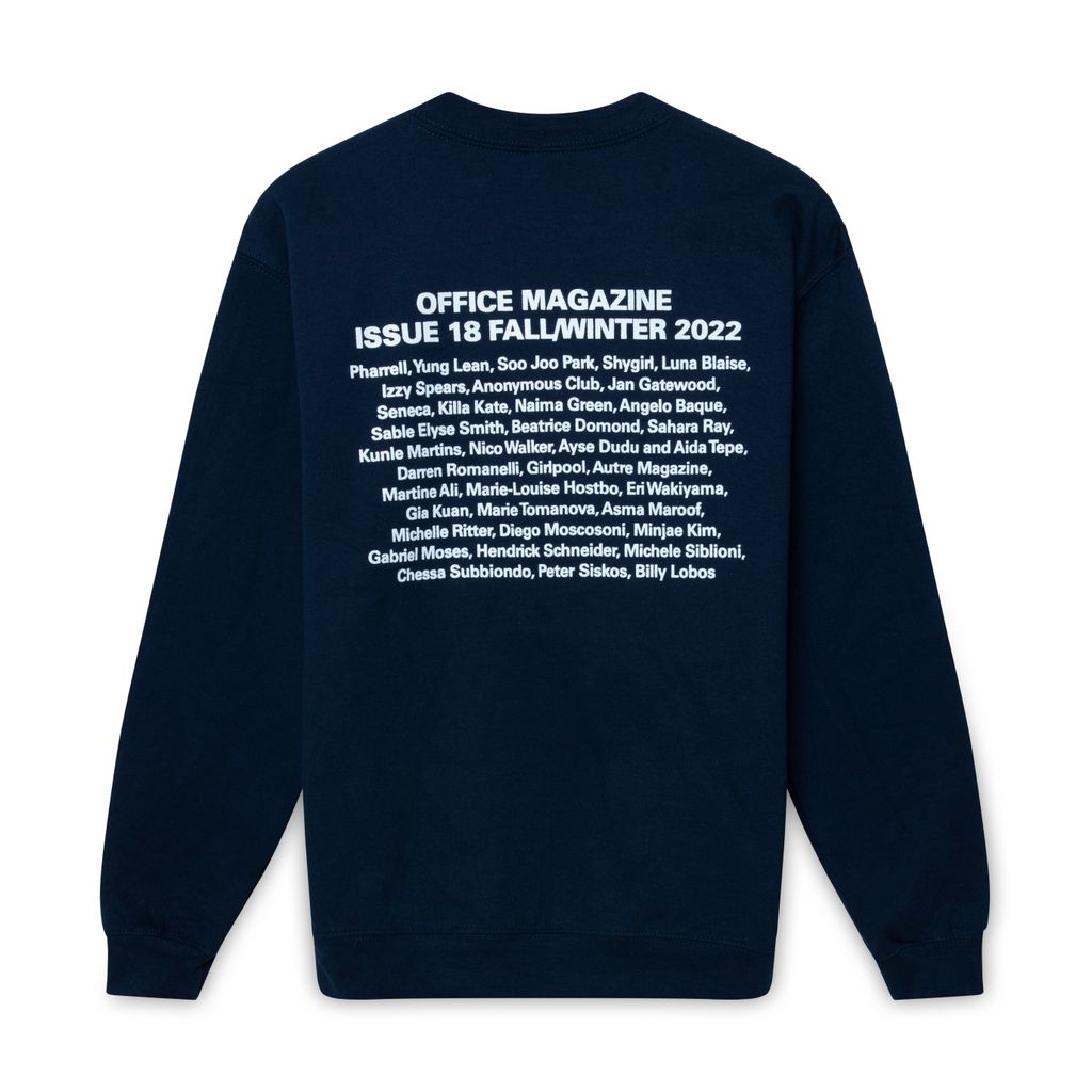 Office Magazine Issue 18 Crewneck in navy features white text on the chest and backside.