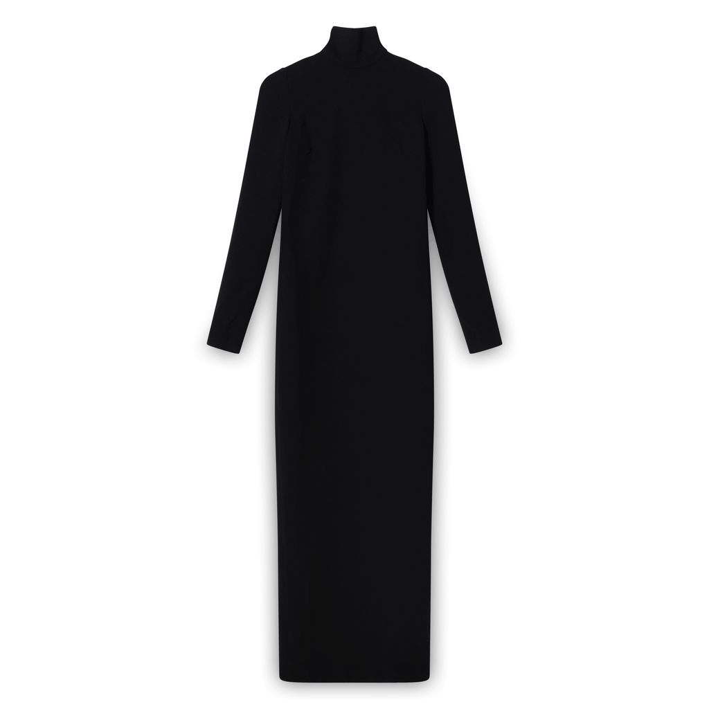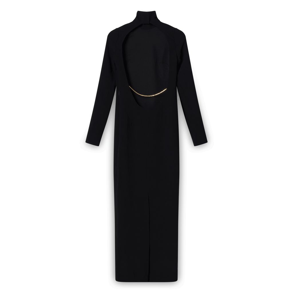 Olenich open-back dress features long sleeves, a high neckline, and a gold chain.