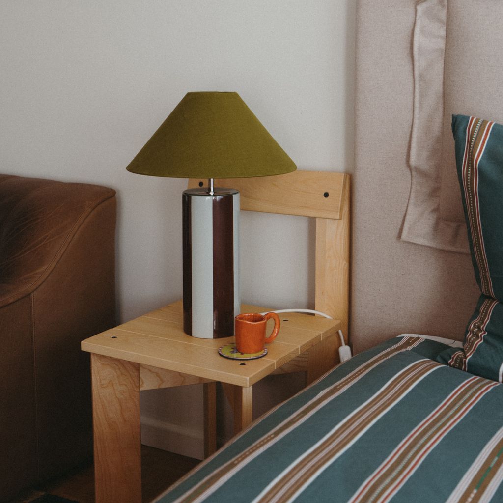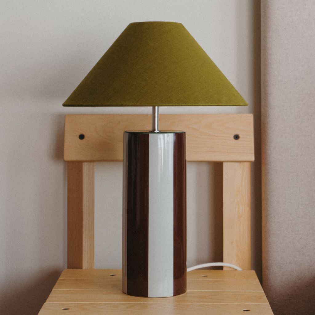 - Base : Earthenware. Chicory Coffee + Green Tint striped pattern & Herbal Green top. Shade : Old Lilac Cotton Twill (Rue Blanche Deadstock fabric)
