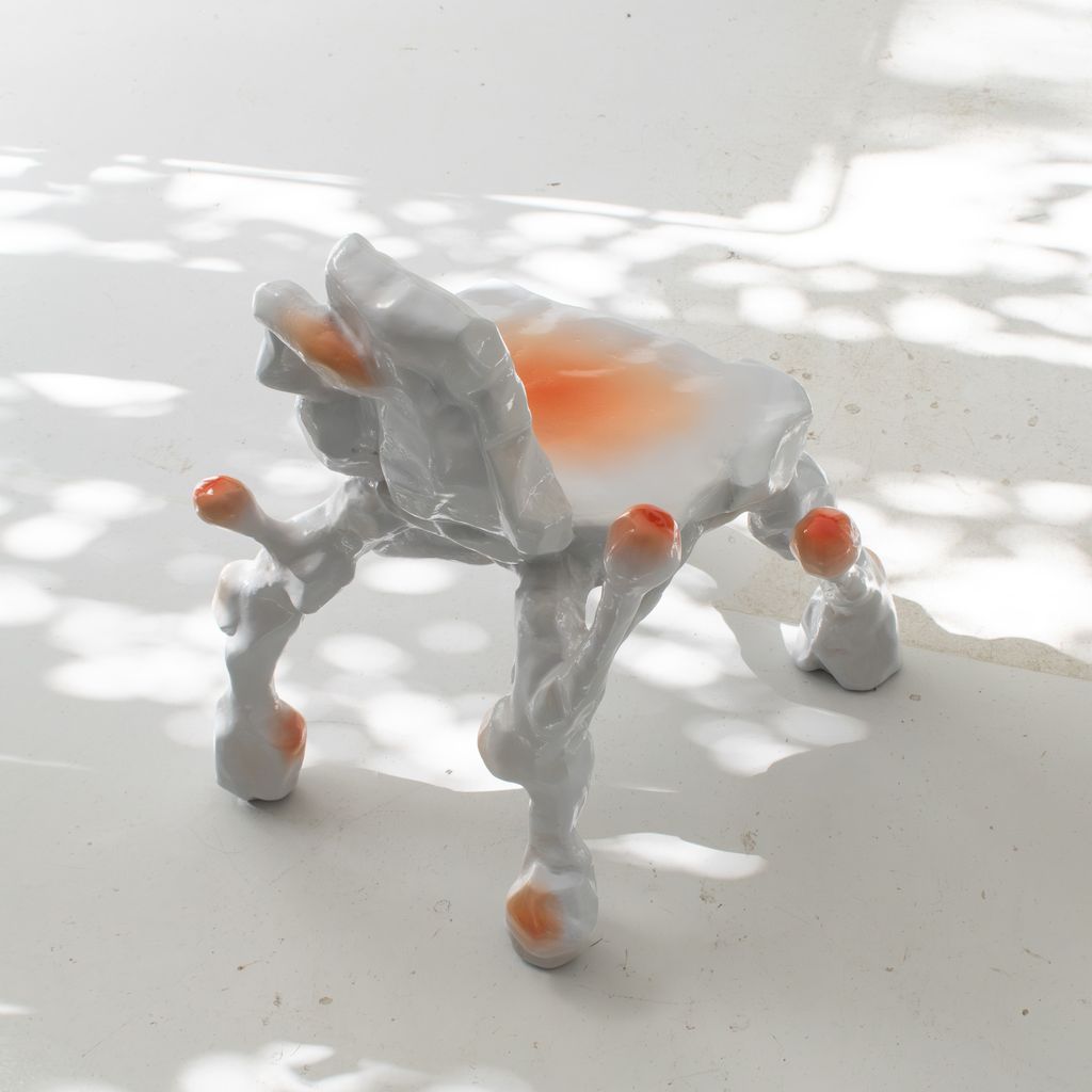 One Thing Led To Another is a handcrafted sculpture born from an exploration of the coexistence between inert matter and organic forms. Its structure evokes a frozen mineral landscape, a rocky surface with irregular contours and neutral tones, upon which orange spores gradually spread and colonize their support.