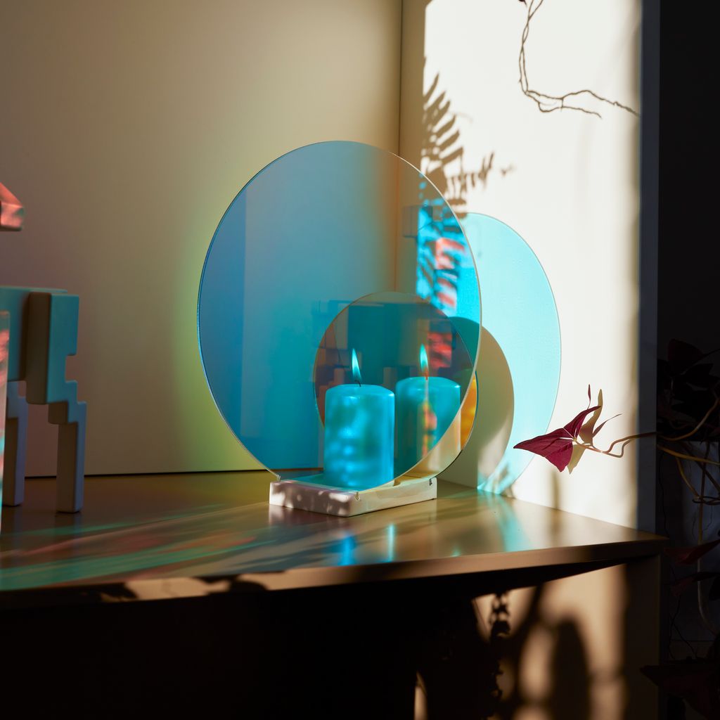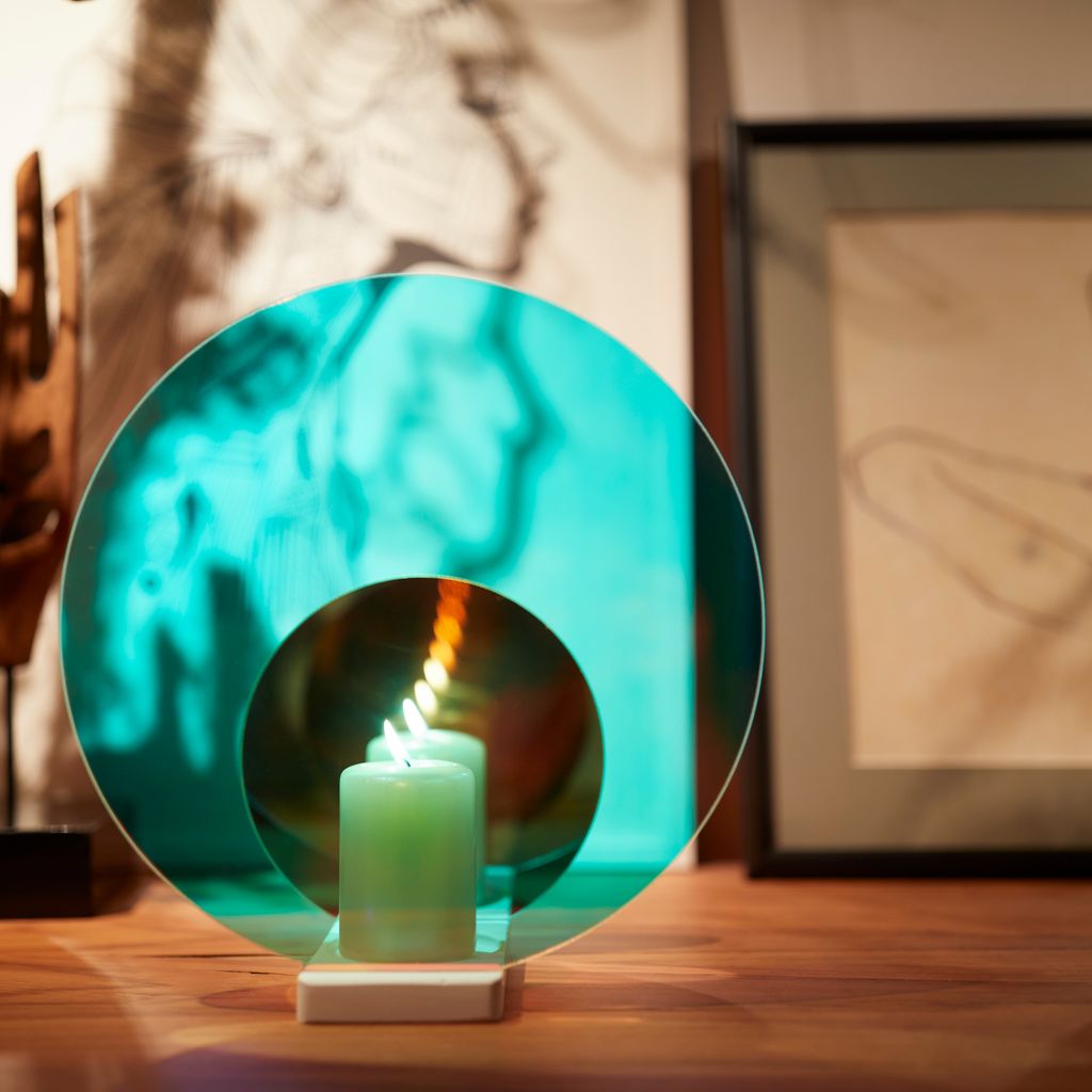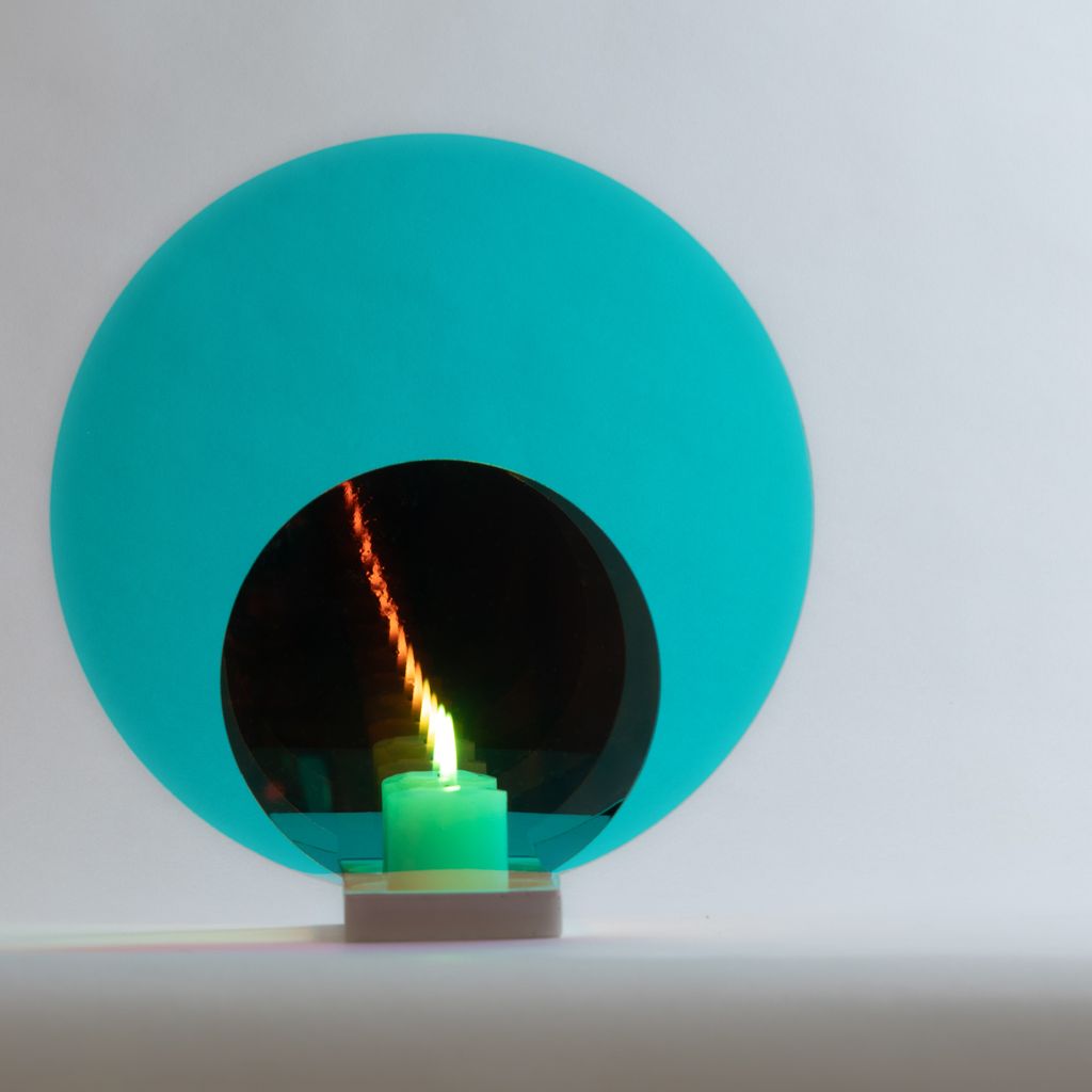 The Concentric M Blaze candleholder displays a fascinating light tunnel effect with endless reflection. The colorful optical filters and mirrors create a halo of concentric light while casting warm hues in the ambient space. The object is a mirror during the day and a unique, atmospheric candleholder at night. Depending on the viewpoint, the colors shift from turquoise blue to amber, while a white, hand-finished marble base grounds the piece.