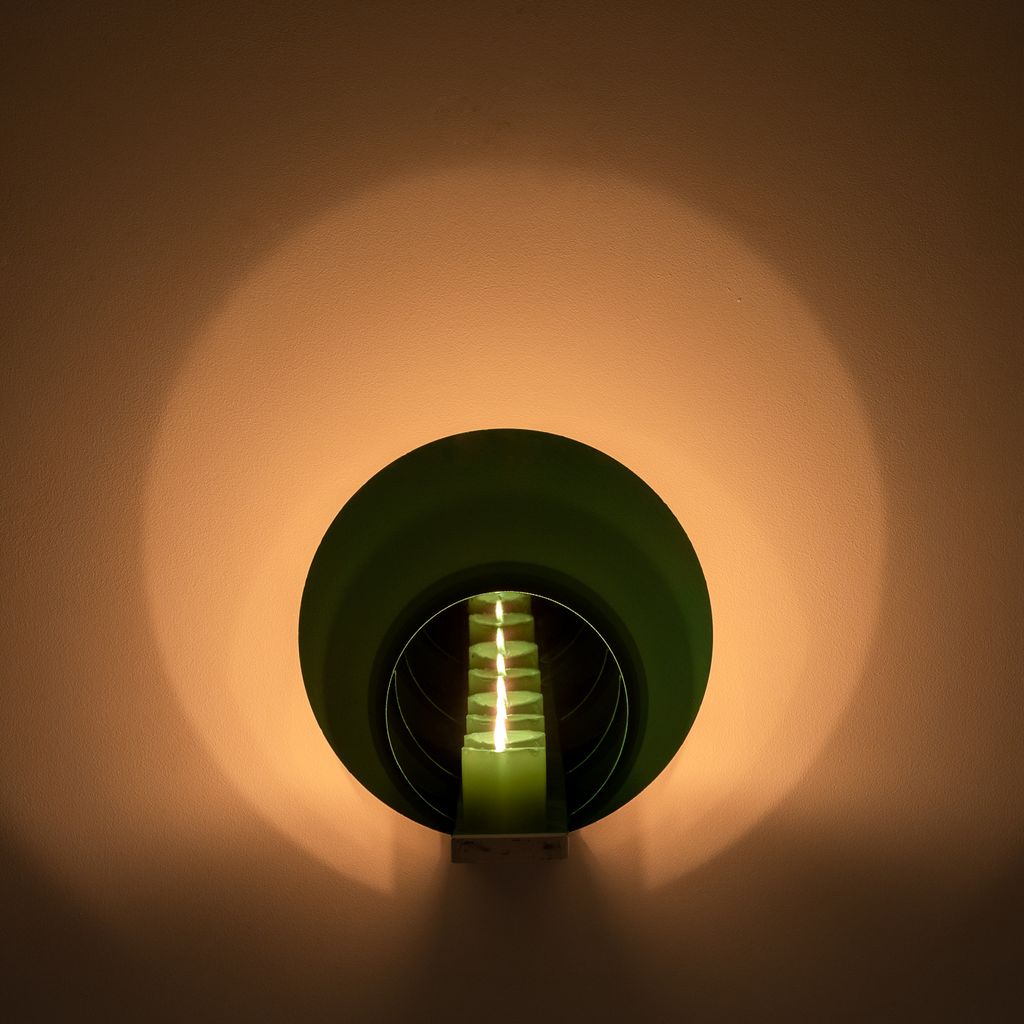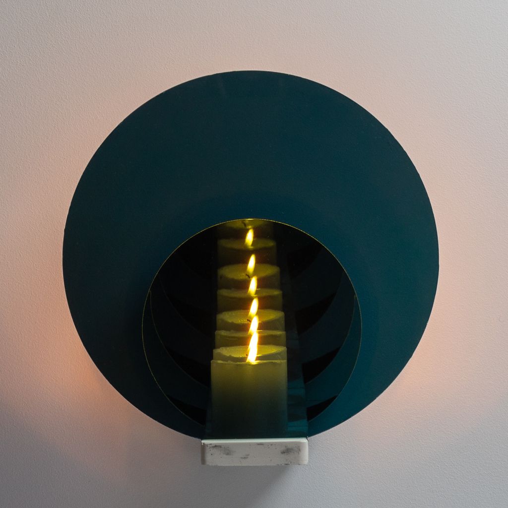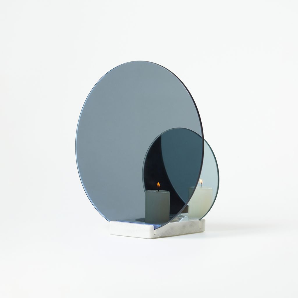 The piece reflects an array of infinitely mirrored flames in gradient shades, while a white hand-finished marble base grounds the piece.