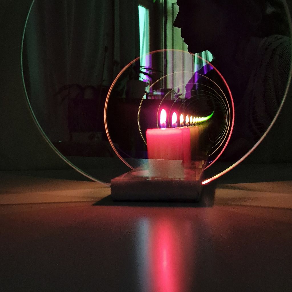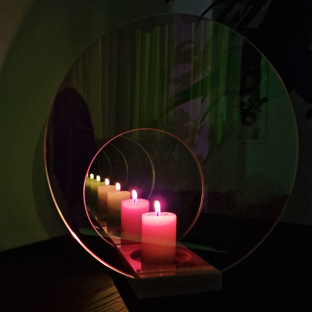 The Concentric Medium Fuchsia candleholder displays a fascinating light tunnel effect with endless reflection. The colorful optical filters and mirrors create a halo of concentric light while casting green hues in the ambient space. The object is a mirror during the day and a unique, atmospheric candleholder at night. Depending on the viewpoint, the colors shift from fuchsia to mint green, while a white hand-finished marble base grounds the piece.