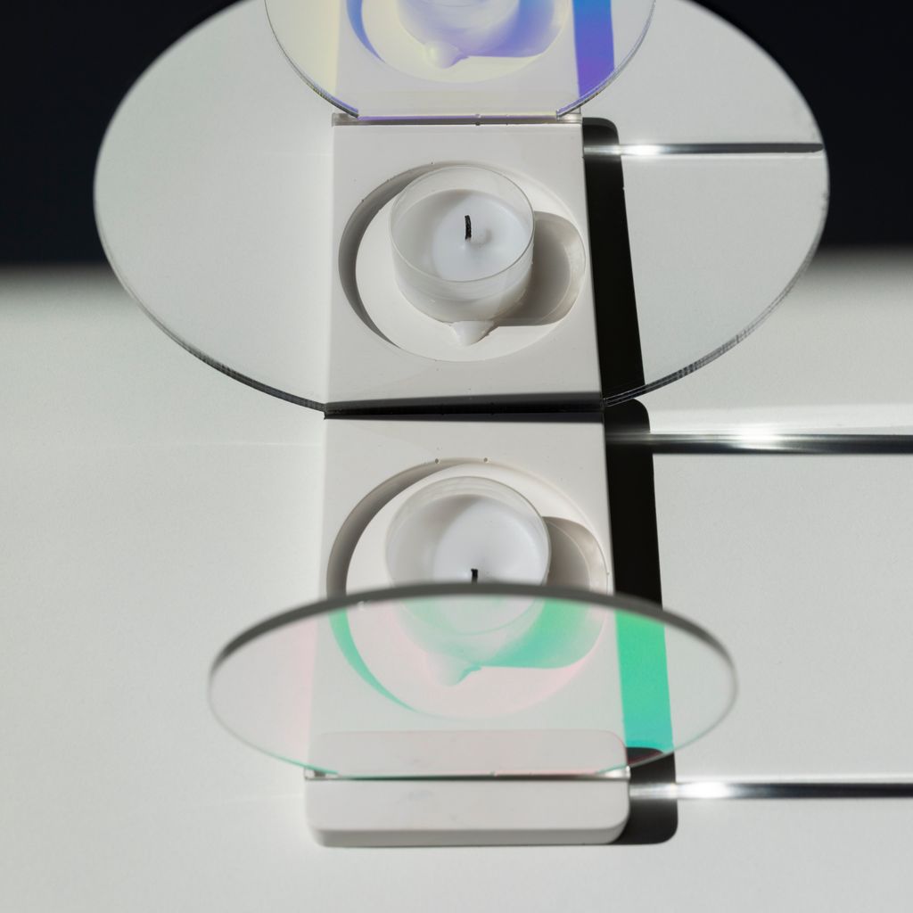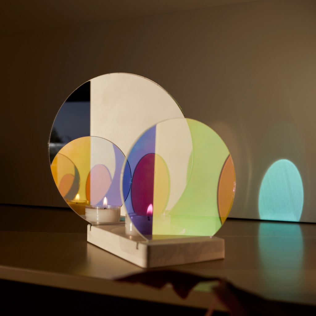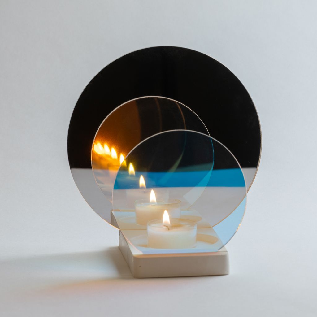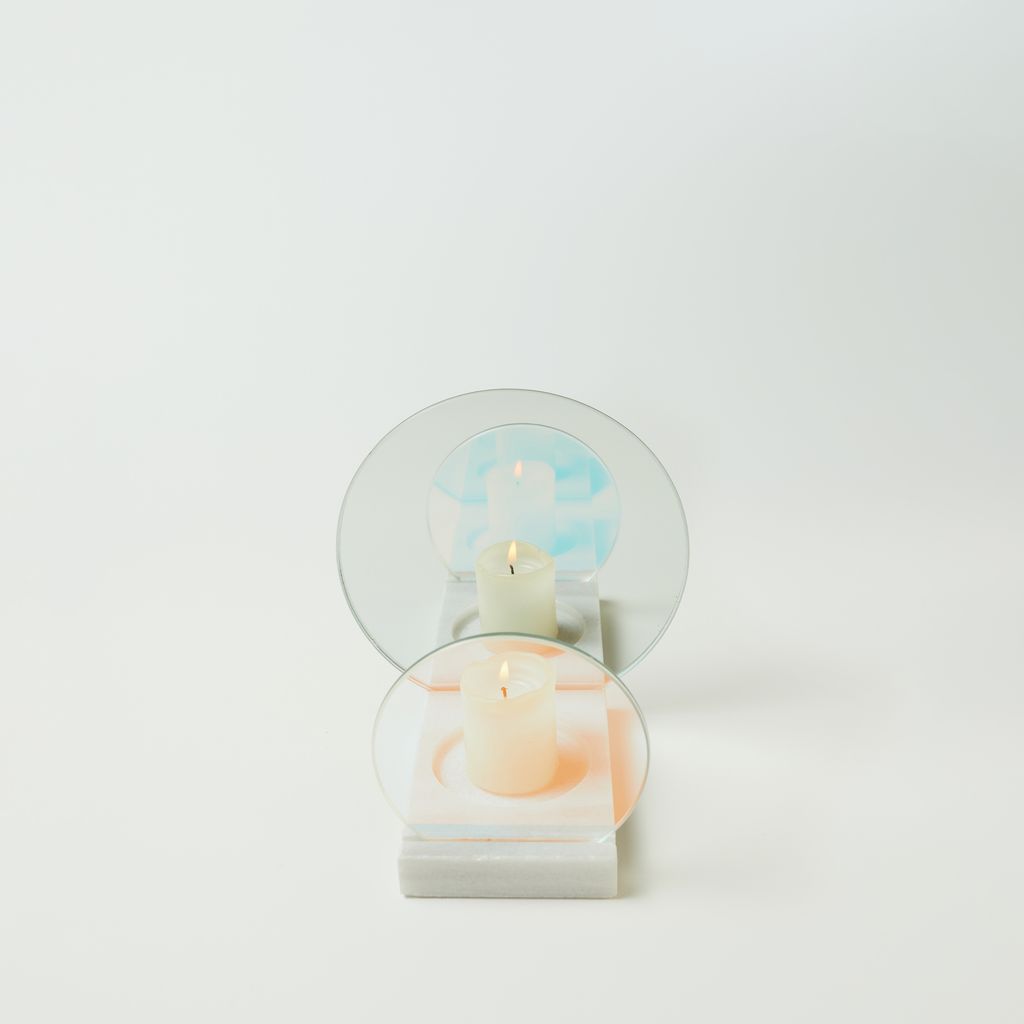 Its dichroic glass disks create a mesmerizing dance of color, light, and infinitely mirrored flames that shift with every viewpoint. Resting on a marble base, it is designed for tealights. The piece transforms ordinary candlelight into a spectrum of reflections and shadows.